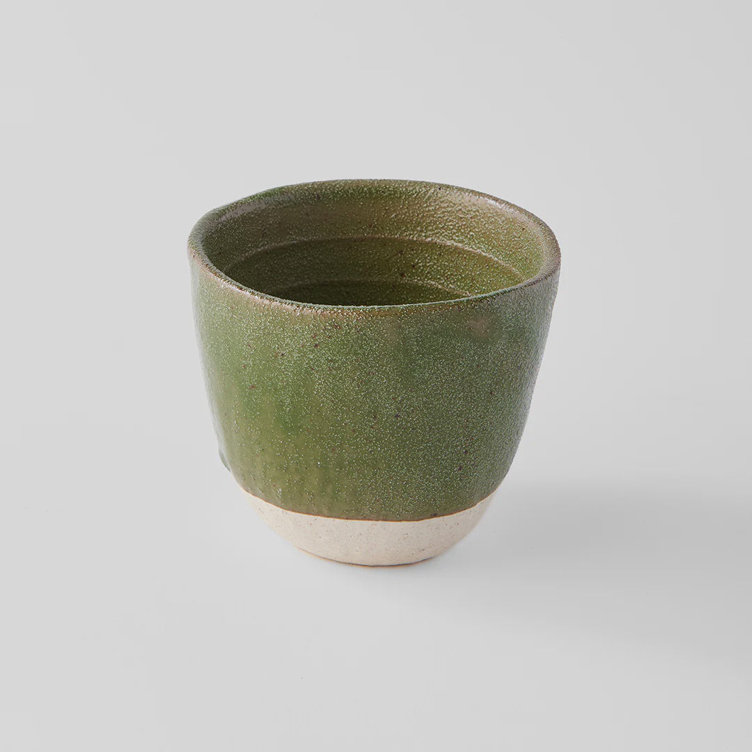 Lopsided tea mug in Matcha Green. Featuring a textured matcha green glaze in a lopsided shape. Made of 'Minoyaki' porcelain, fired at a high temperature and hand finished at a long-standing family run kiln in Japan.