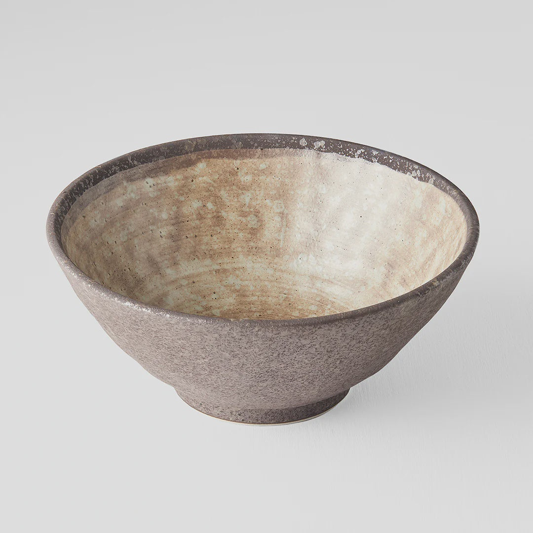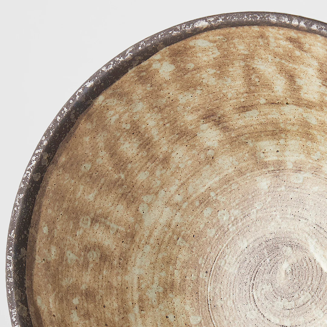 Udon Bowl in Nin-Rin glaze. The Nin-Rin range features a circular sweep of golden ochre over the signature 'Earth' glaze. No two pieces are the same due to a unique hand glazing technique used to create the swirling pattern.