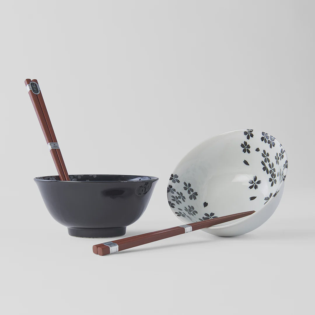 This boxed set features a silver Sakura blossom motif on black gloss glaze and black Sakura blossom motif on white gloss glaze. The cherry blossom is a special flower for the people of Japan representing renewal and the ephemeral nature of life.