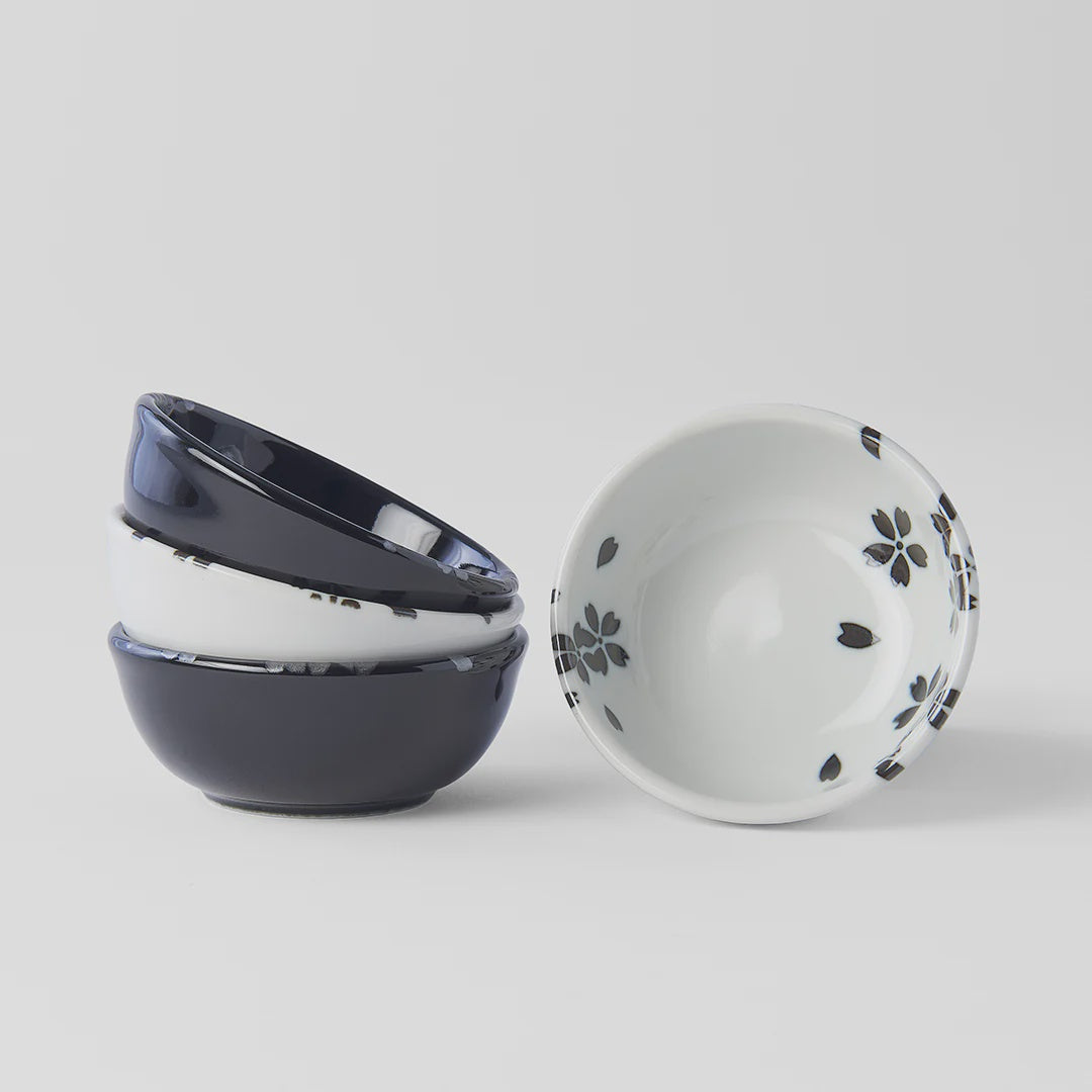 This boxed set features a silver Sakura blossom motif on black gloss glaze and black Sakura blossom motif on white gloss glaze. The cherry blossom is a special flower for the people of Japan representing renewal and the ephemeral nature of life.