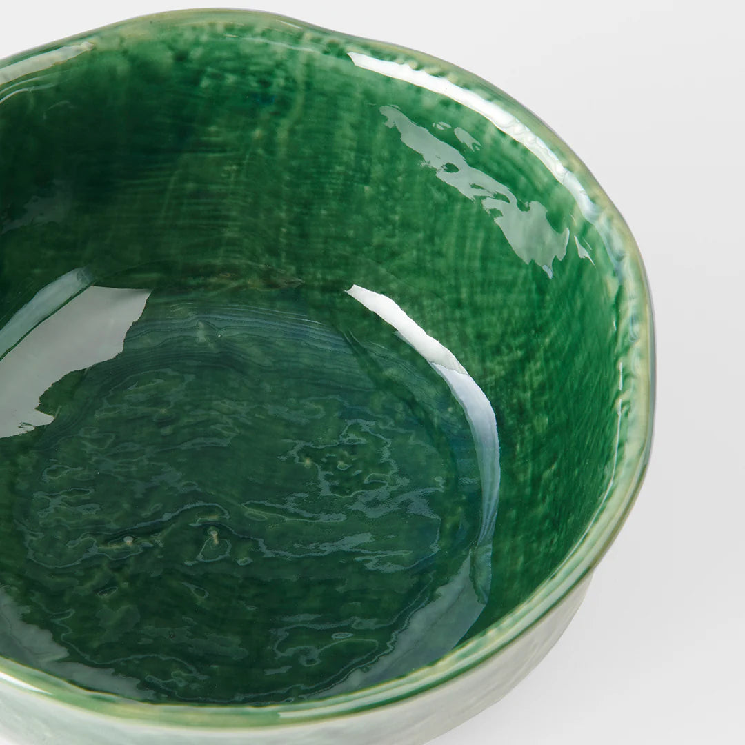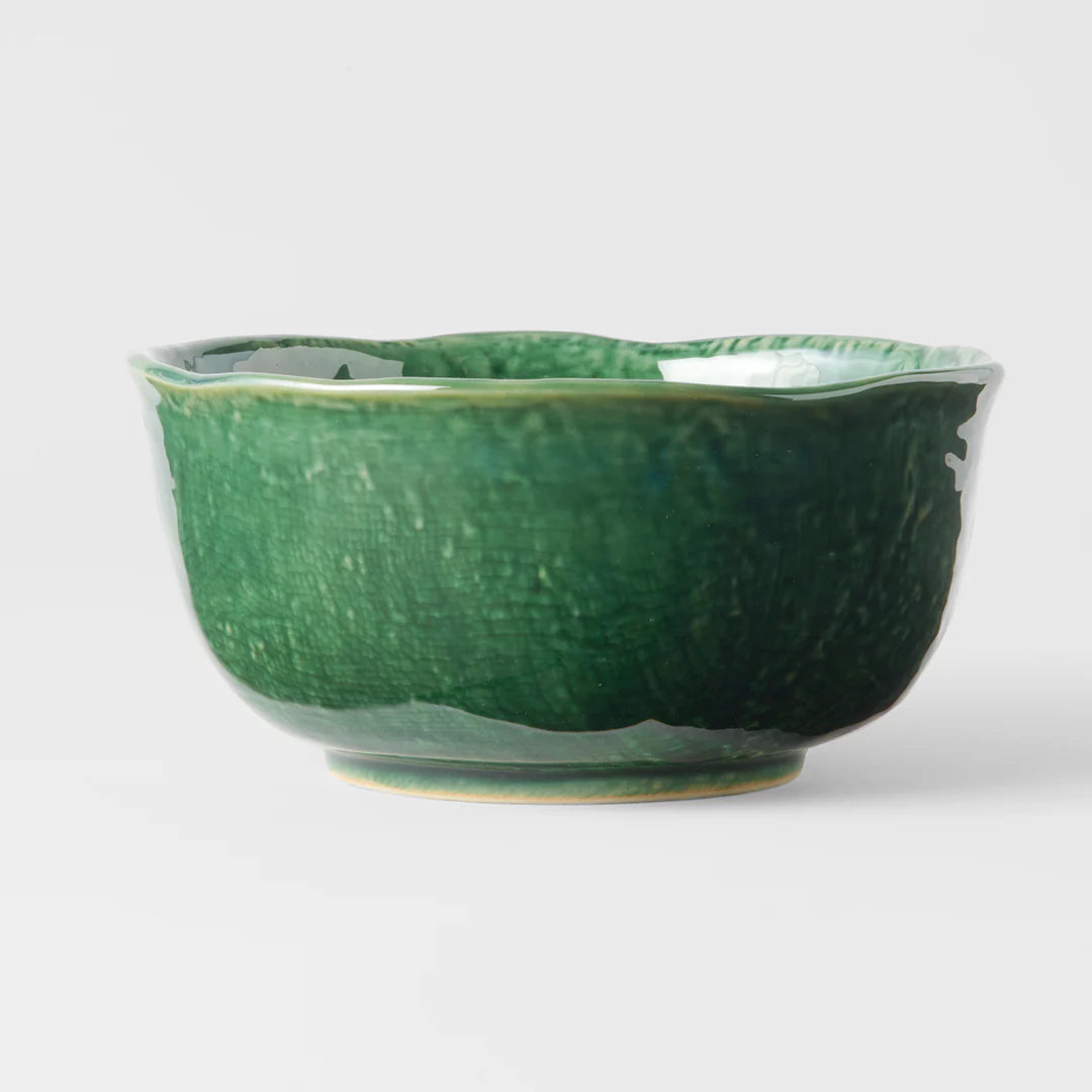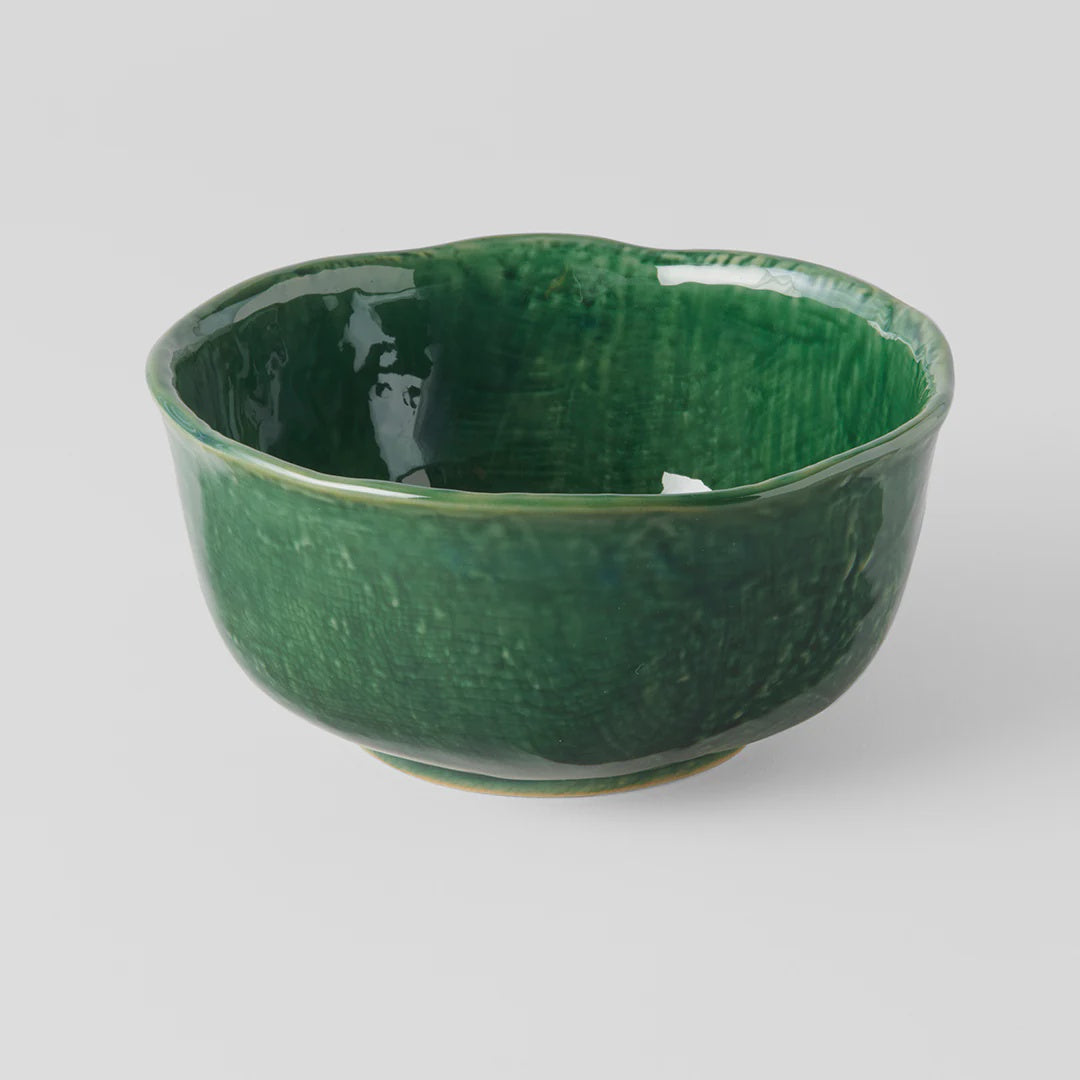 Round uneven bowl in oribe green glaze, featuring an organic, textured shape with a strong forest green glaze. Made of 'Minoyaki' porcelain, fired at a high temperature and hand finished in Japan.