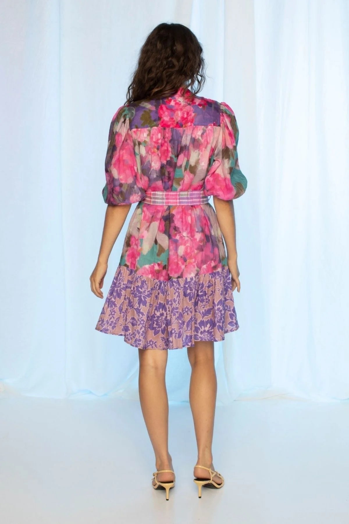 This mini dress features a high neckline with a button-down front, a slim belt to cinch the waist, and playful puffed 3/4 sleeves. The frilled hem adds a fun, flirty touch, making it the perfect blend of playful and chic.