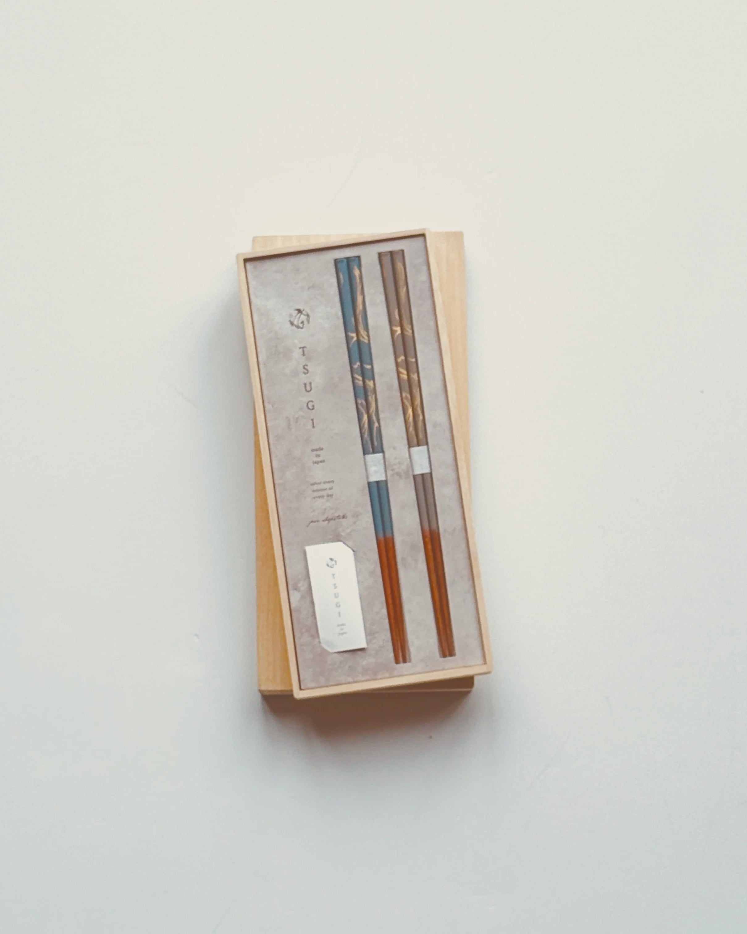 Presented in a paulownia wood box with a foil-stamped logo, this gift set features two pairs of "TSUGI" natural wood chopsticks inspired by the Japanese kintsugi technique, which mends ceramics with gold to highlight their flaws. Their sleek, refined shape and radiant gold seam elegantly enhance the feel in your hands. Crafted from natural wood, the chopsticks include non-slip tips and are dishwasher safe for practical use.