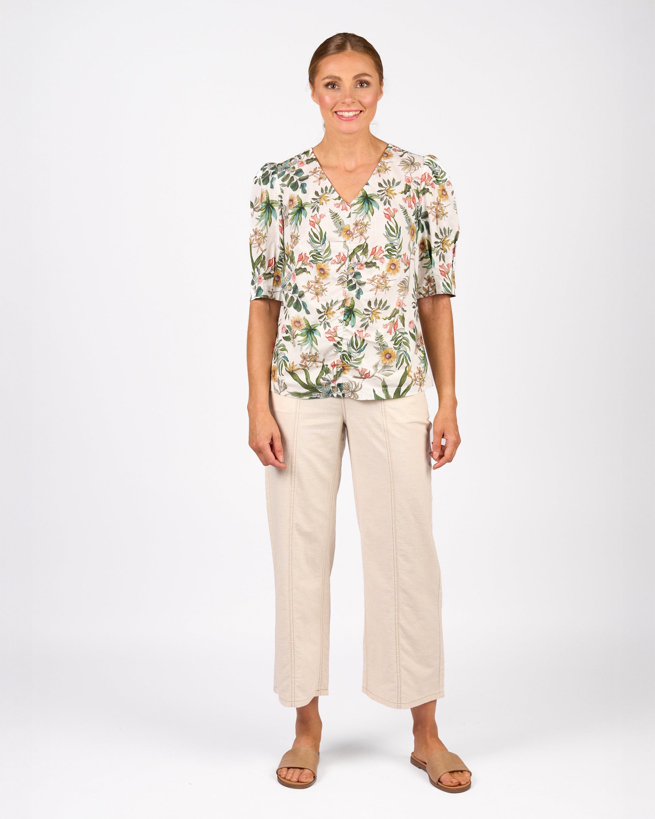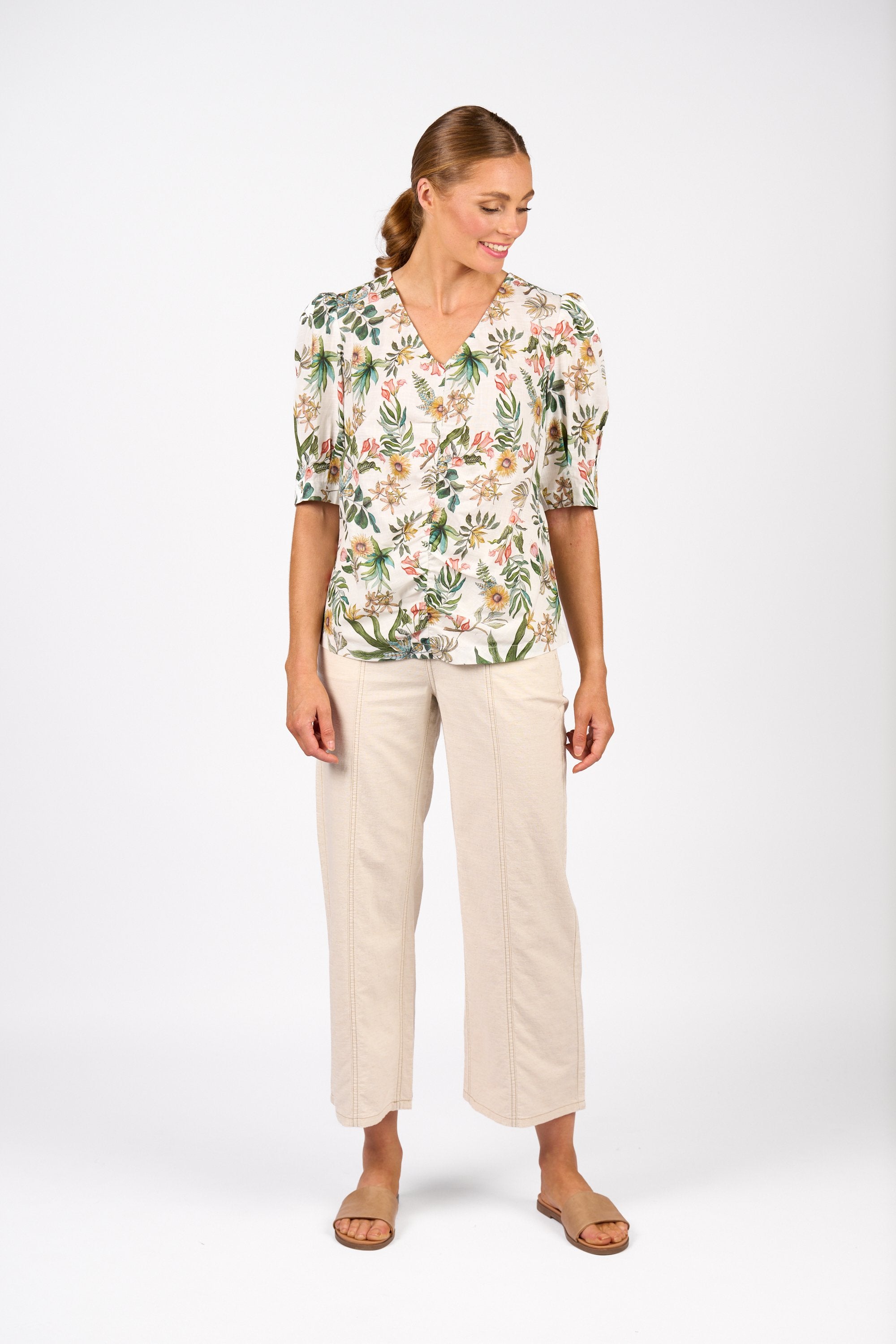 The Fizz Top in Wild print is made from lightweight cotton with a linen look, featuring a flattering V-neckline and a gathered centre front seam for subtle texture. Puff sleeves with gathered shoulders and pleated cuffs add a feminine touch, while side seam splits and a relaxed fit keep it comfortable and easy to wear.