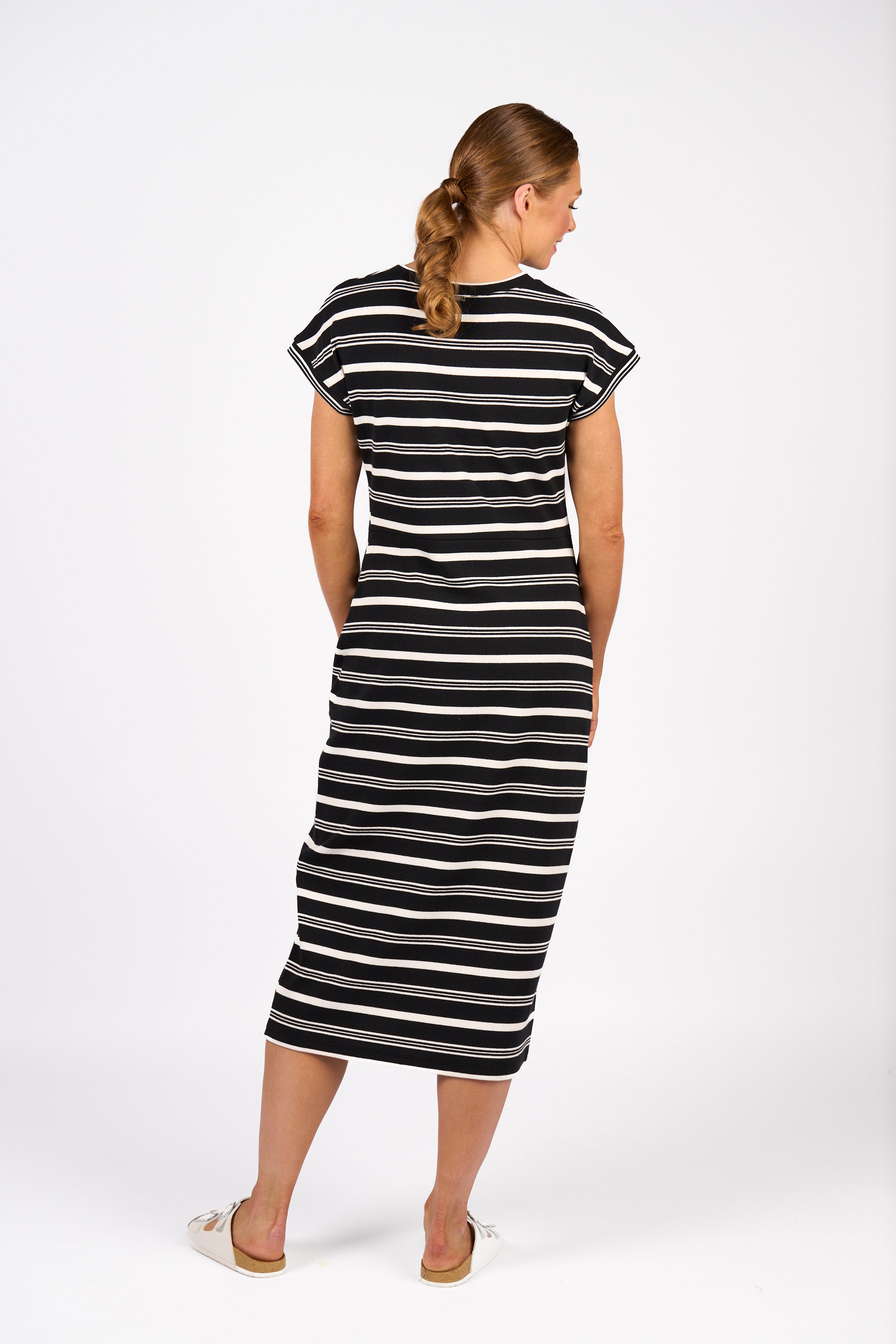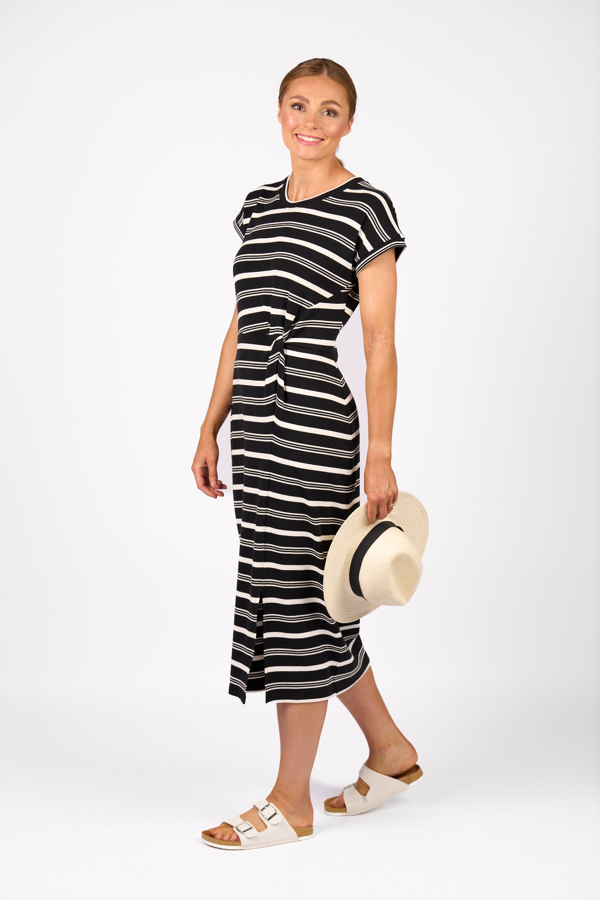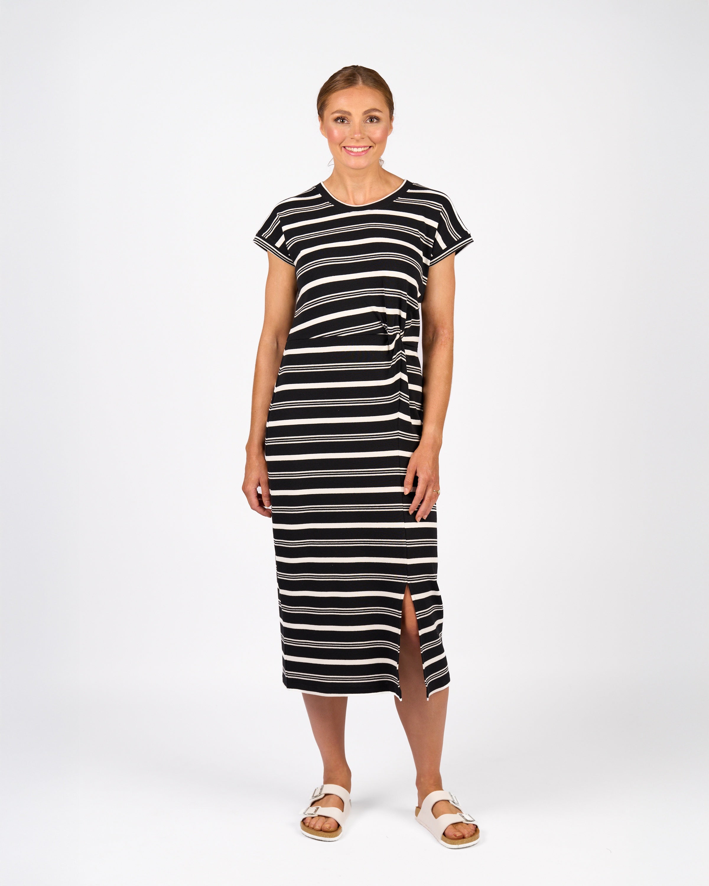 The Parker Dress is made from soft stretch cotton knit fabric and features a drop shoulder with short sleeves and a twist detail at the waist. With a wide fit through the chest and a shaped waist and hips, it offers a flattering silhouette and a side front split for ease of movement, making it ideal for relaxed yet polished looks.