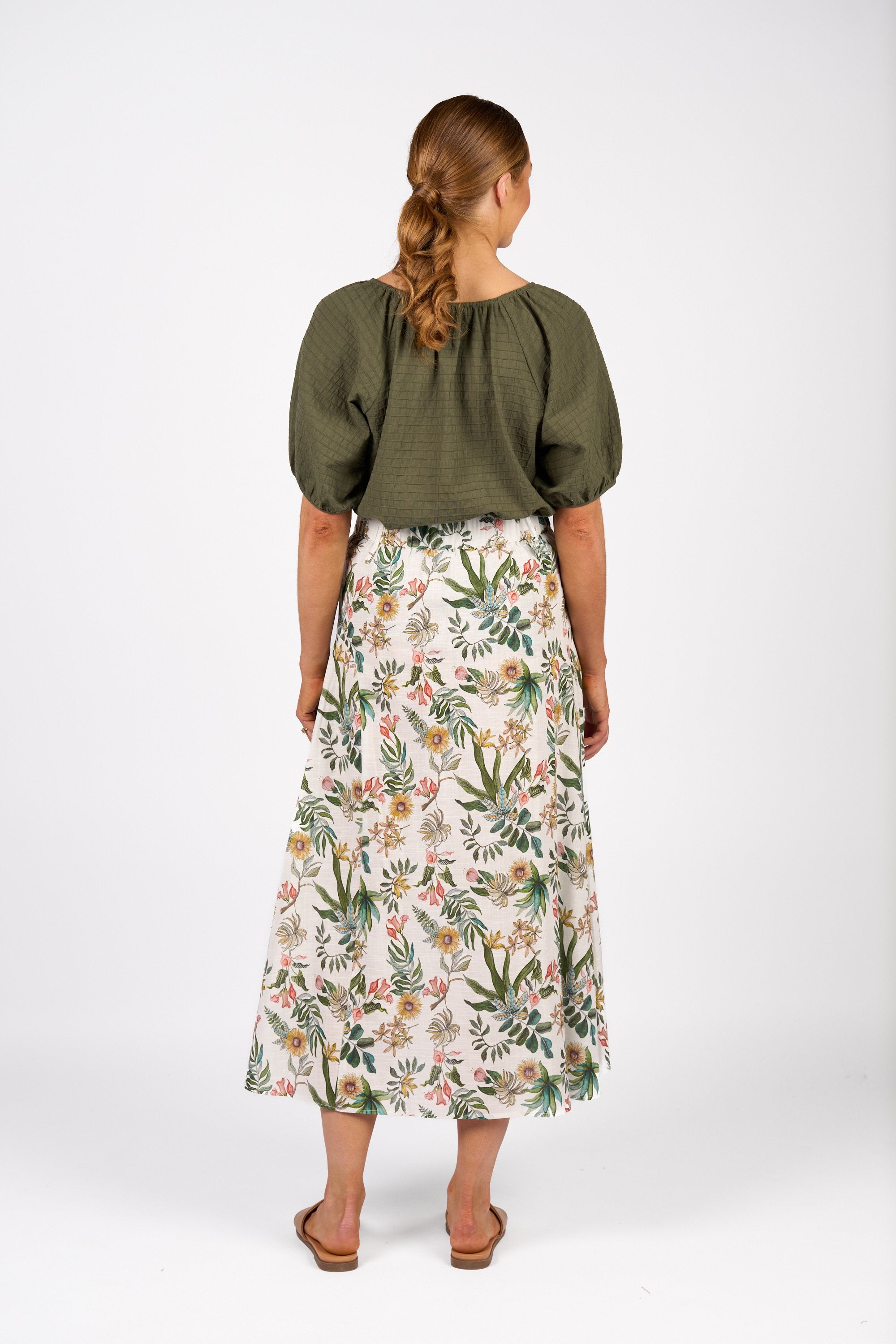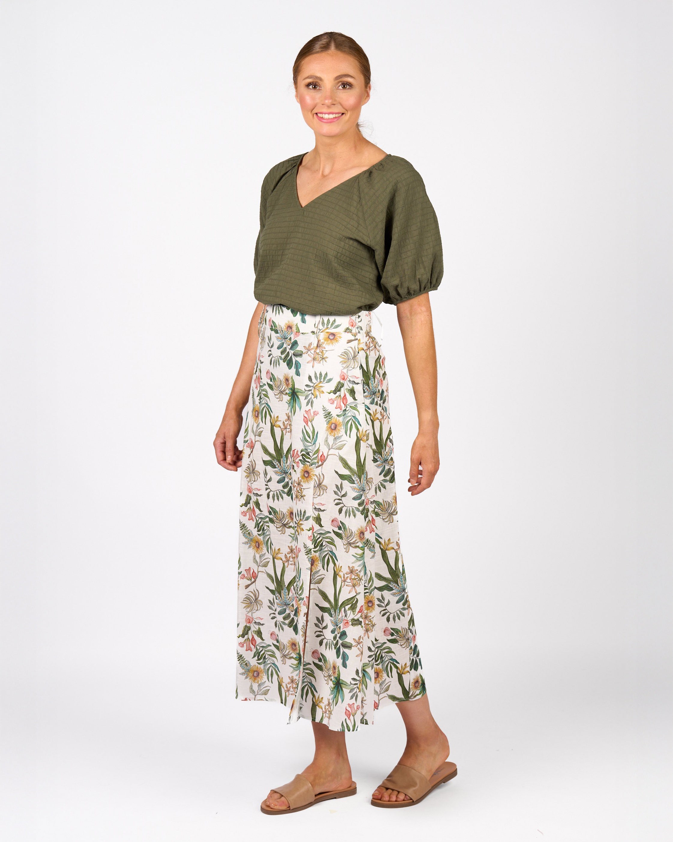 The Tempo Skirt is made from a 100% cotton fabric with a linen look, giving it a soft, breathable feel. It features two front seam splits and a flat front waistband with an elasticated back, making it an easy, polished option for warm days.