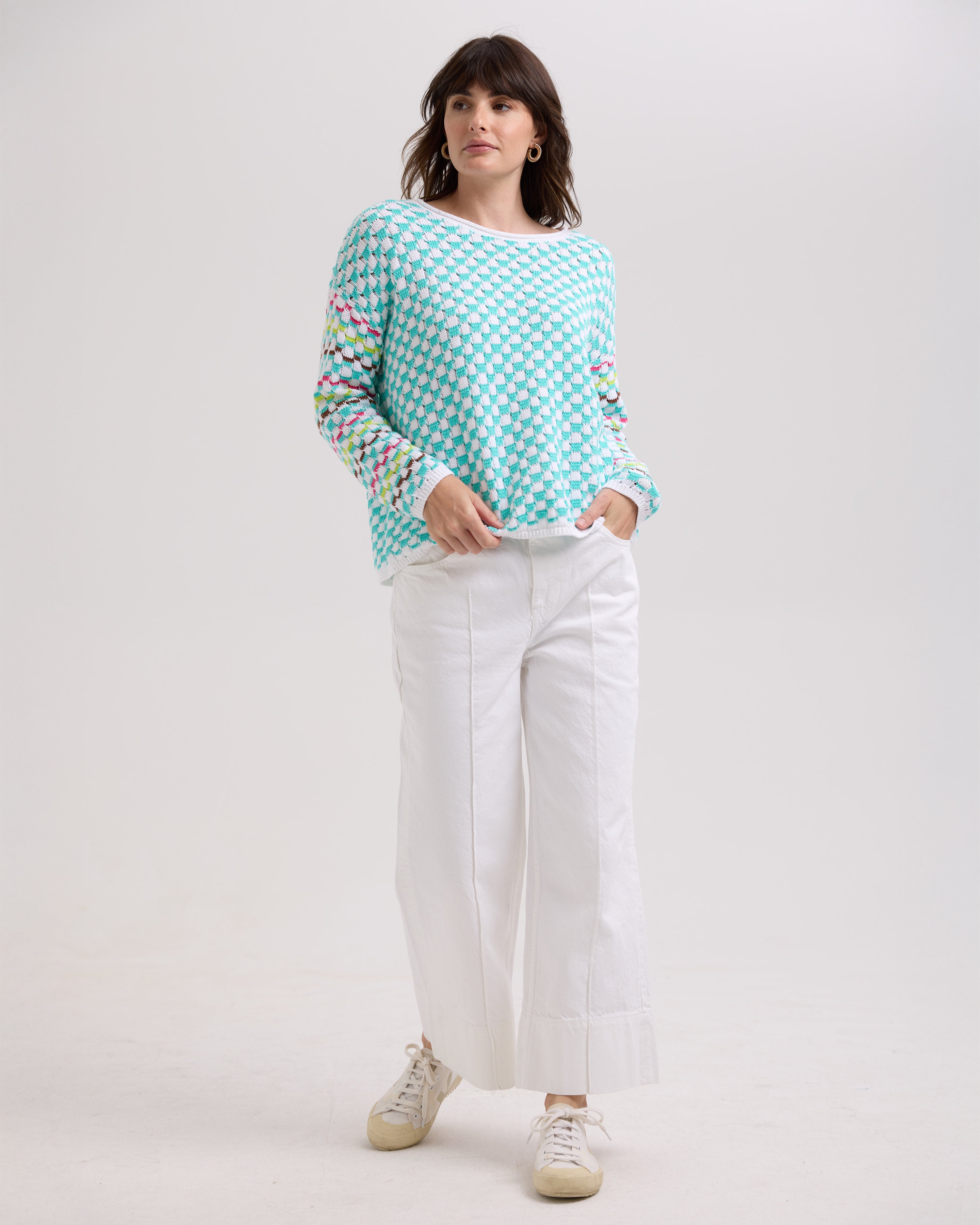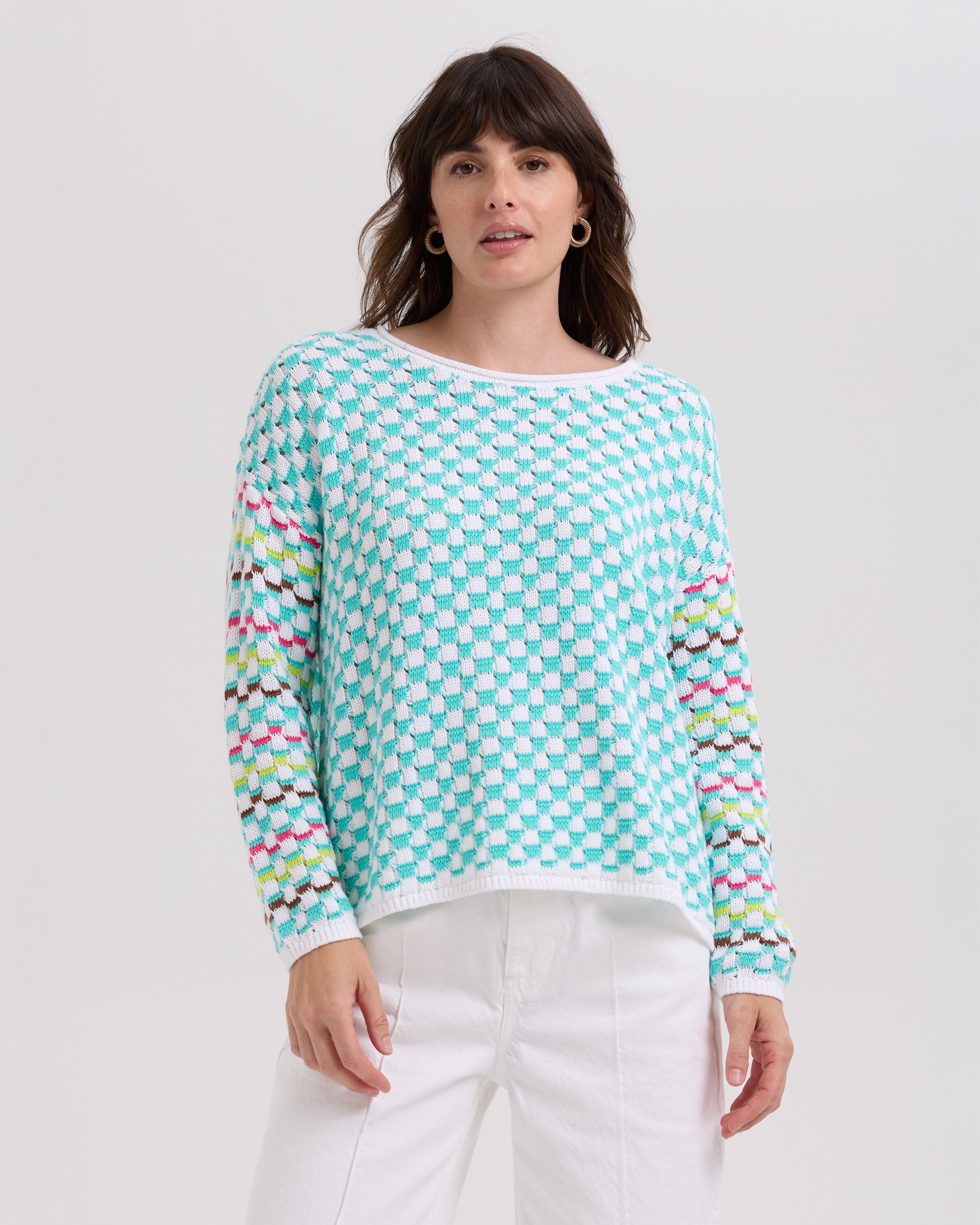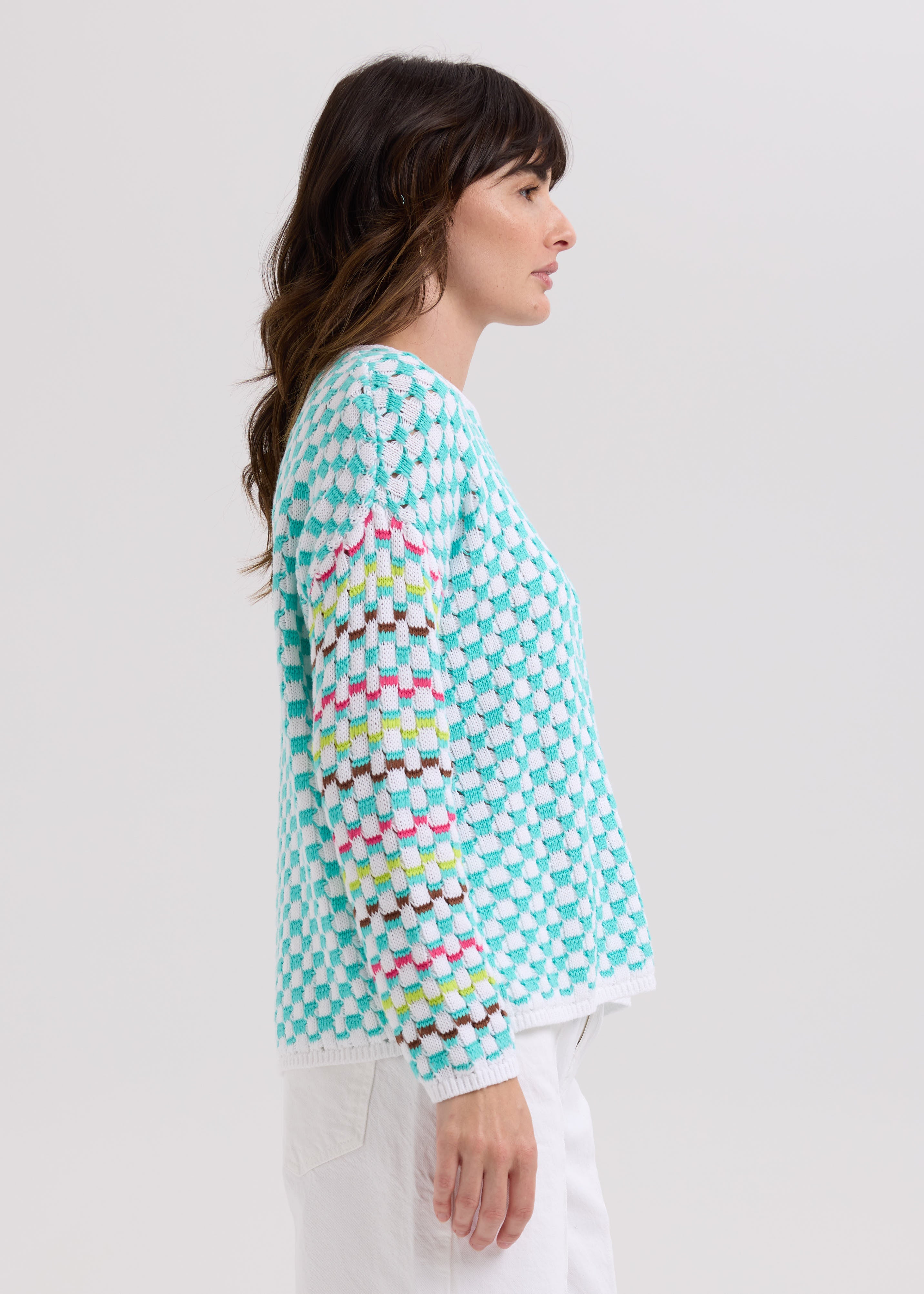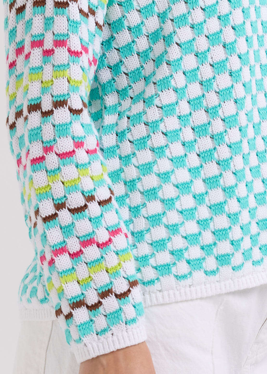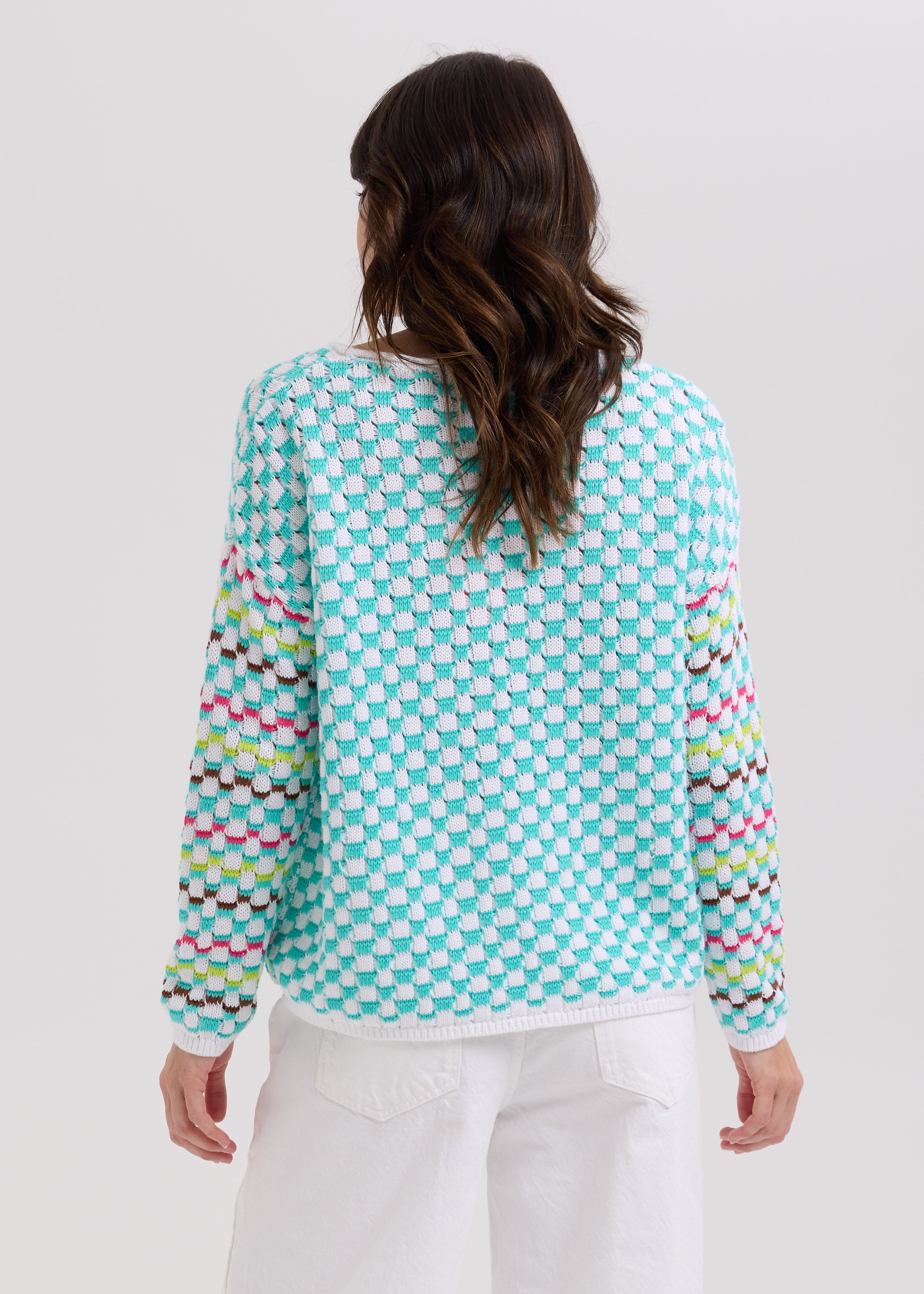 This Checked Jumper in White features a unique textured knit with vibrant colors woven through the sleeves, adding a distinctive touch to your wardrobe. The plain-colored banding and ribbing provide a clean, polished finish, making it both stylish and comfortable for everyday wear. Elevate your casual look with this eye-catching, cozy jumper.