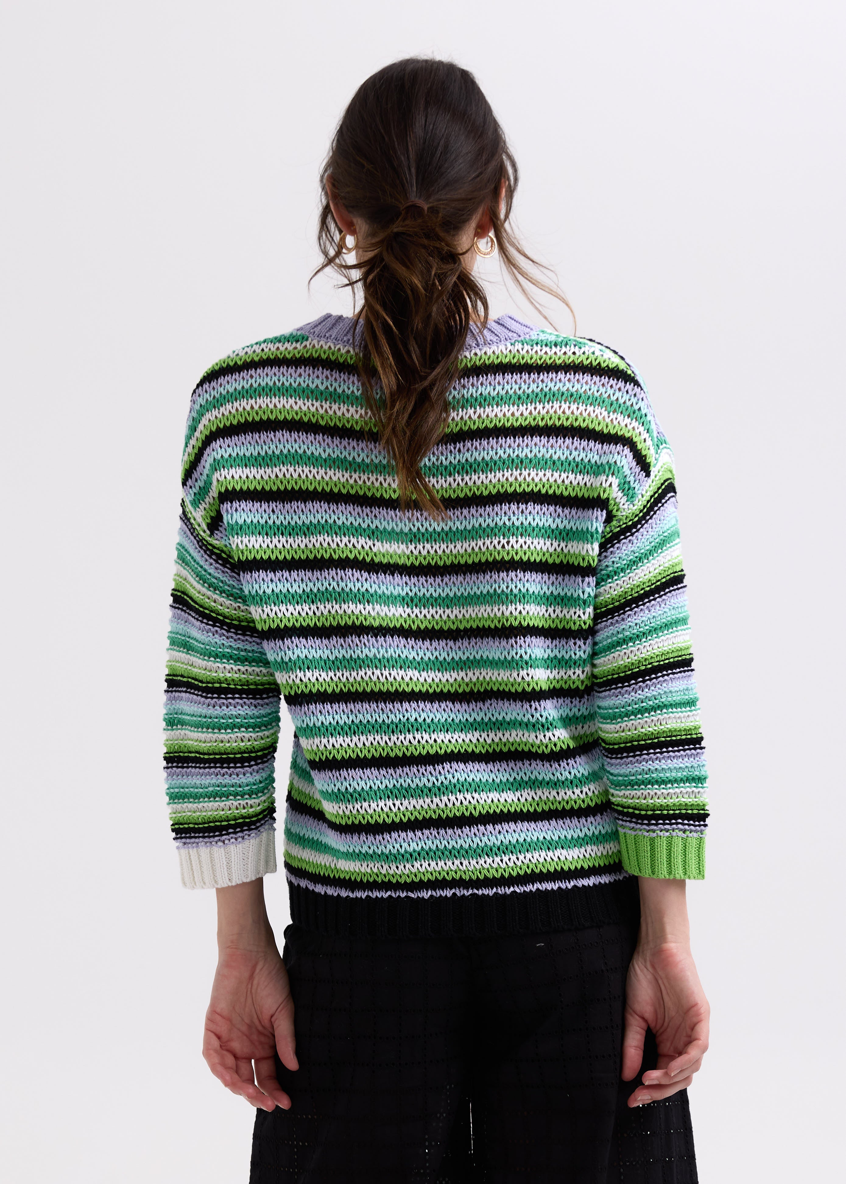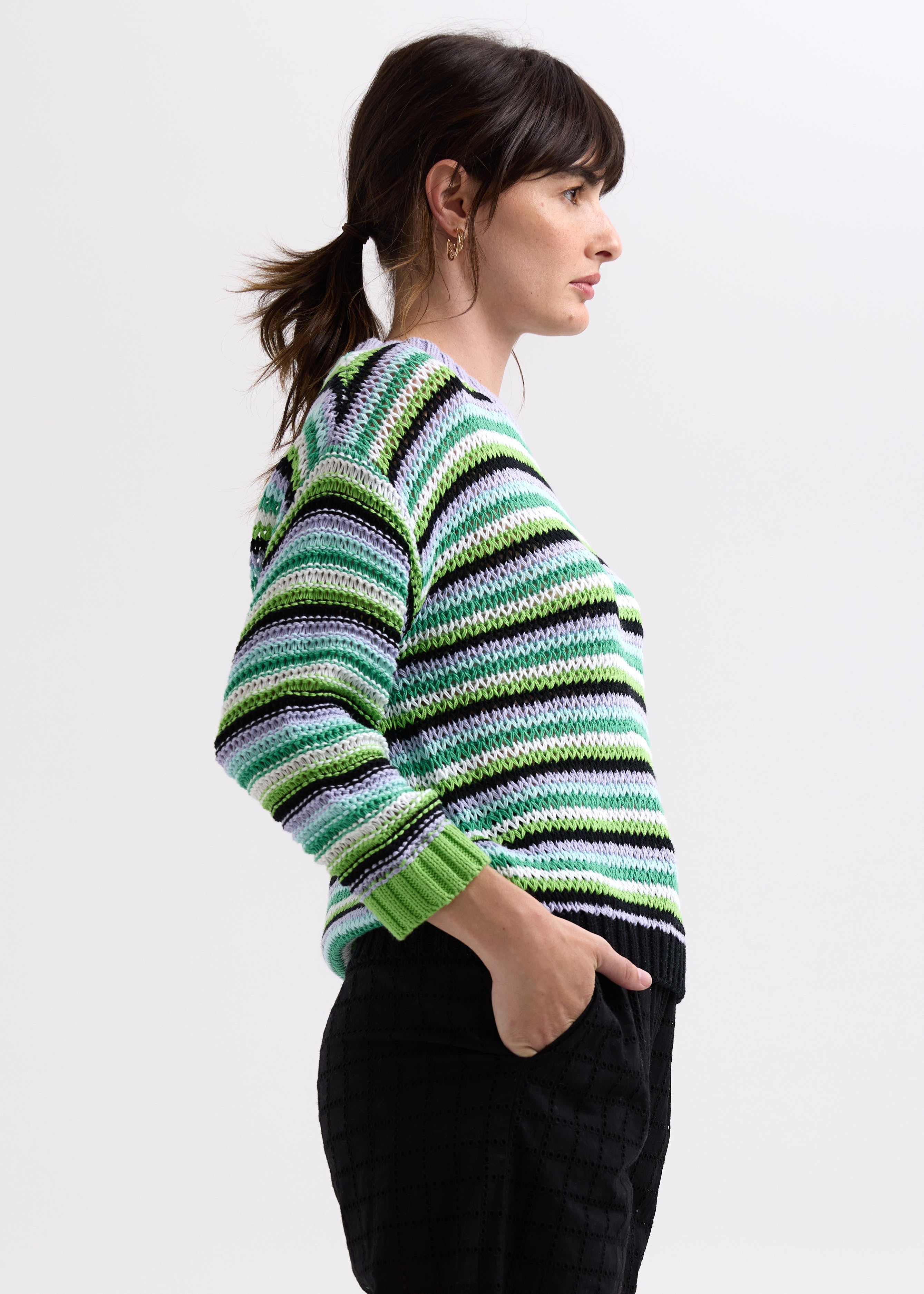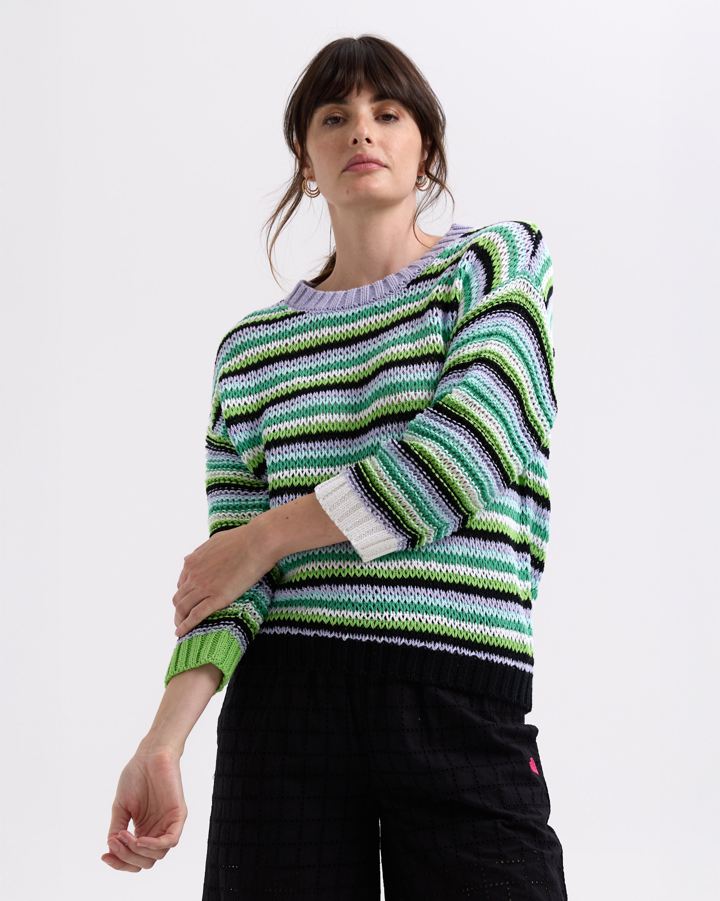 The Zaket & Plover Chunky Stripe Jumper offers a relaxed fit with colourful contrast stripe, available in two new season colourways. Featuring a dropped shoulders and cropped sleeve length, this style has an open knit design, adding a a beautiful soft texture to your everyday outfits.