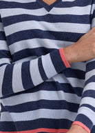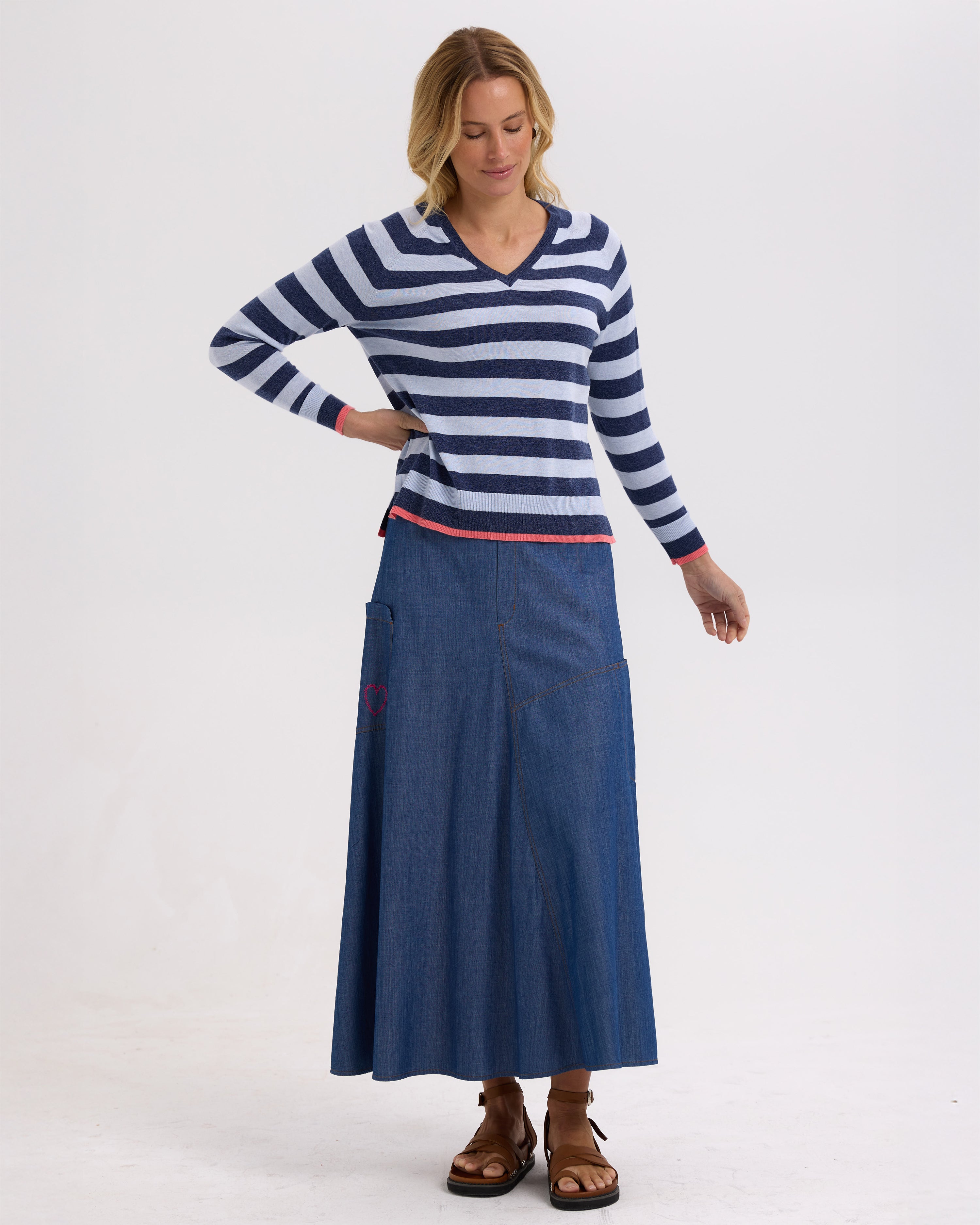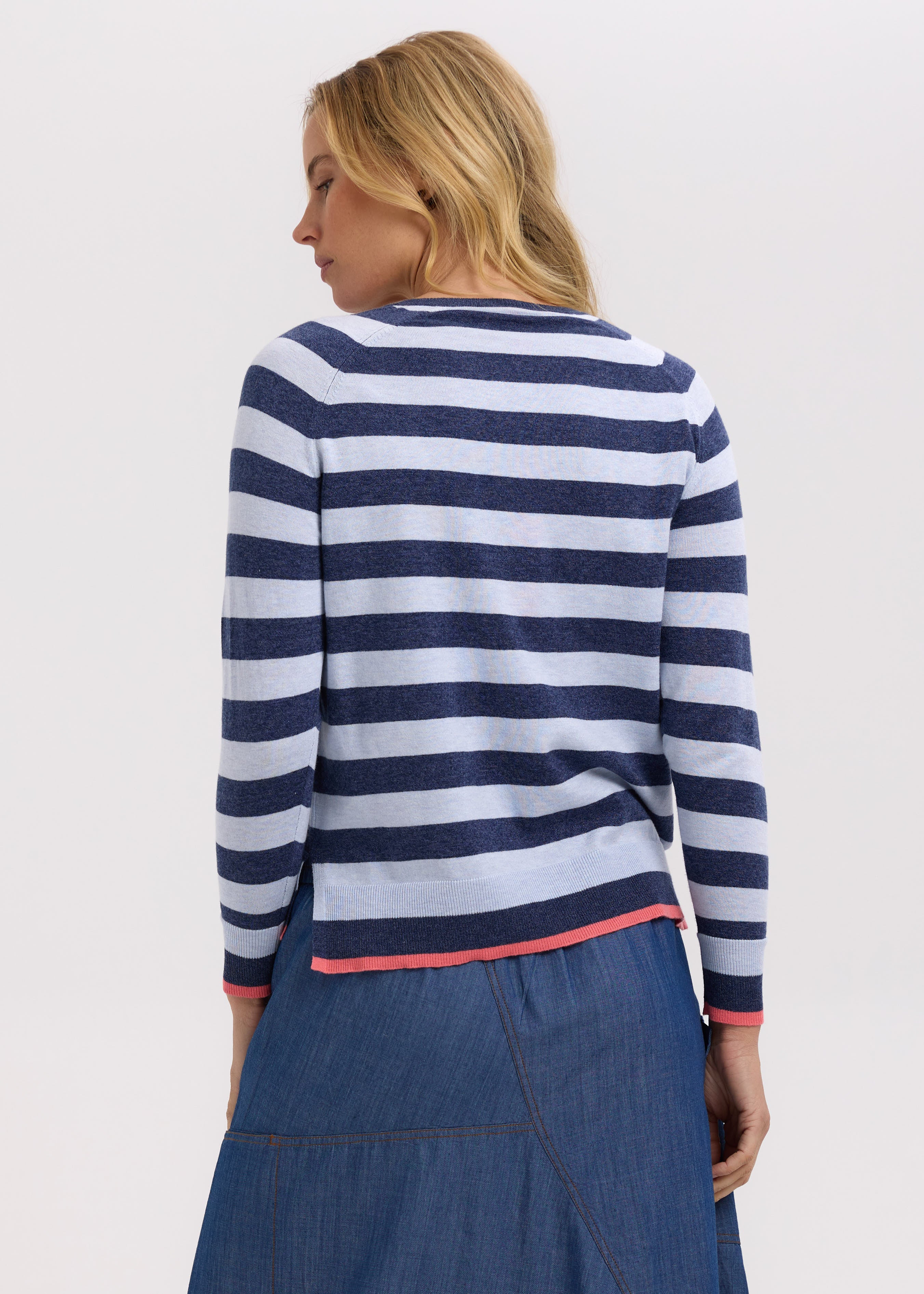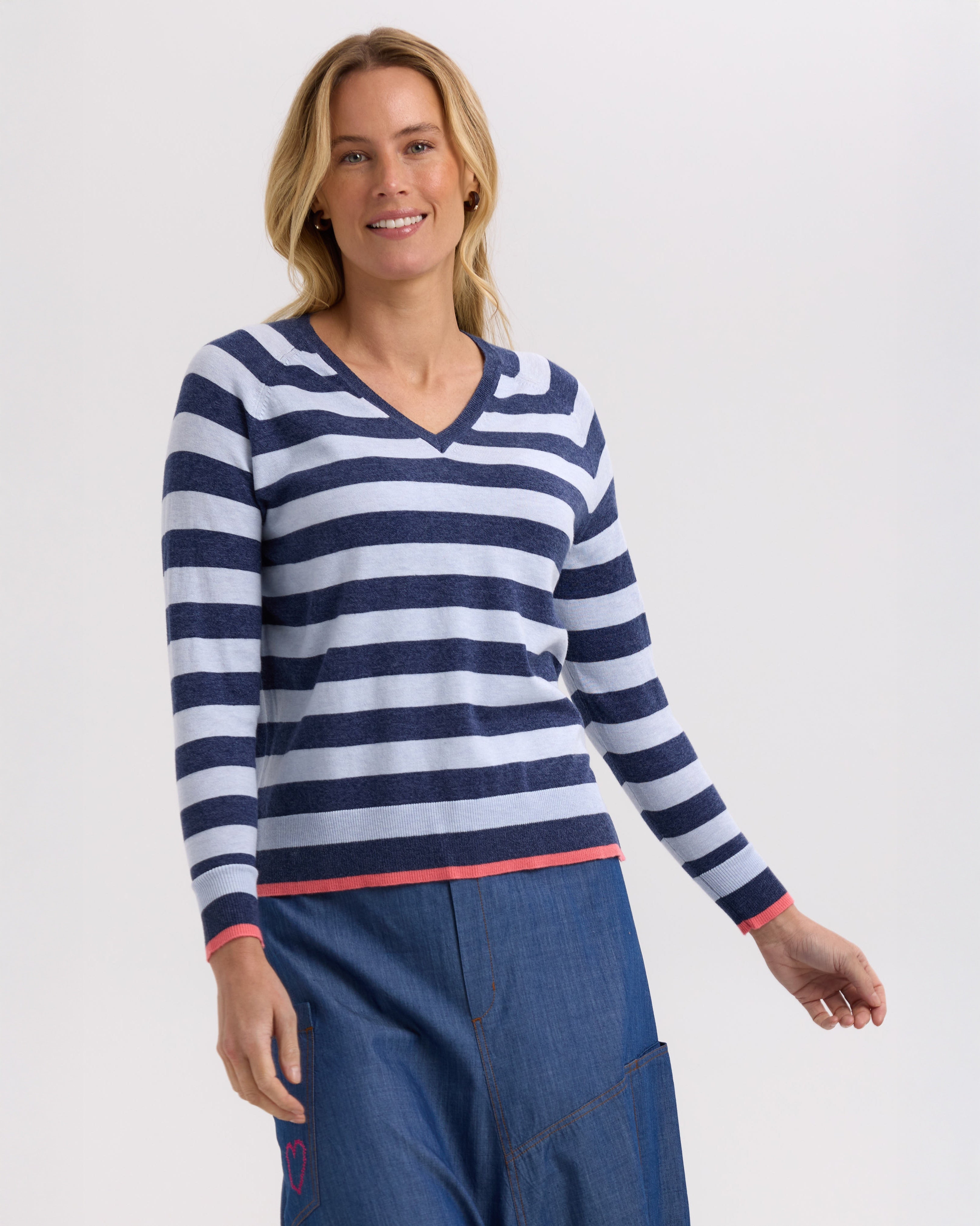 A crowd favourite, flattering and fun stripes adorn this loosely structured V neck knit, which fits neatly on the body. Delicate ribbing details make this piece perfect for almost any occasion. This piece is designed to compliment your wardrobe and be worn with love. The cotton cashmere blend makes this piece soft to the touch and comfy to wear.