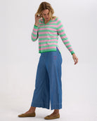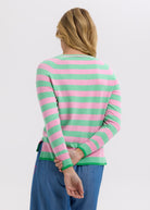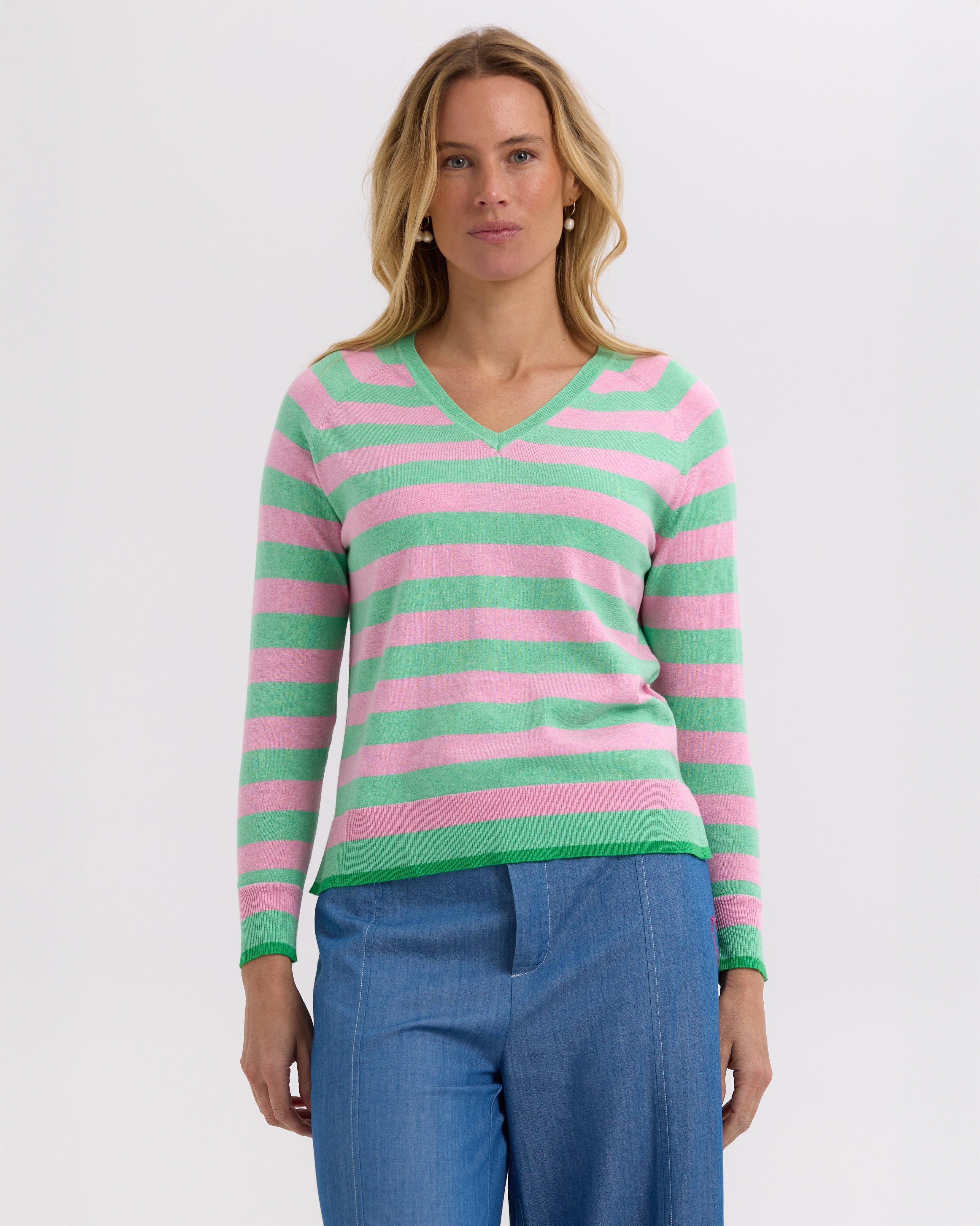 A crowd favourite, flattering and fun stripes adorn this loosely structured V neck knit, which fits neatly on the body. Delicate ribbing details make this piece perfect for almost any occasion. This piece is designed to compliment your wardrobe and be worn with love. The cotton cashmere blend makes this piece soft to the touch and comfy to wear.