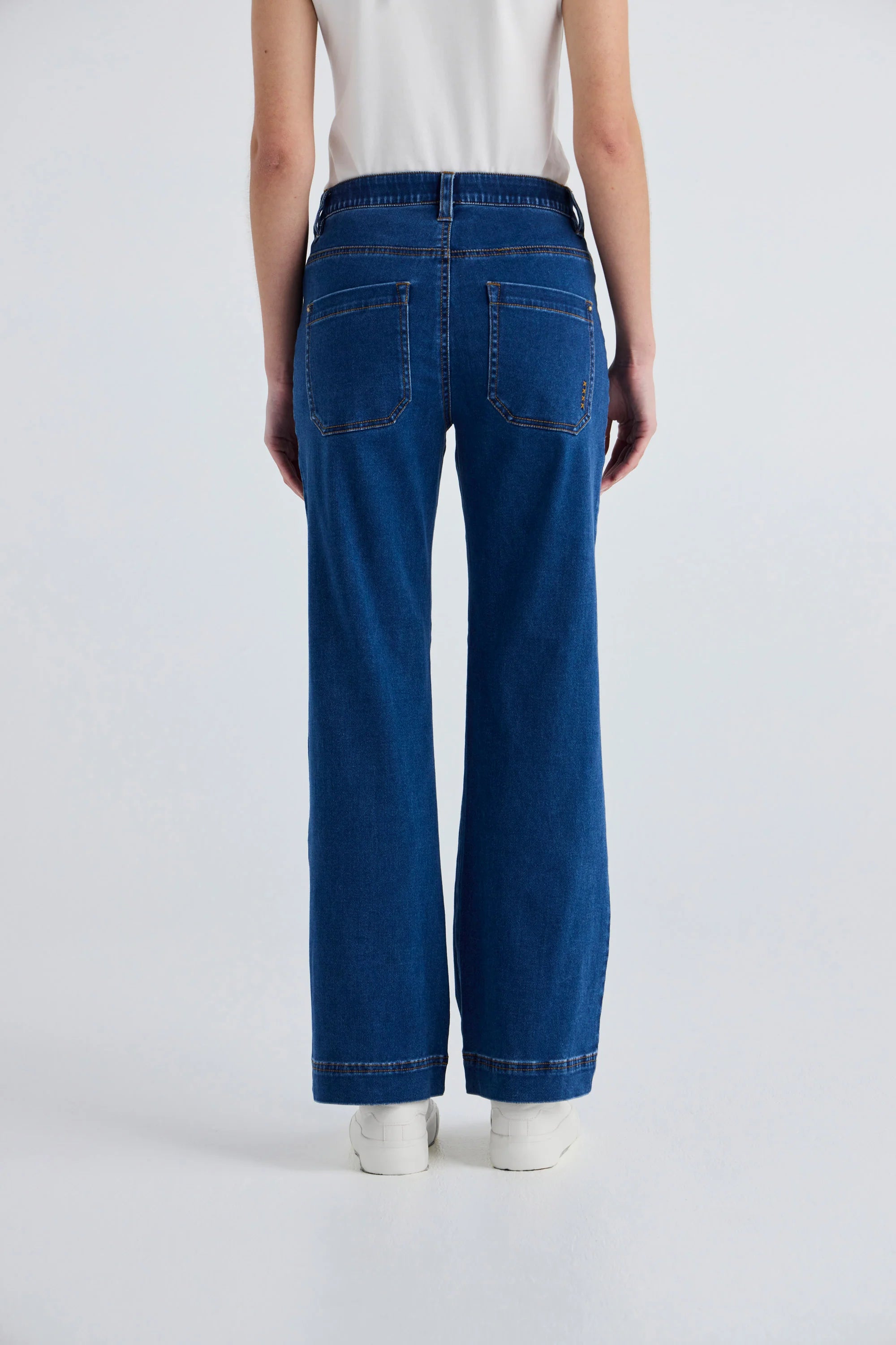 The Chrome Jean offers a wide-leg silhouette crafted from the softest stretch denim for unmatched comfort and style. Featuring front patch pockets adorned with cross-stitch embroidery. The deep hems allow for a lovely drape, making these jeans a wardrobe essential.