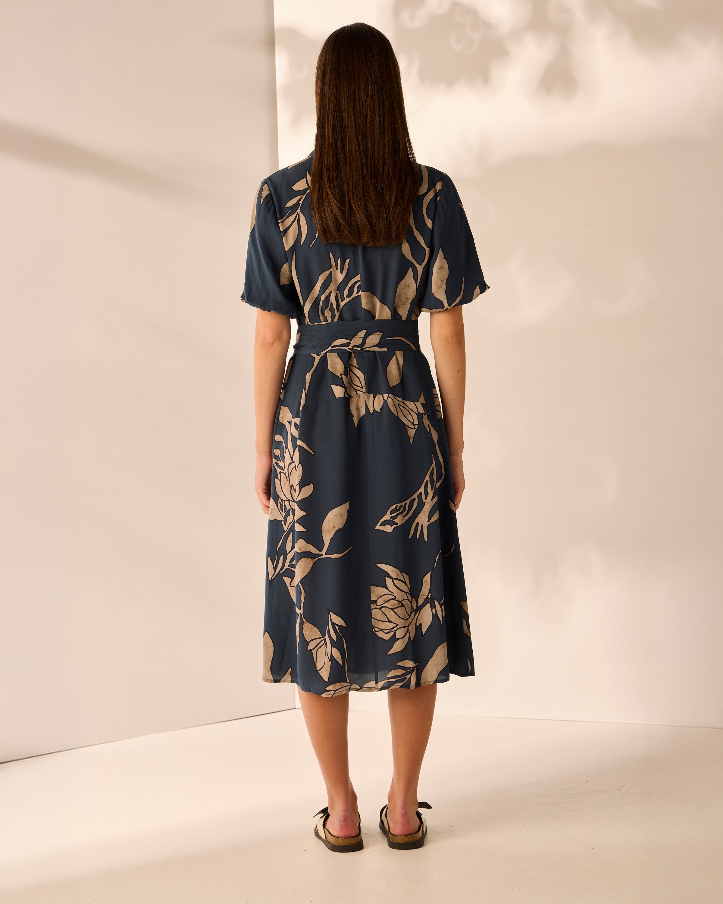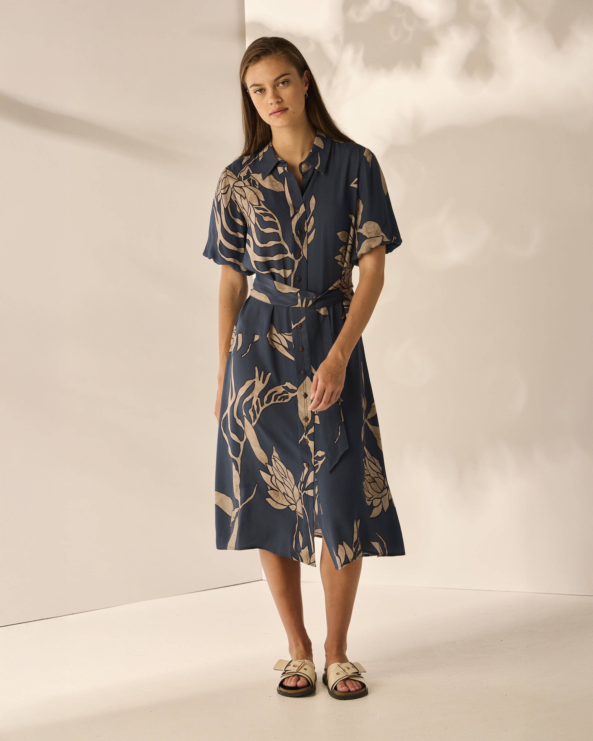 The Chino Dress is a sophisticated design that showcases a graceful and intricate floral print. Its key elements are a front buttoned dress adorned with wooden buttons, seam across the hip and a tie belt to cinch in the silhouette.