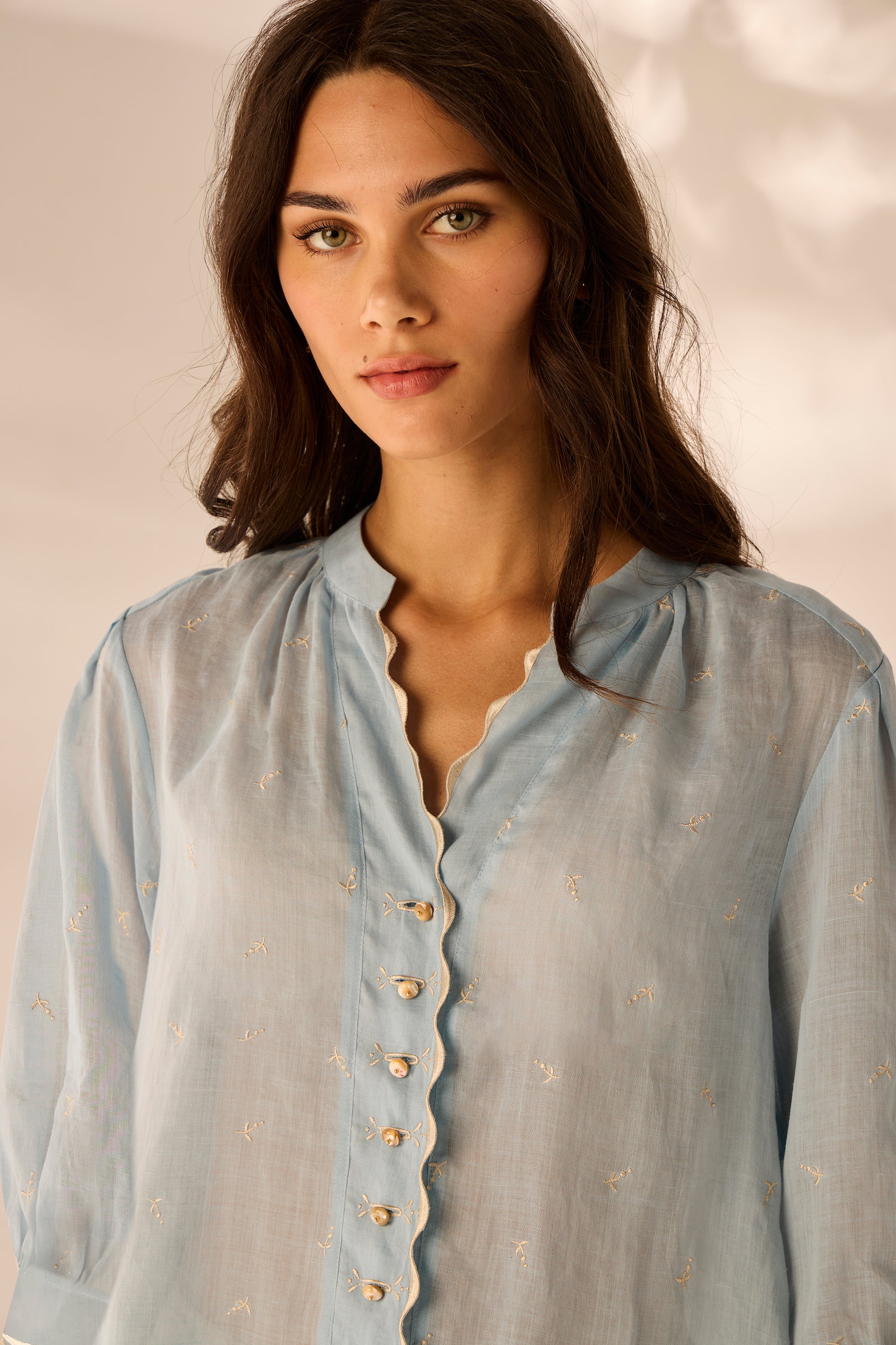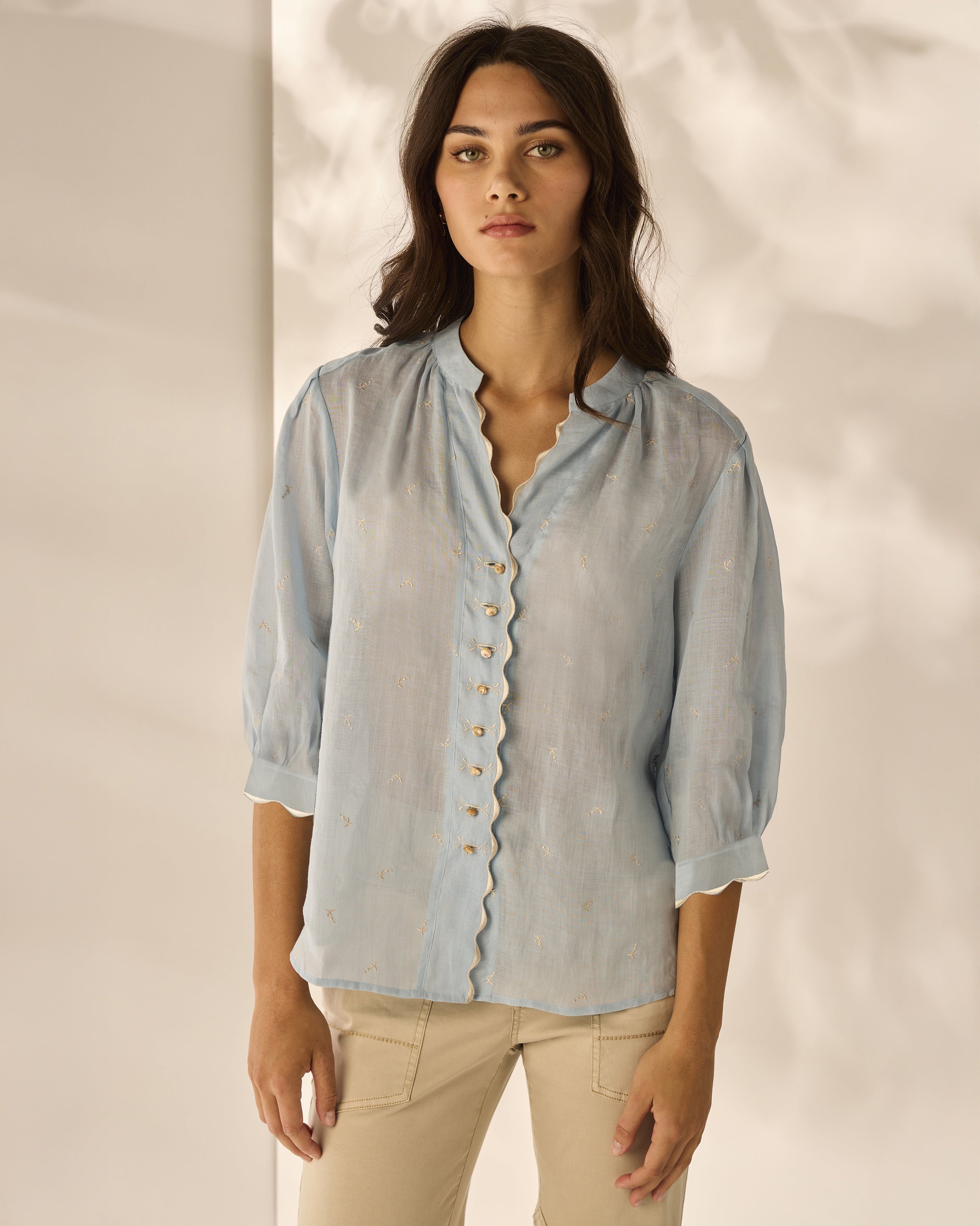An embroidered Ramie fabrication takes form in a relaxed fit shirt. The soft gathered neckline, glass/ natural round buttons and scallop embroidery border down the centre front placket and cuff all contribute to the refined femininity of this style.