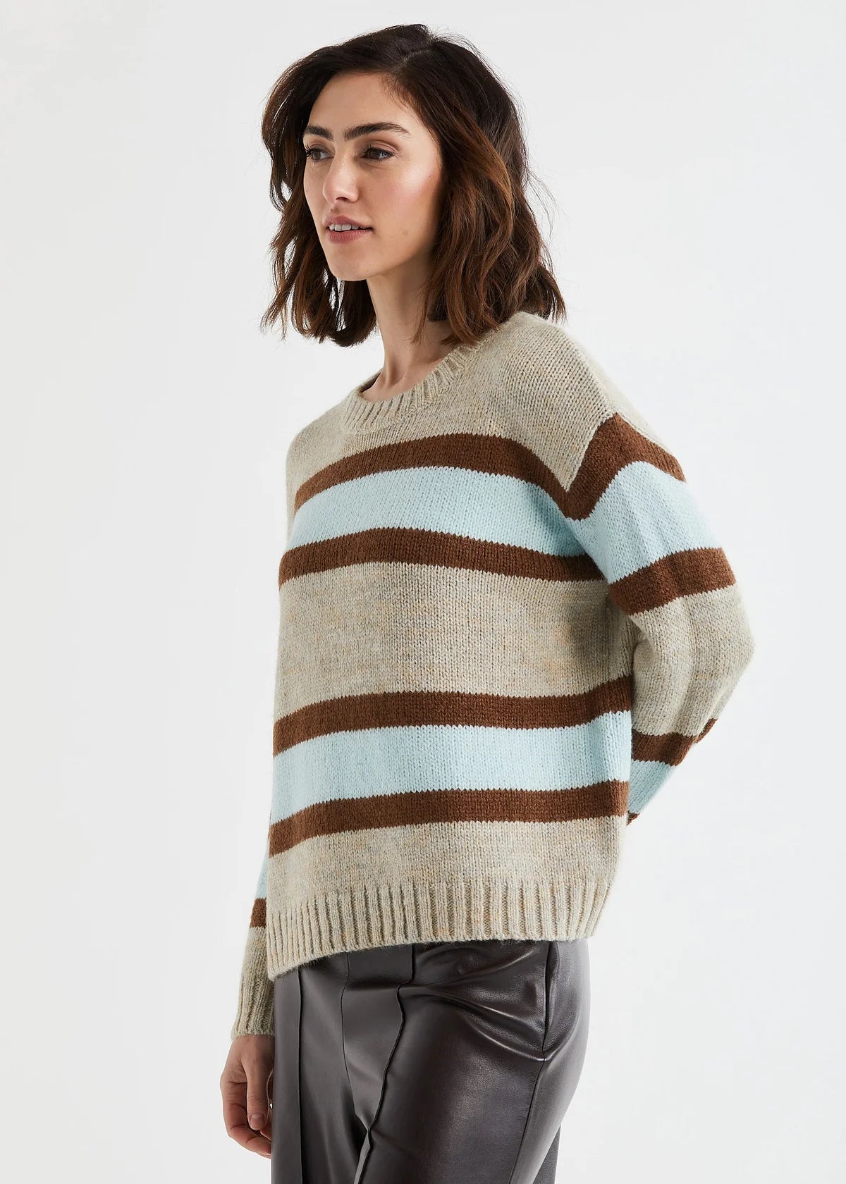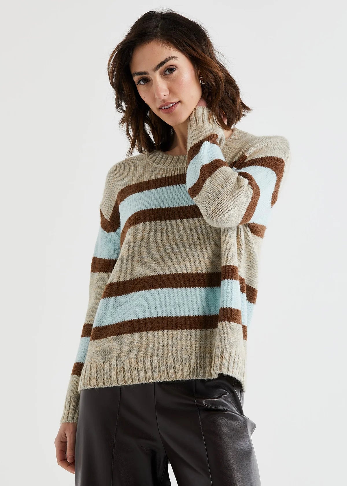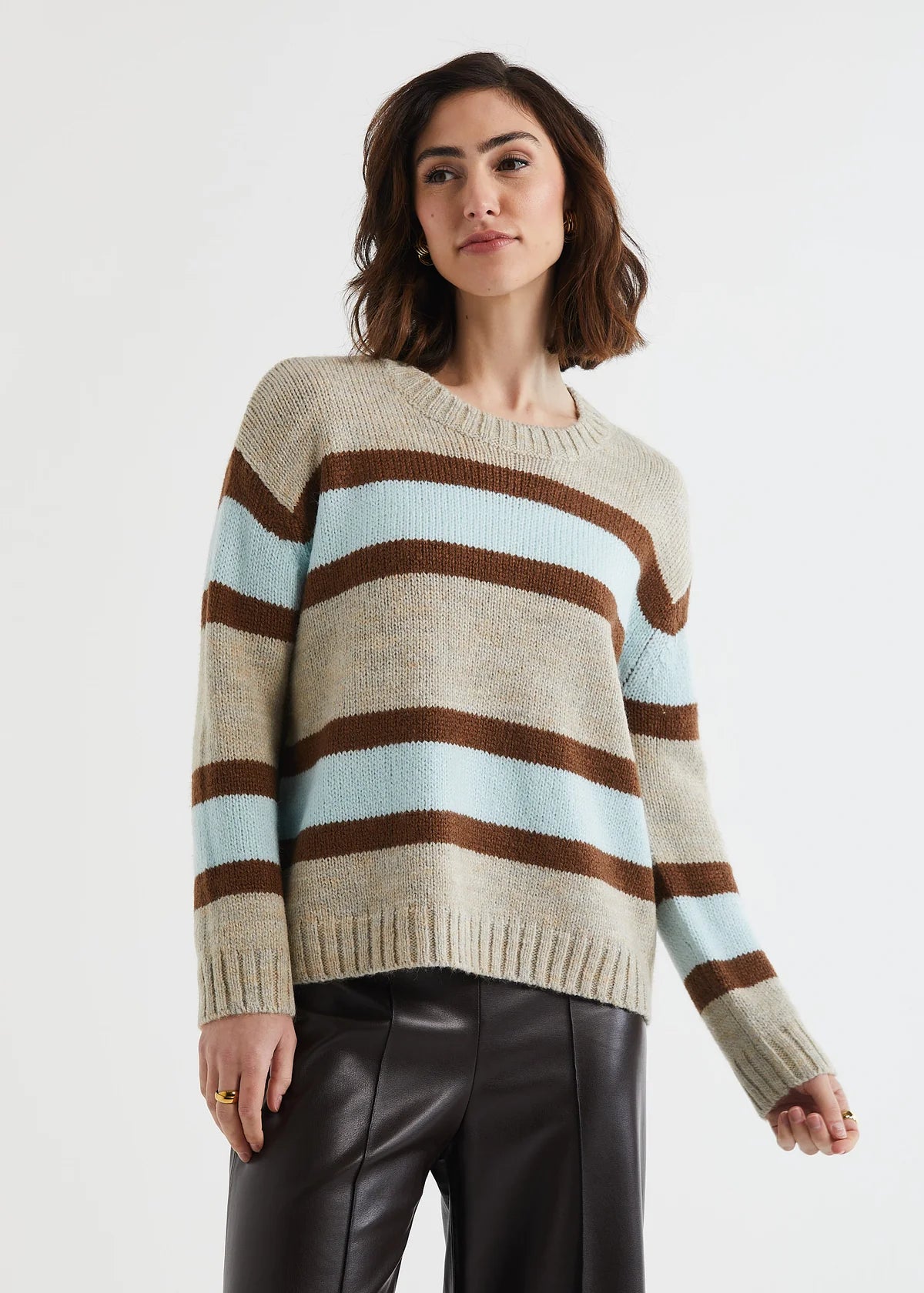 This mid-weight, chunky knit crew neck jumper features eye-catching contrast colour stripes, making it the ideal casual piece for the weekend.