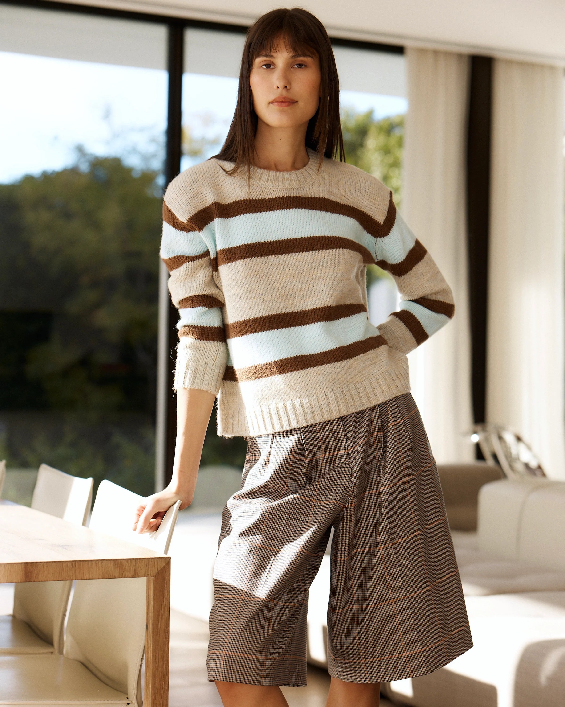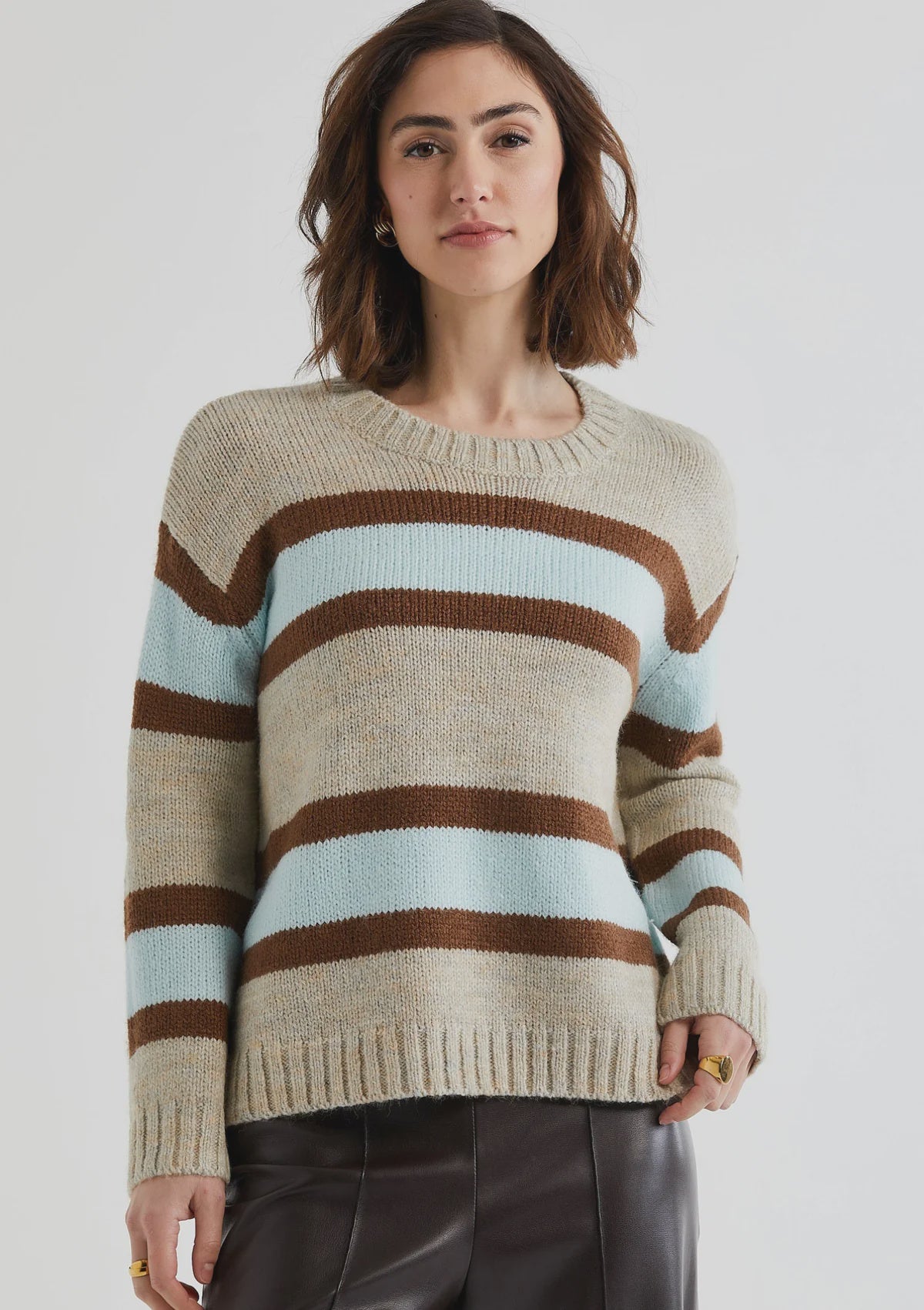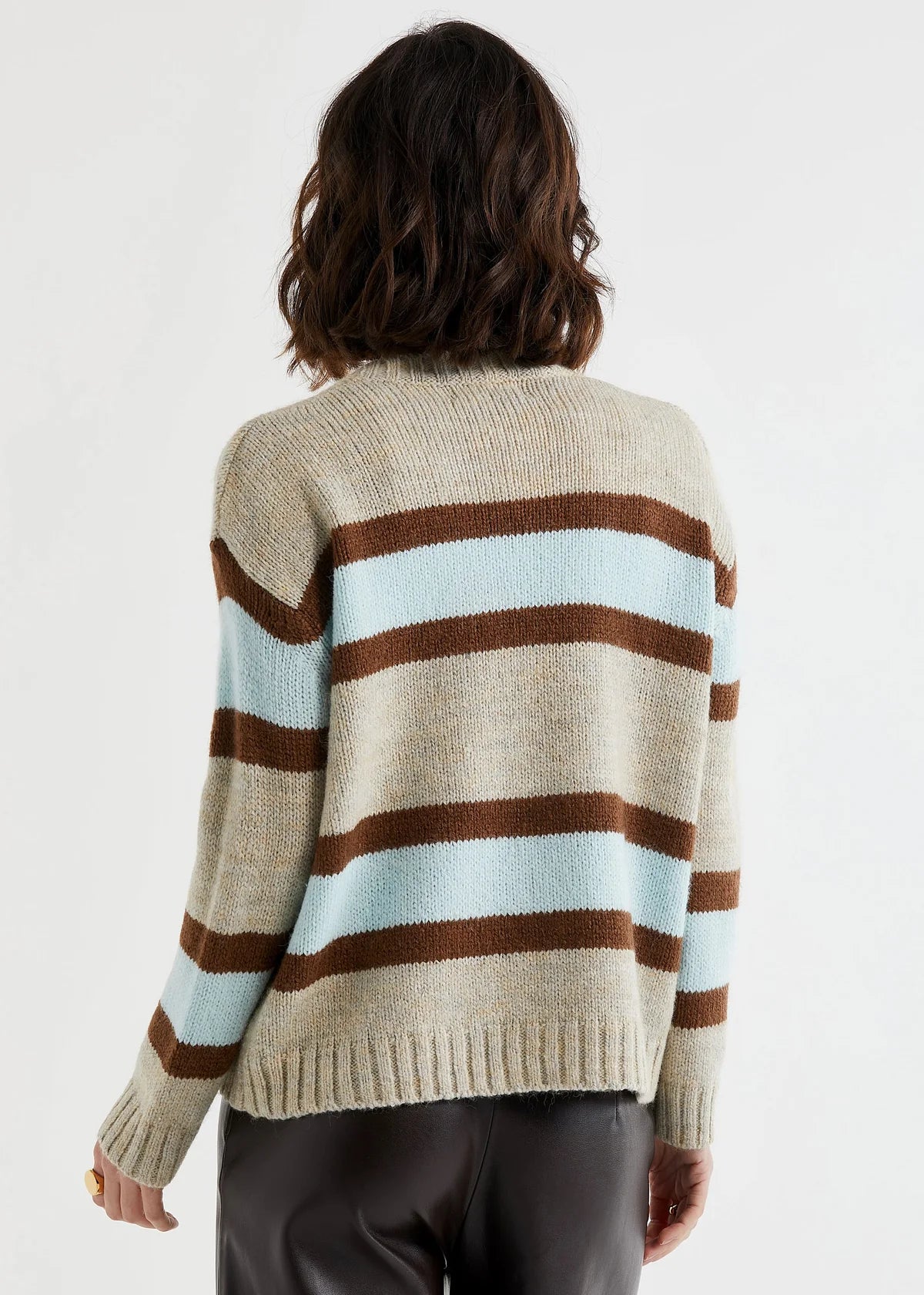 This mid-weight, chunky knit crew neck jumper features eye-catching contrast colour stripes, making it the ideal casual piece for the weekend.