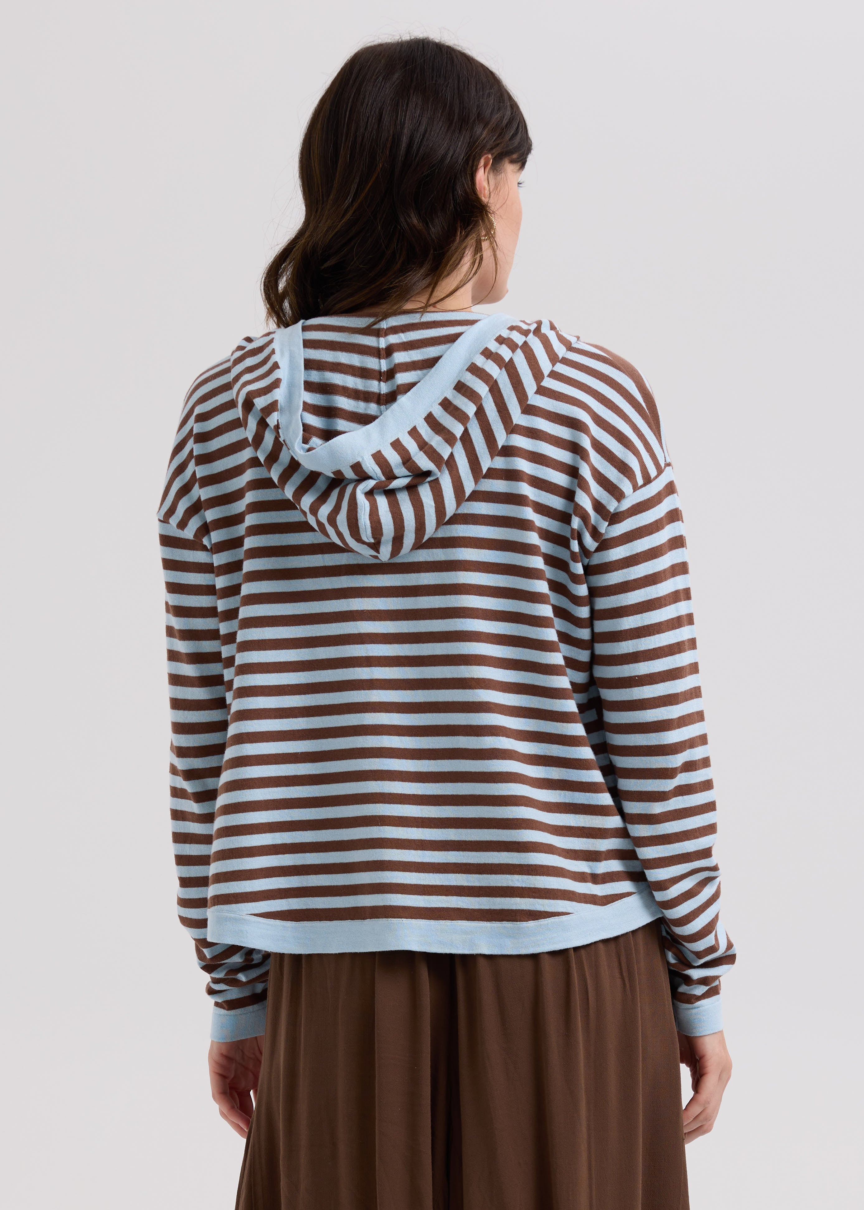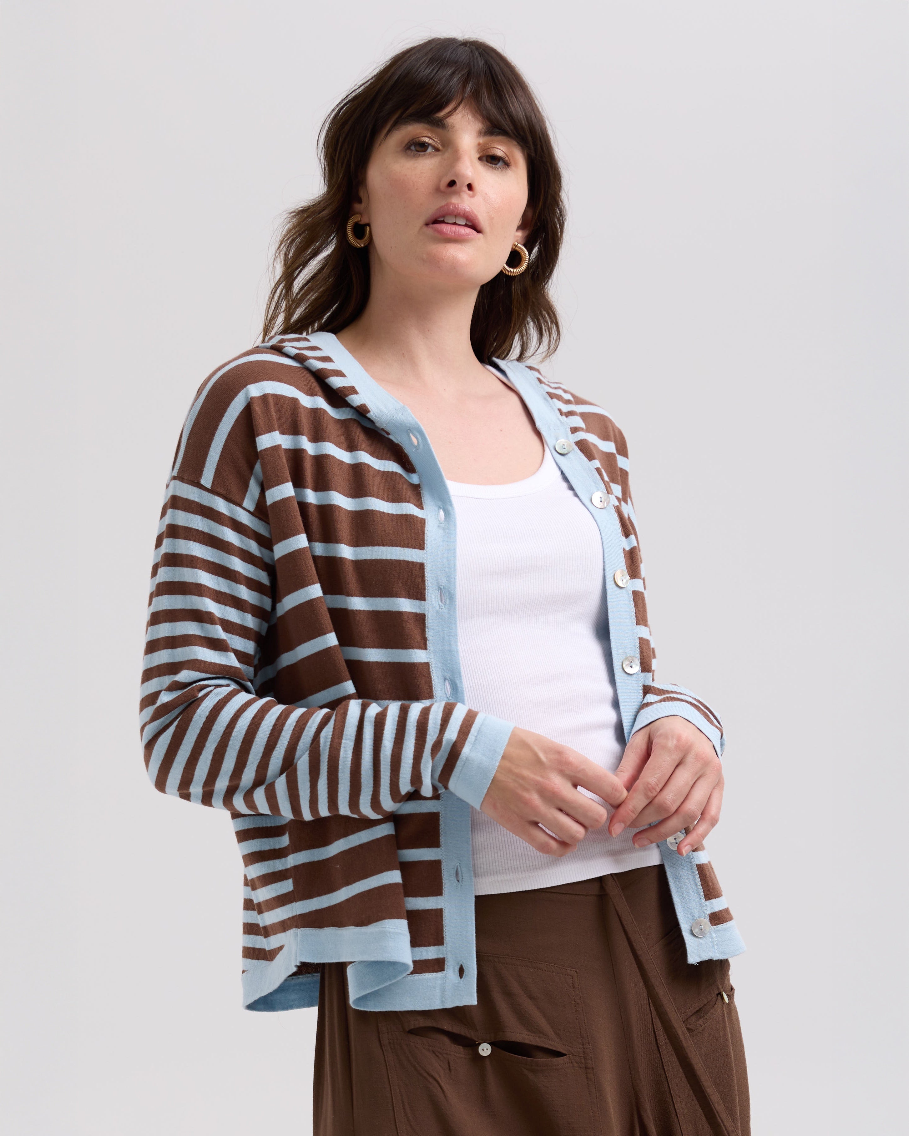 A modern wardrobe essential that blends relaxed comfort with playful design. This button-up hoodie showcases a trendy drop shoulder cut and a bold mix of stripe widths across the body and sleeves, lending easy personality to any casual look. Crafted from soft, breathable cotton, it layers effortlessly and feels soft to the touch. The relaxed fit and front-button detail make it perfect for transitional seasons.