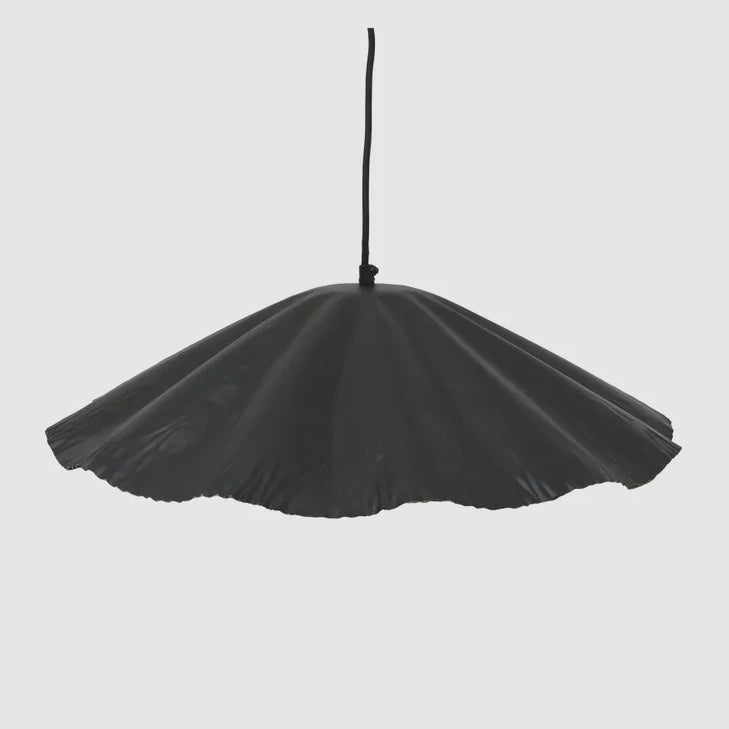 This large Crimped Pendant features an industrial sheet iron design with a unique scalloped wave shape. The organic form contrasts black on the outside with a warm gold interior, creating a dynamic and striking lighting statement. Available in large and small.