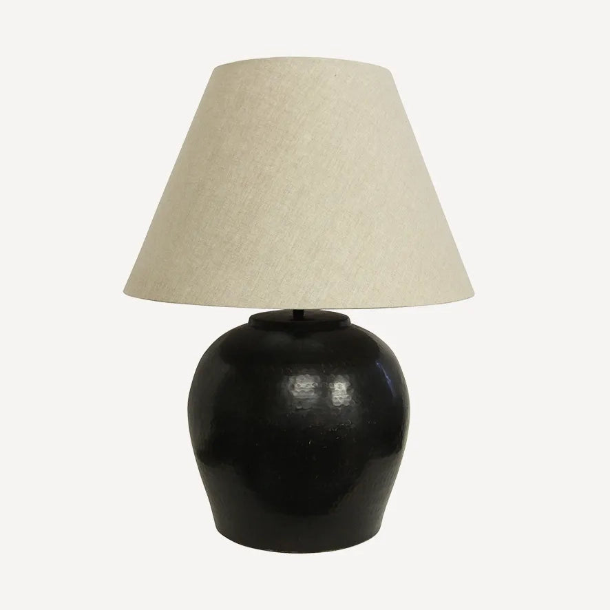 Hammered round lampbase in antique brown finish with shade adds warmth and texture to living spaces.