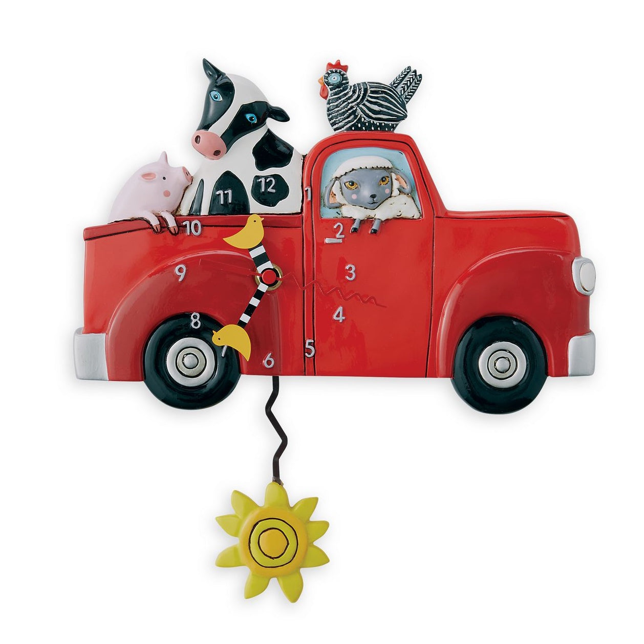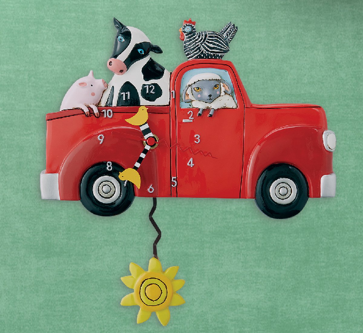 This whimsical clock features a swinging sunshine pendulum, hand-painted chicken hands and is cast in resin and finished by hand. Designed by artist Michelle Allen