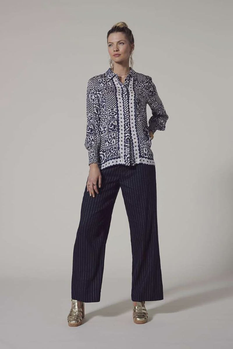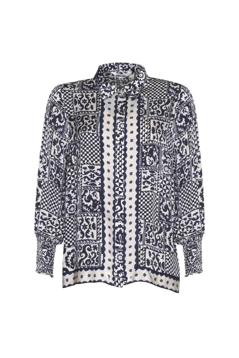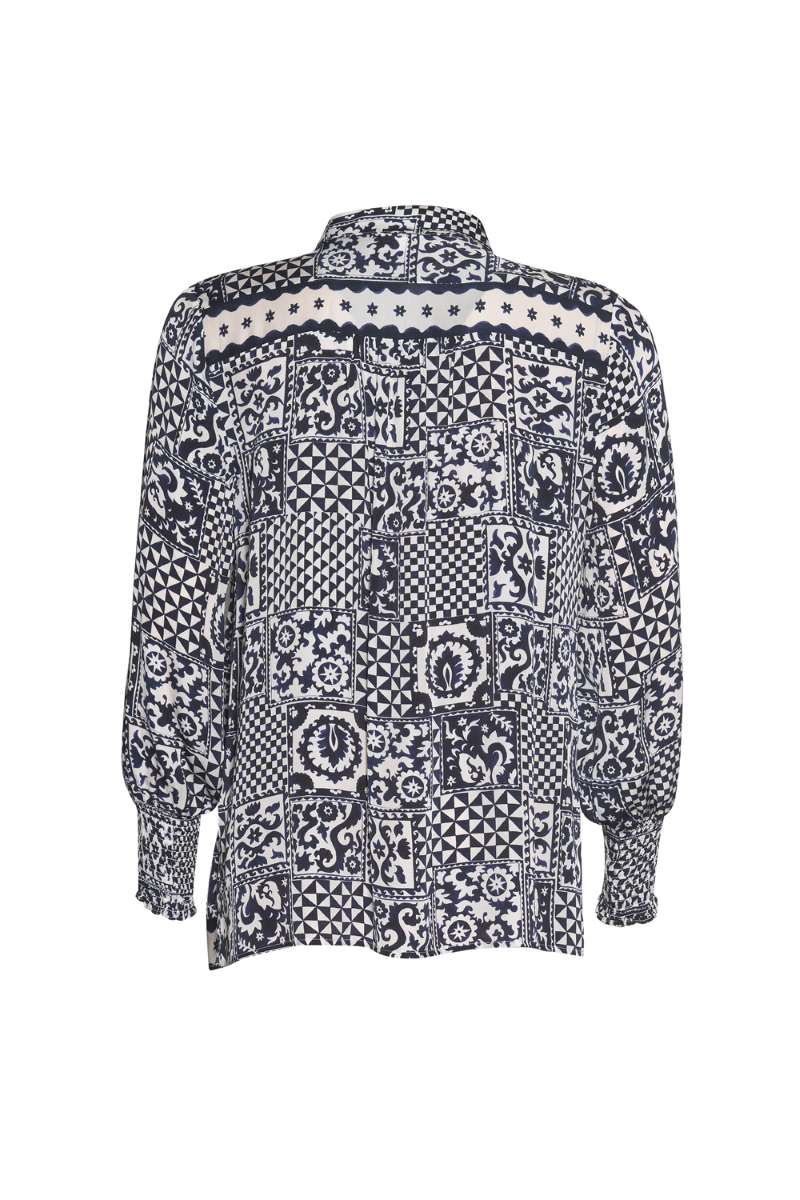 Button through collared shirt featuring blouson sleeves with deep shirred cuffs and side splits. The concealed button placket and square hemline are highlighted with a contrast print.