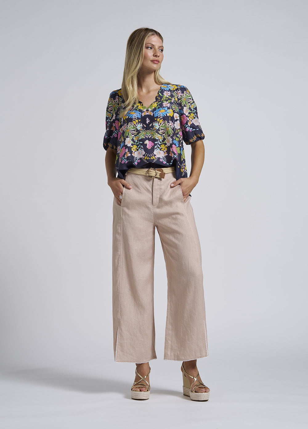 Fit and flare top in a silk cotton blend, with a scalloped V-neckline, and blouson sleeves with hidden elastic cuffs. Featuring a centred mirrored print design.