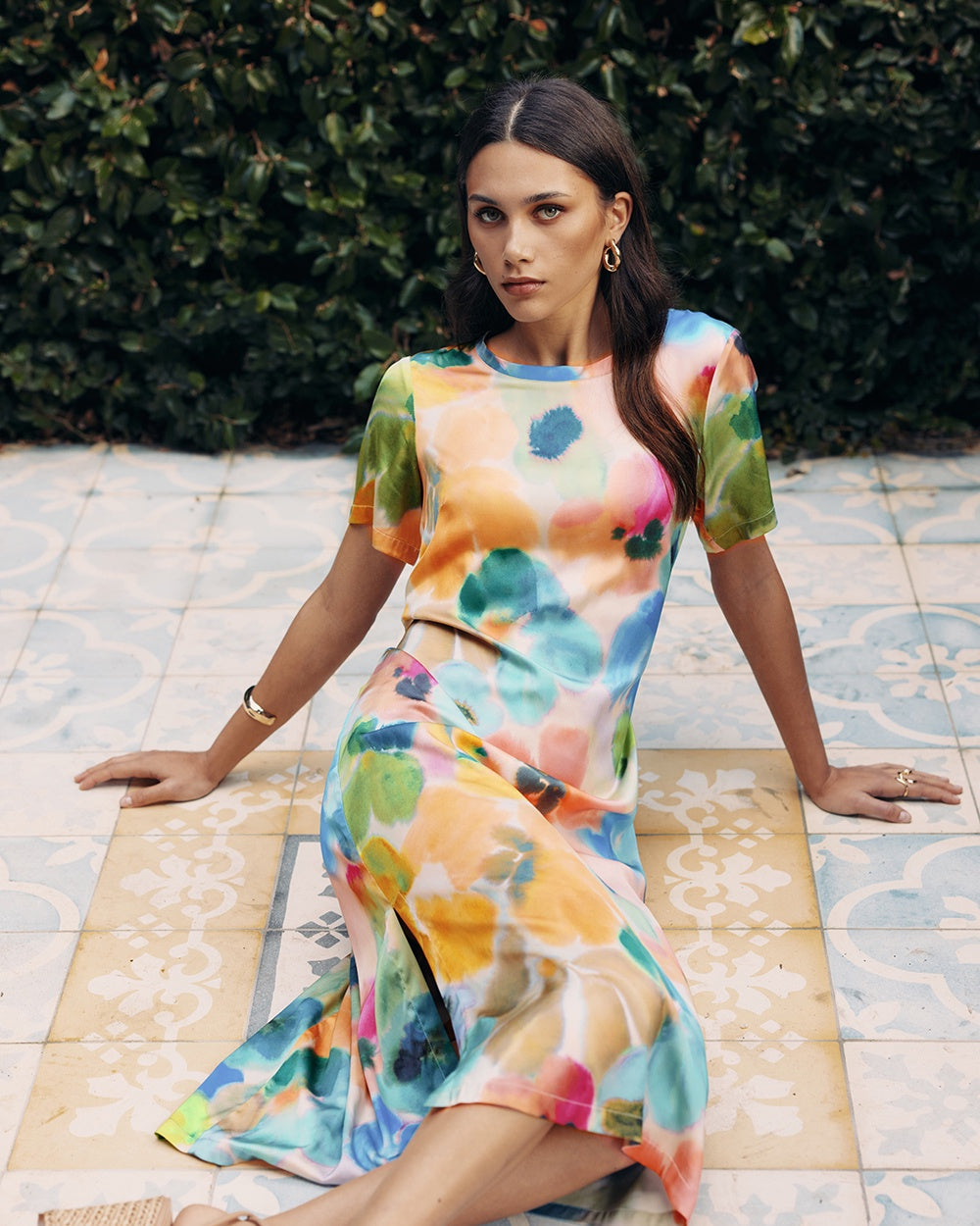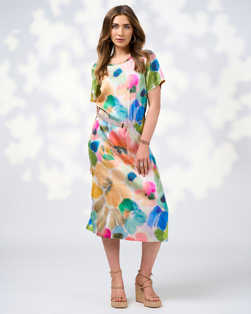A luxe t-shirt style dress, in a silky printed stretch viscose. With bust darts, back neck opening and side splits to elevate.