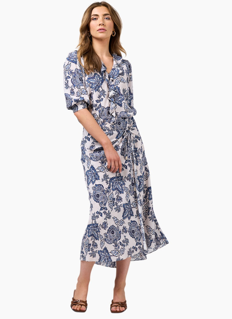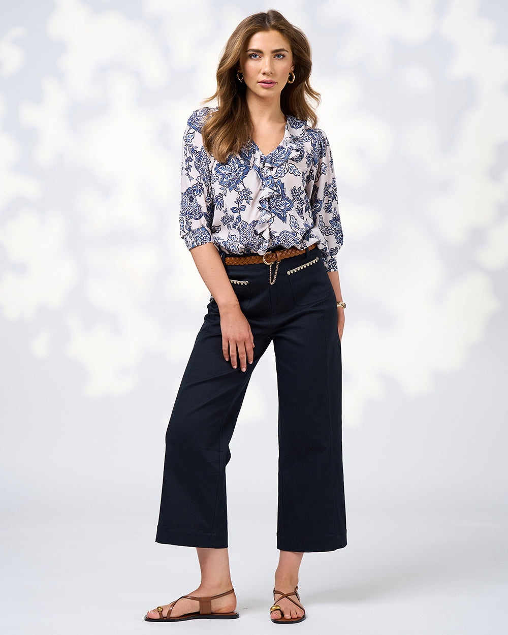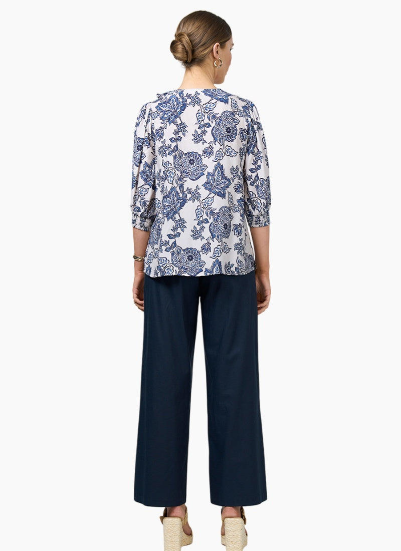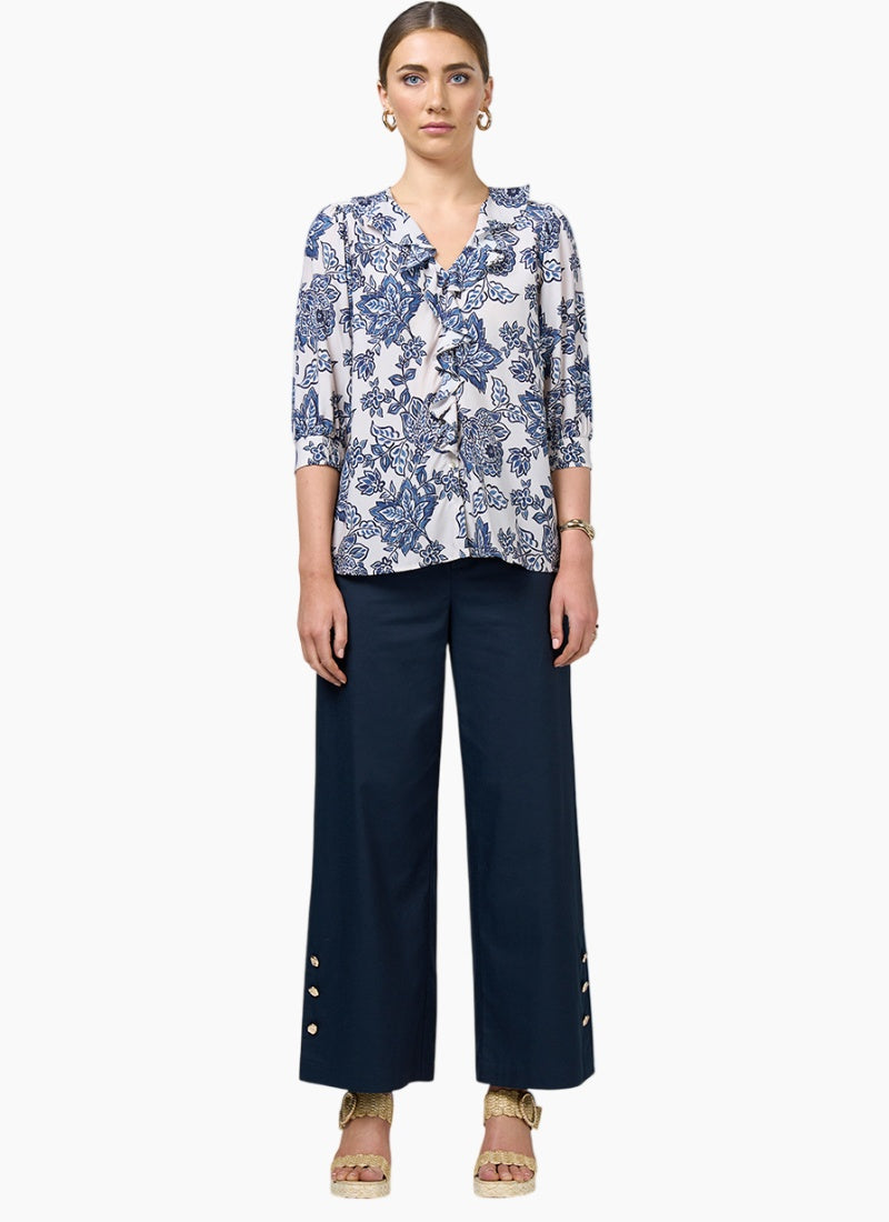Printed blouse in a silk blend with flounce detail around neckline and through front. Sleeves softly gather into half shirred elasticated cuffs. Featuring bust darts and side splits for the perfect fit.