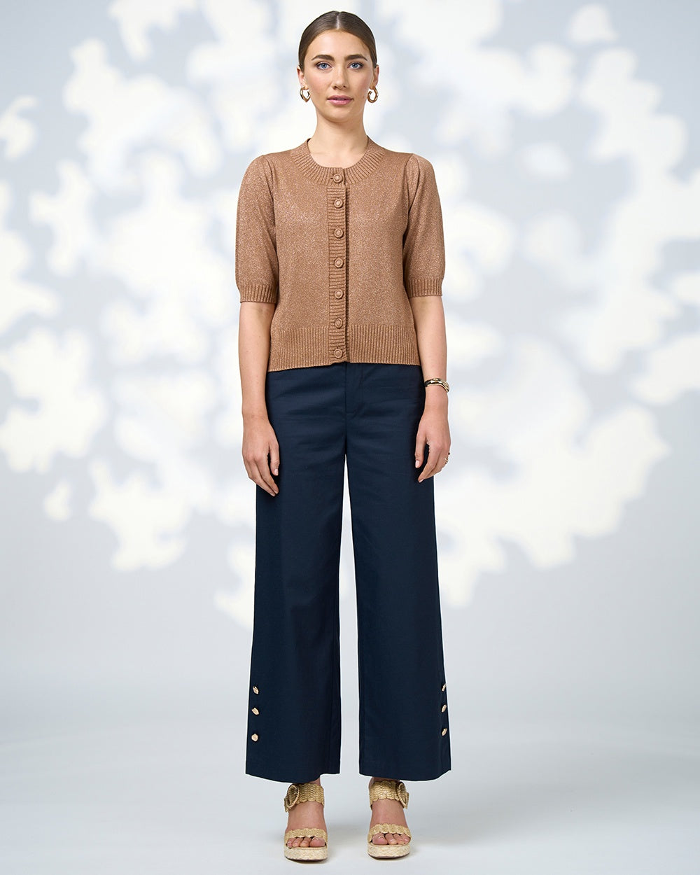 Short sleeve, fitted cardi in a metallic cotton cashmere to add shimmer and elevate your look. Features shoulder tucks to add subtle sleeve volume, self knitted covered buttons and deep ribbing detail.
