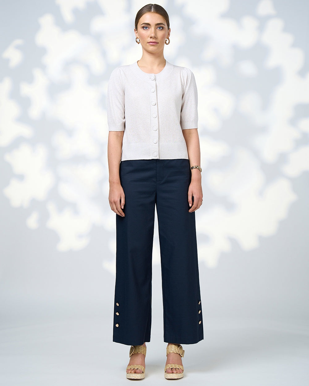 Short sleeve, fitted cardi n a metallic cotton cashmere to add shimmer and elevate your look. Features shoulder tucks to add subtle sleeve volume, self knitted covered buttons and deep ribbing detail.