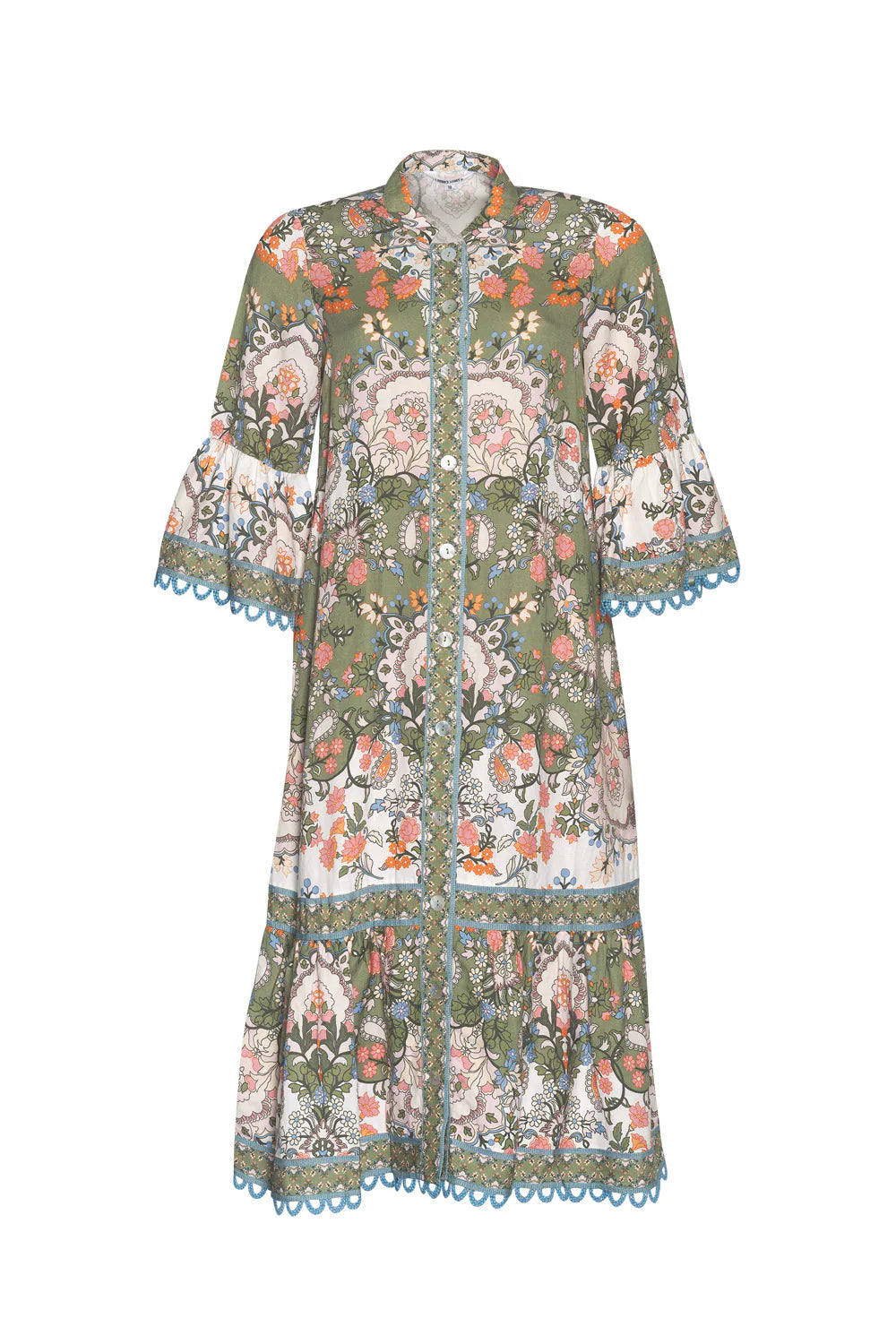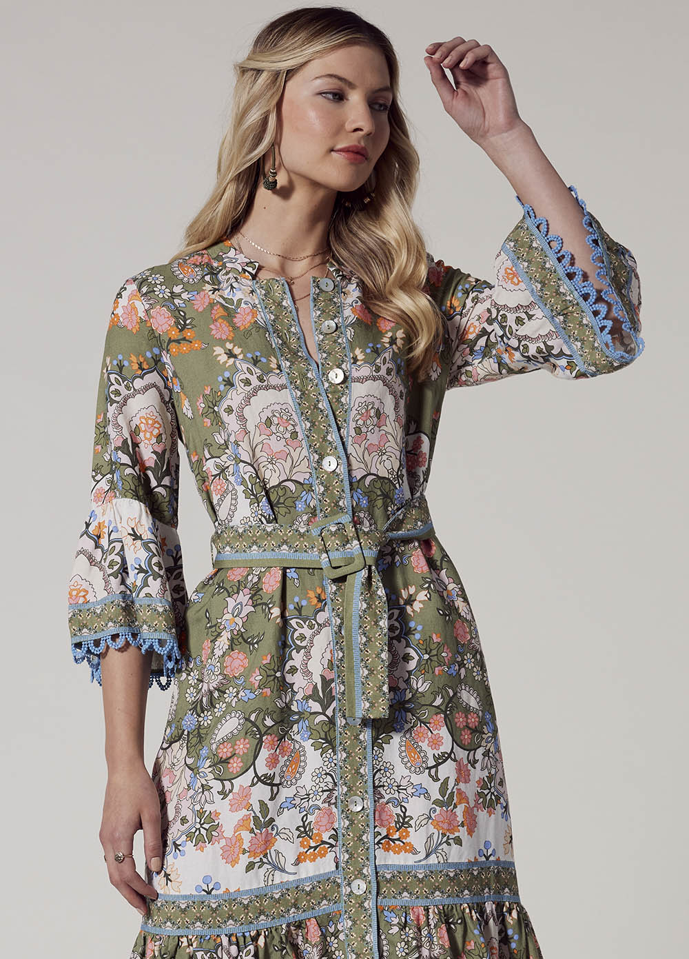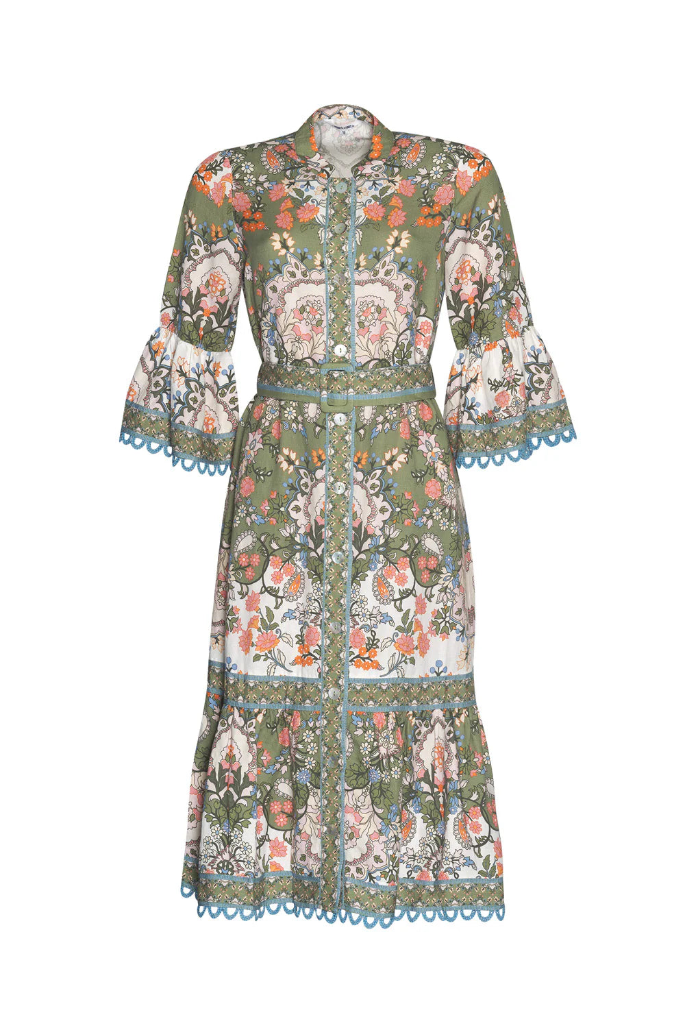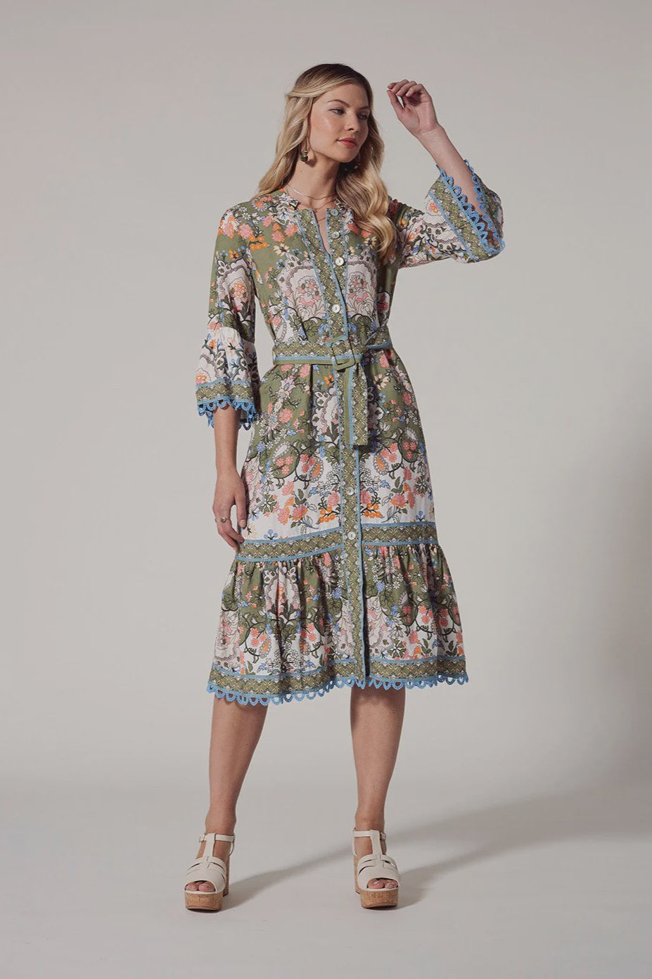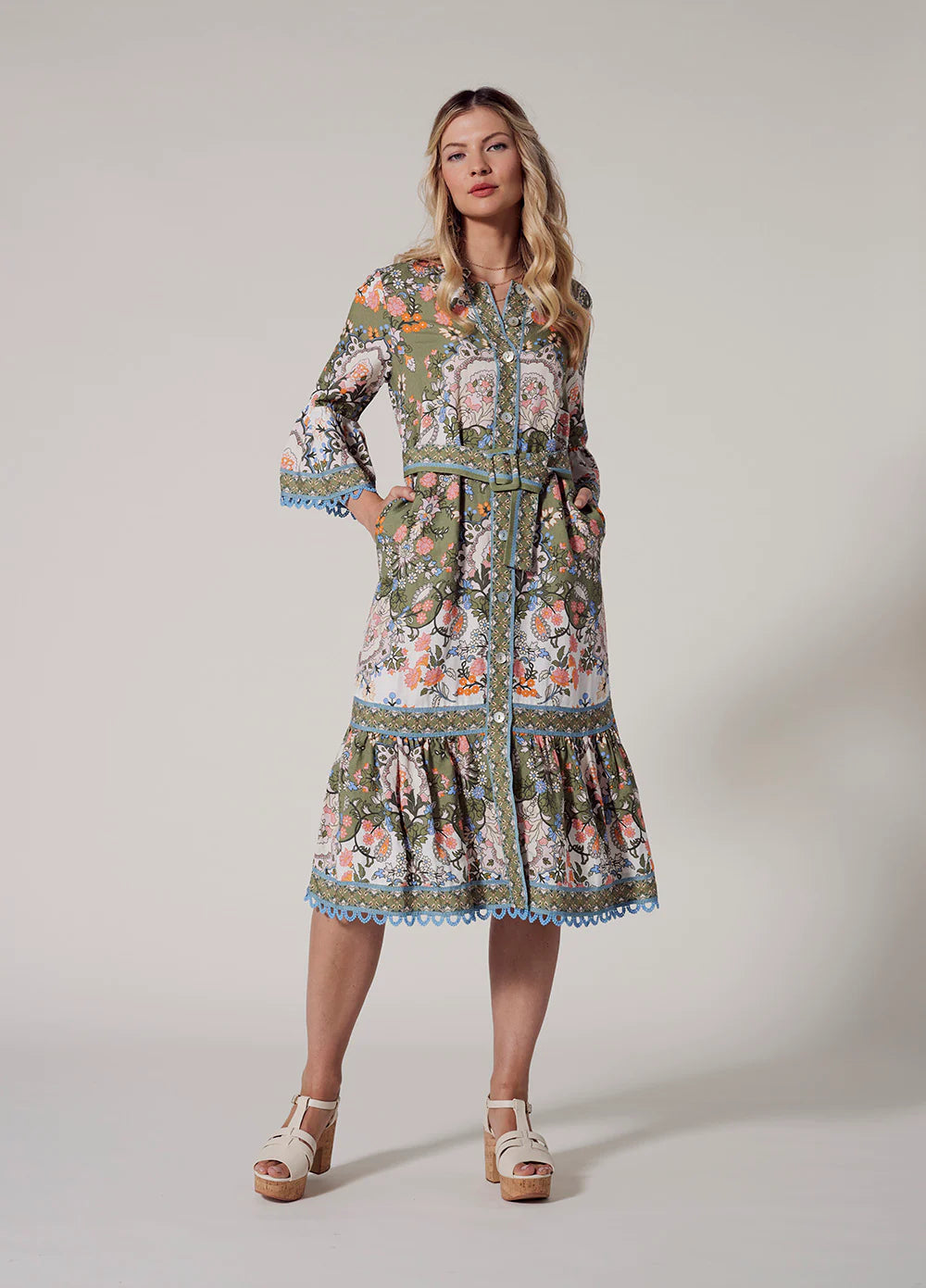 Button through midi dress with 3/4 length ruffled sleeves, with matching self belt, and hidden in-seam pockets. Featuring contrast piping detail , with cotton lace trim and shell buttons.