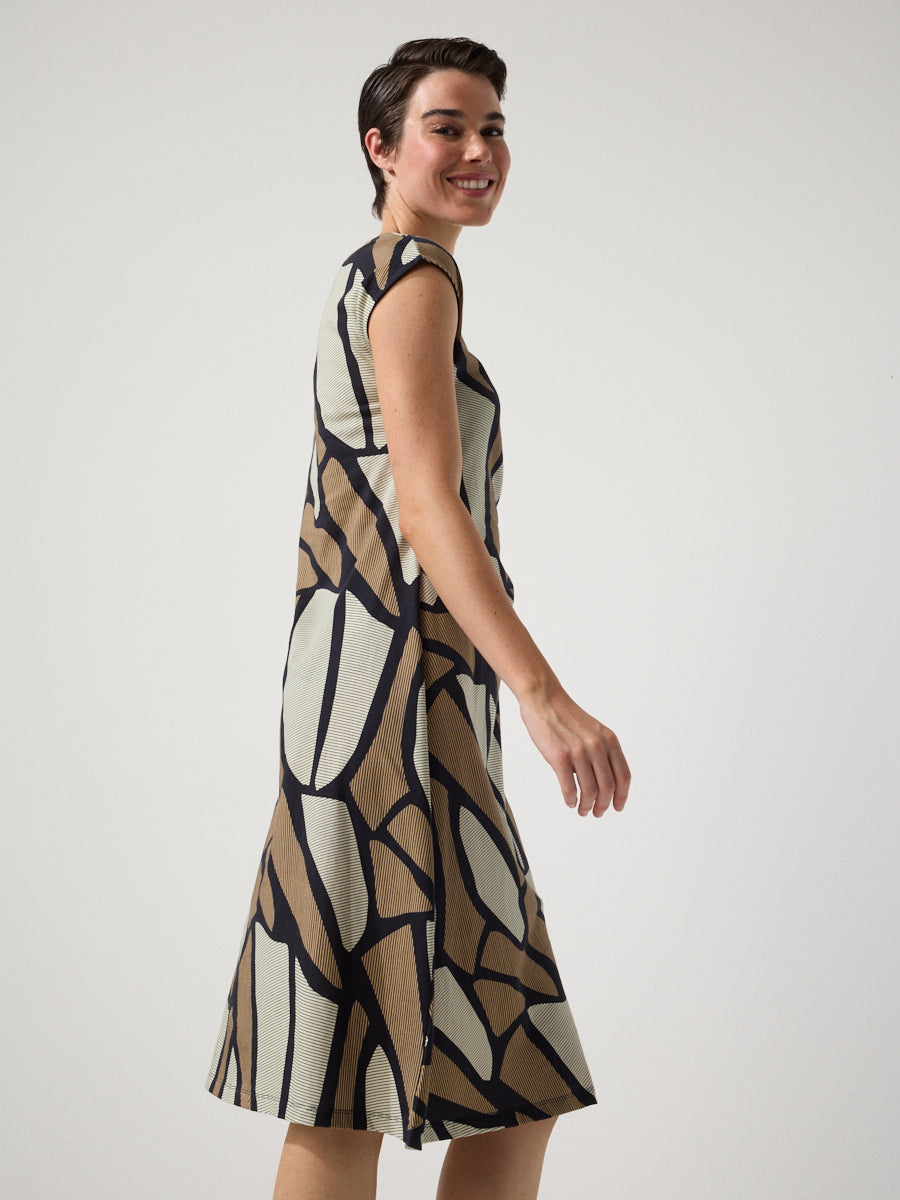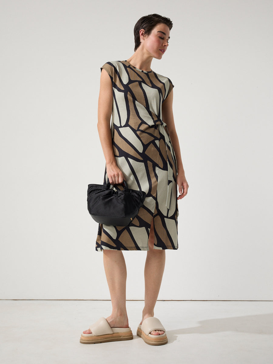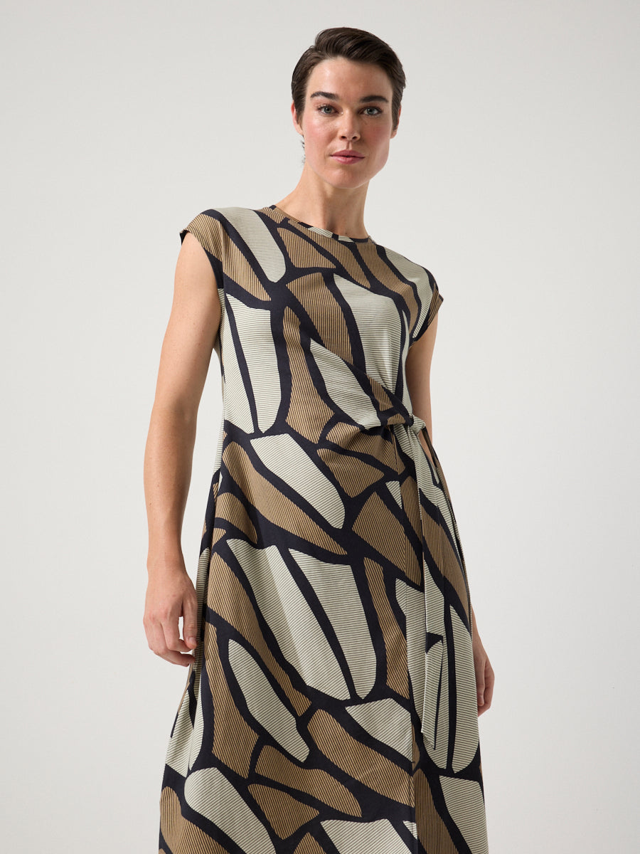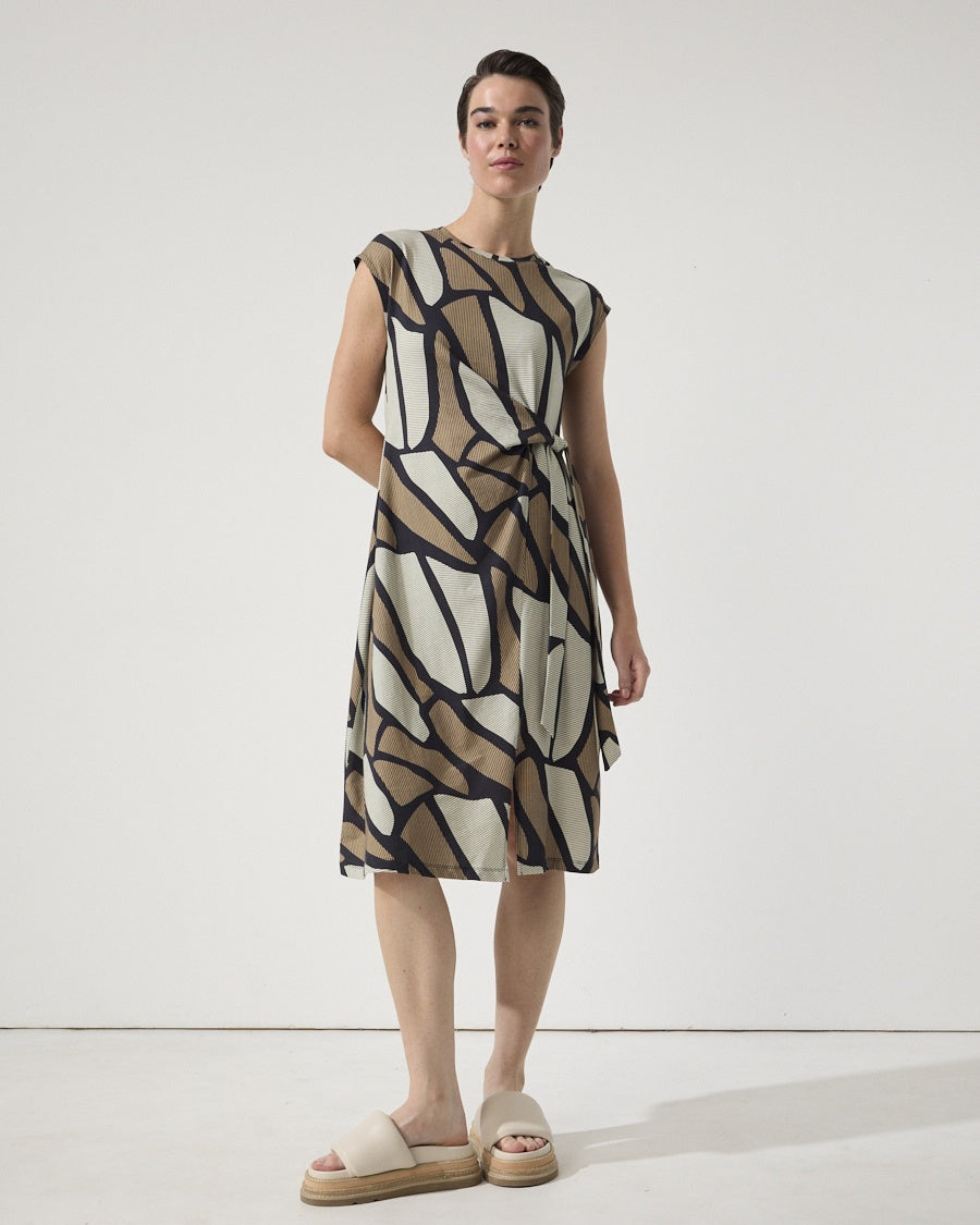The Bedrock Dress reimagines the classic cotton midi with bold print and easy structure. Crafted from 100% cotton, it feels light and breathable while holding its clean shape. Extended cap sleeves sit neatly on the shoulders for a balanced finish, while the draped side waist tie adds subtle definition without losing comfort. Falling just below the knee, this semi-fitted dress offers a flattering midi length silhouette that feels both contemporary and timeless.
