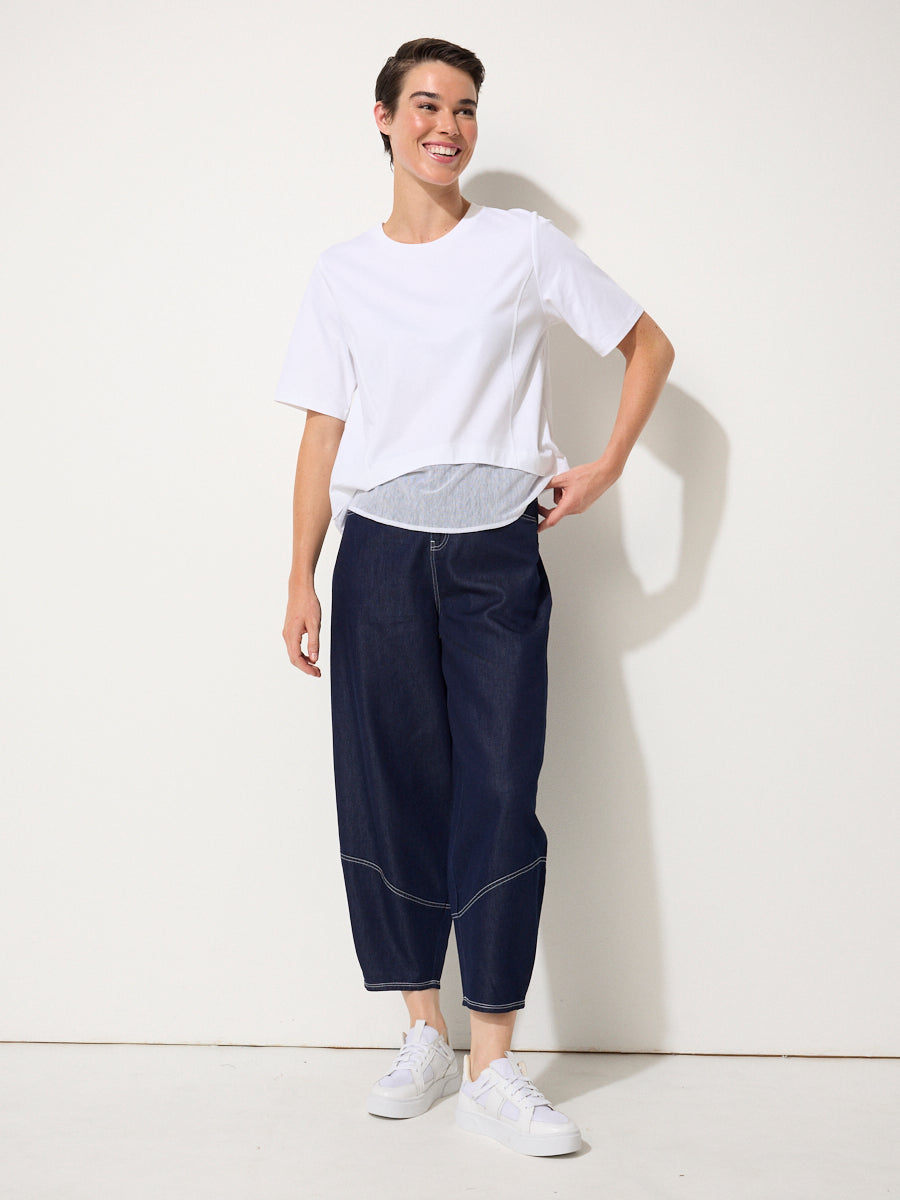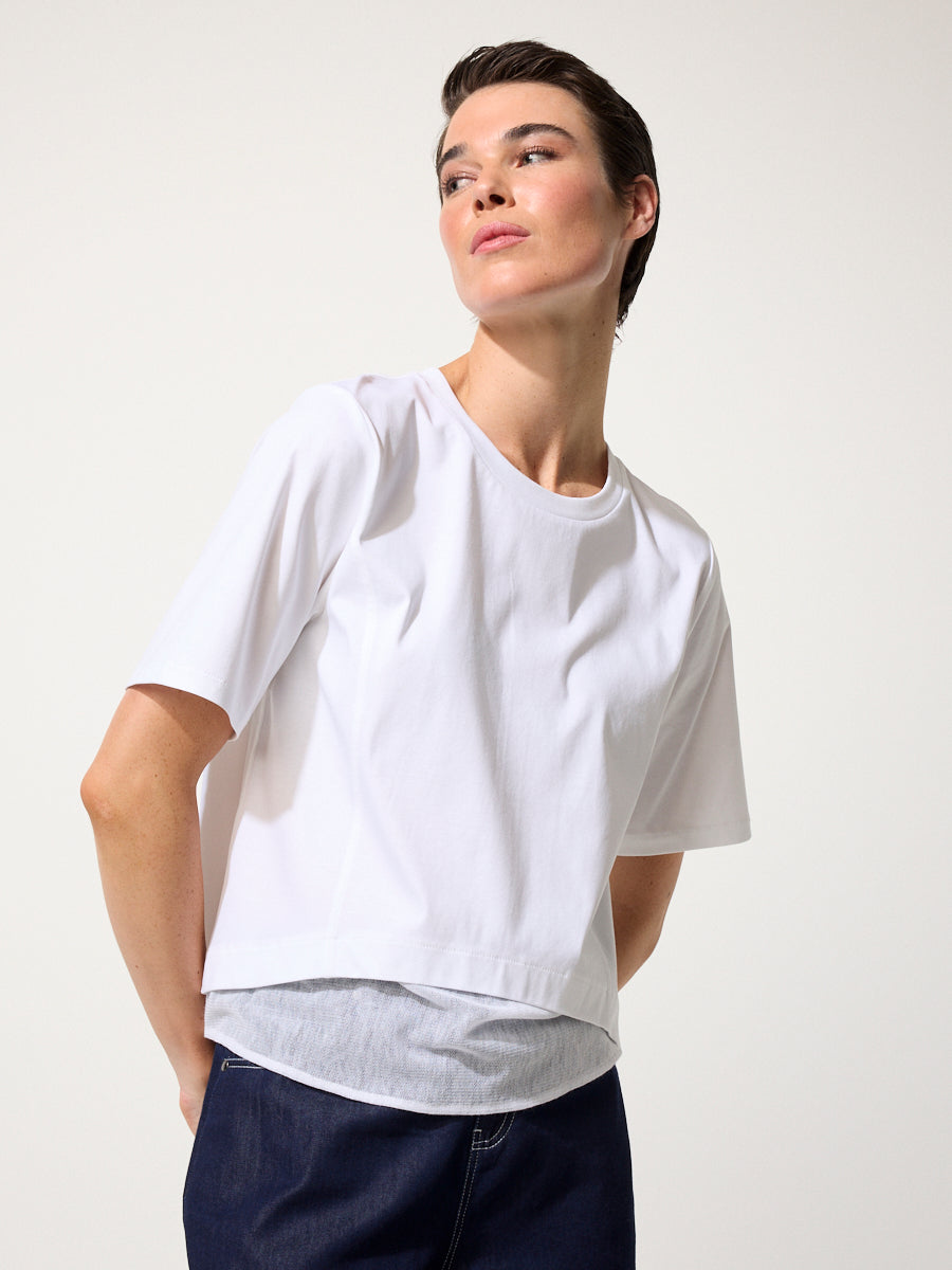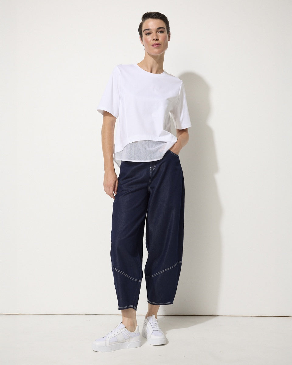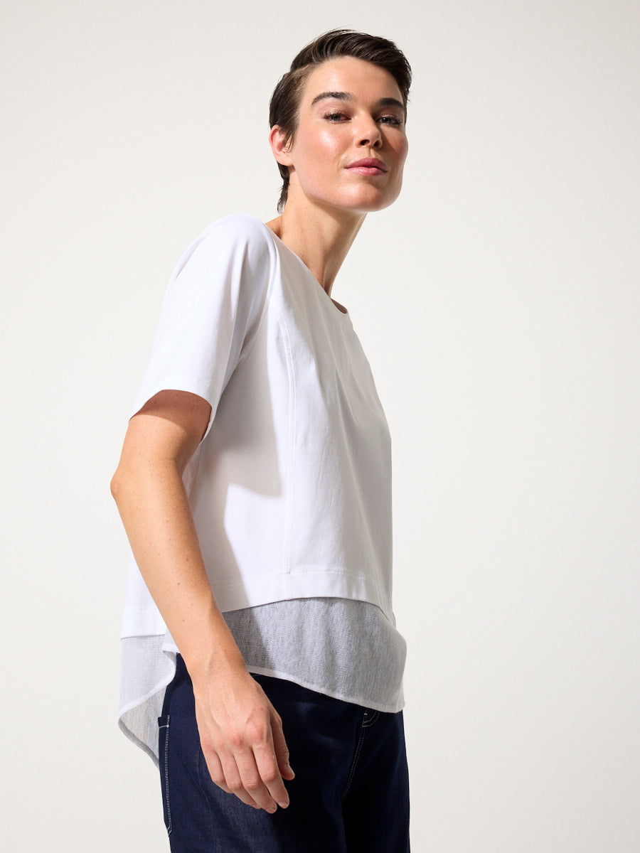 An elevated update to the everyday tee. The Mesh Panelled Tee plays with texture and proportion, featuring a contrast mesh panel at the hem that creates the illusion of layered styling. Crafted with a round neckline, short sleeves, and a relaxed fit, the high-low hem adds movement and shape. Subtle yet distinctive, this piece brings a fresh perspective to a wardrobe staple - effortless to style, and anything but ordinary.