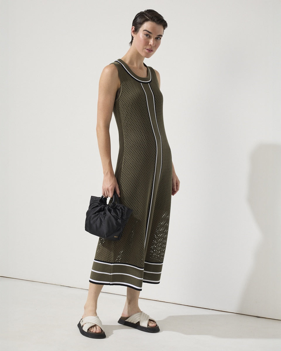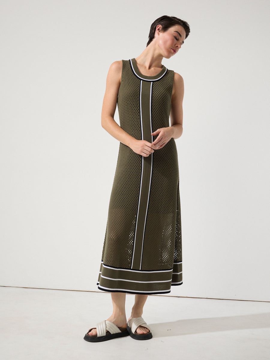 The Nature Stripe Knit Dress reimagines a summer staple with texture and ease. Designed with a scoop neck and contrast rib trims, the open knit body lends a light, breathable feel while showcasing subtle panelling for shape. A soft internal slip provides coverage down the centre without compromising the airy finish of the knit. Sleeveless and cut to a mid-calf length, it creates a clean fitted shift silhouette that balances comfort with polish. Effortlessly styled with sandals or layered under a jacket, it’s a versatile piece that transitions from casual weekends to more elevated occasions.