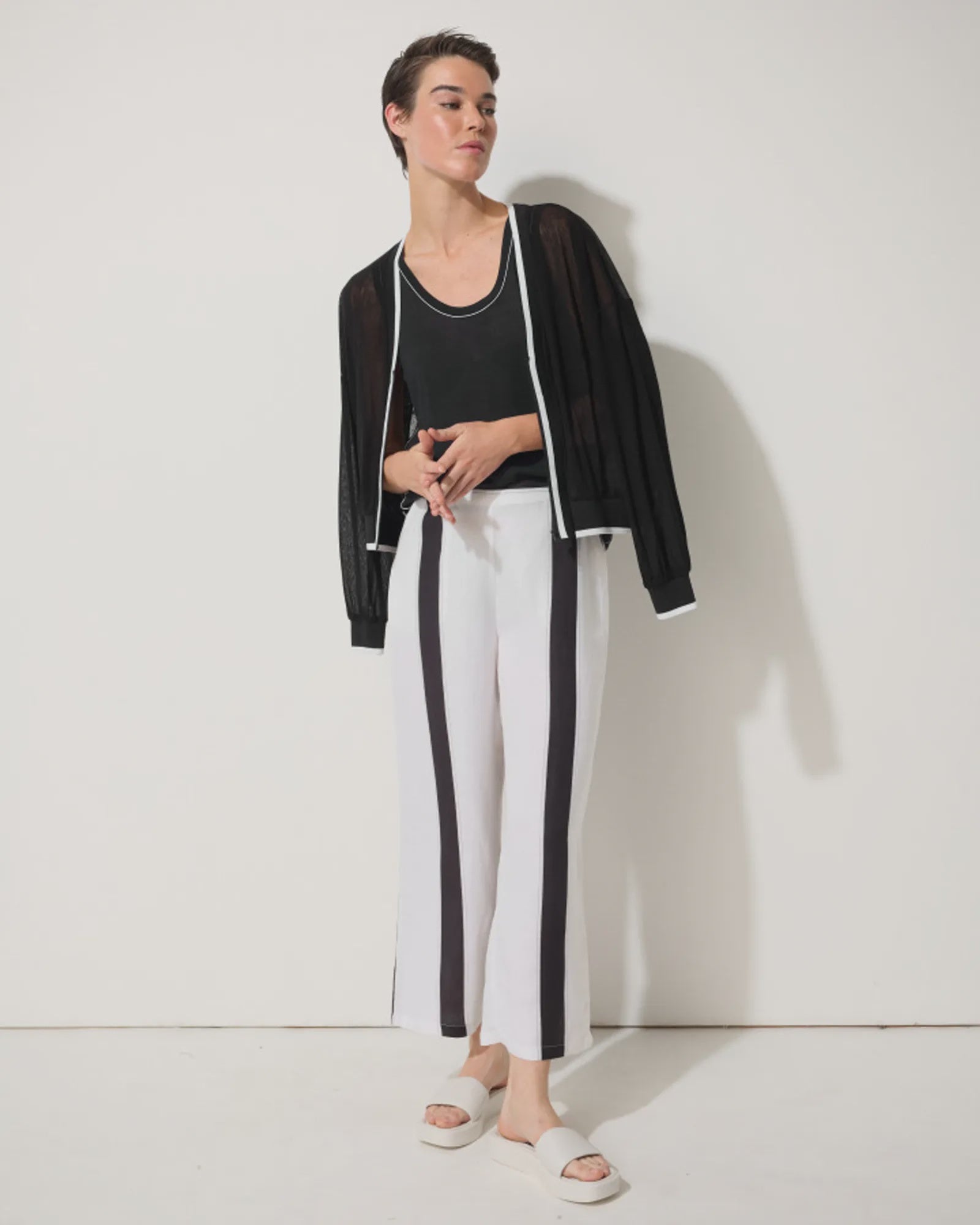 Crafted from fine semi-sheer mesh, it offers breathability while adding a directional twist to everyday outfitting. A zip-through front and V neckline keep the silhouette clean, while contrast striped rib trims highlight its sporty influence. Cut in a relaxed fit with long sleeves, it's a versatile jacket that lifts simple looks - throw it over a tee and denim for easy weekend style, or layer it with tailored pieces to bring a contemporary feel.
