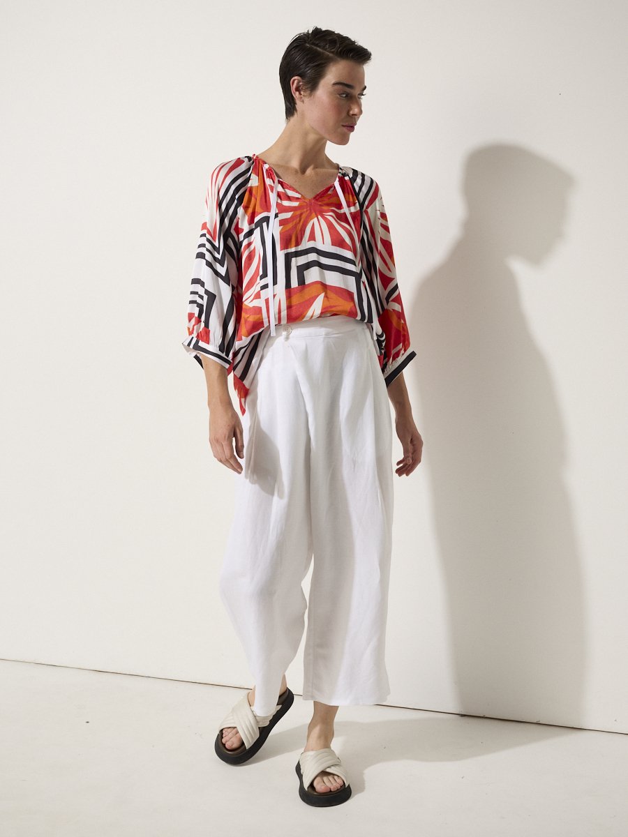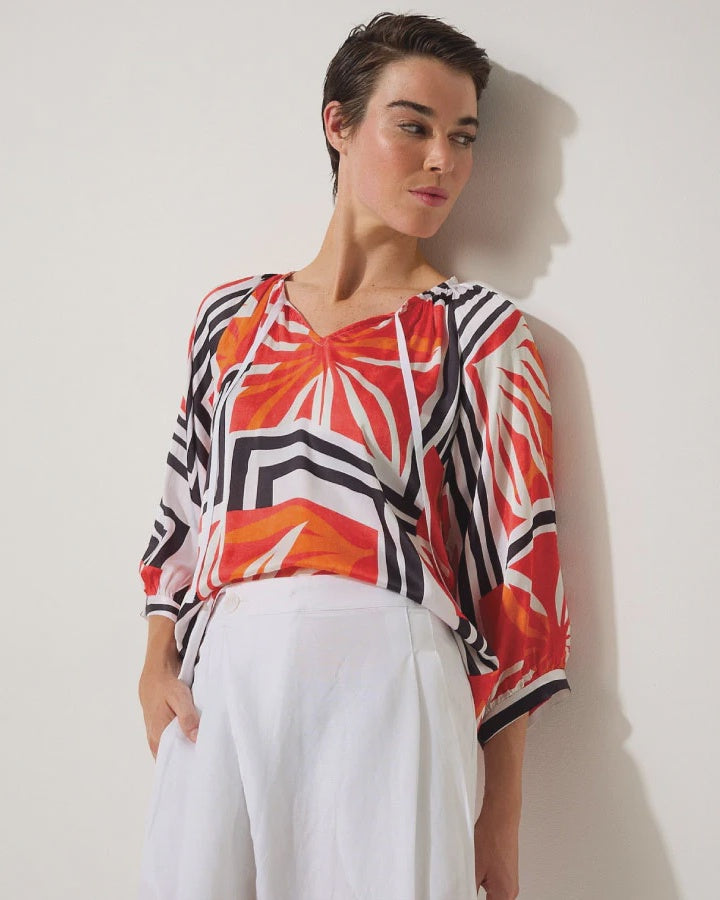 Cut from soft viscose, it’s finished in an exclusive geometric design of orange, red, black, and white - a vibrant mix that instantly elevates simple outfitting. The gathered neckline is framed with flat white ties that can be styled open or closed, while 3/4 raglan sleeves with gentle gathers add volume and flow.