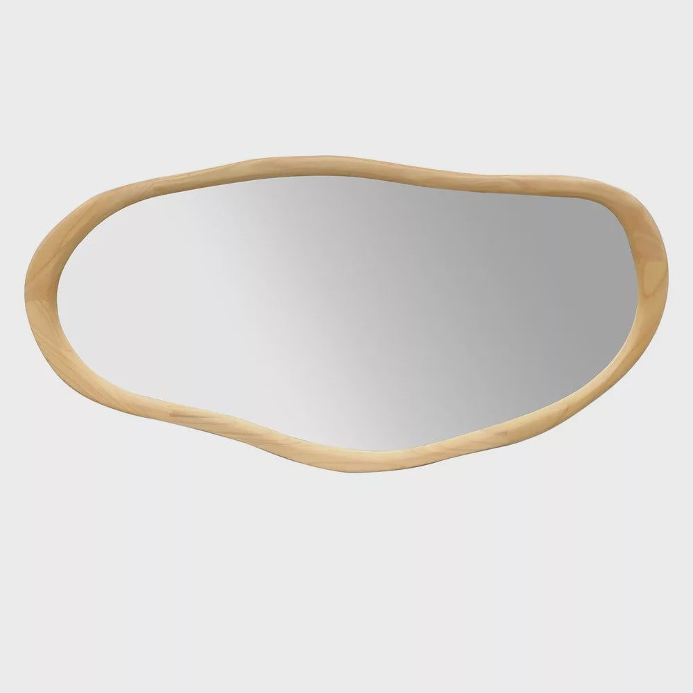 This wood and plain mirror has a landscape, and organic shape and is a sleek, modern design. The wooden frame adds warmth while keeping a contemporary look, making it a refined accent that fits any decor.
