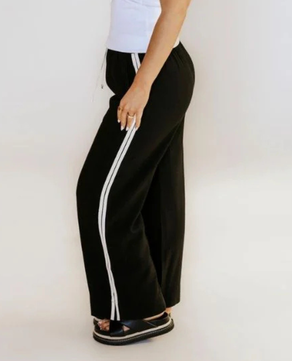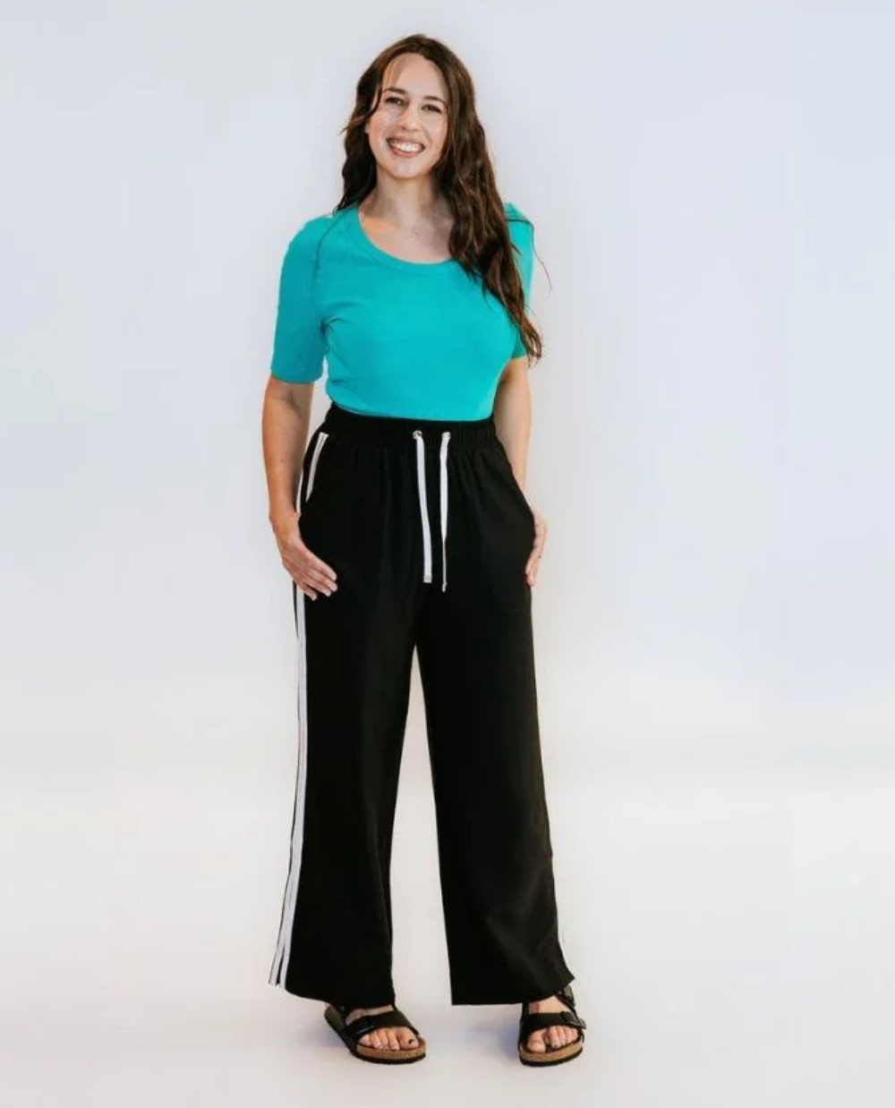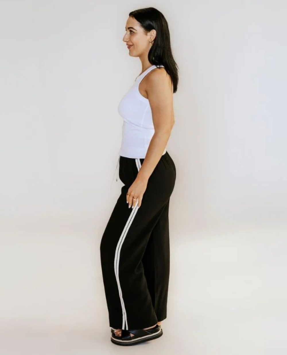 The perfect blend of style and comfort. Crafted from a lightweight, breathable fabric, these pants are designed to keep you cool and comfortable no matter the occasion. Featuring chic cream contrast stripes down each leg and stylish side splits at the hem, these pants bring a modern twist to a classic silhouette.