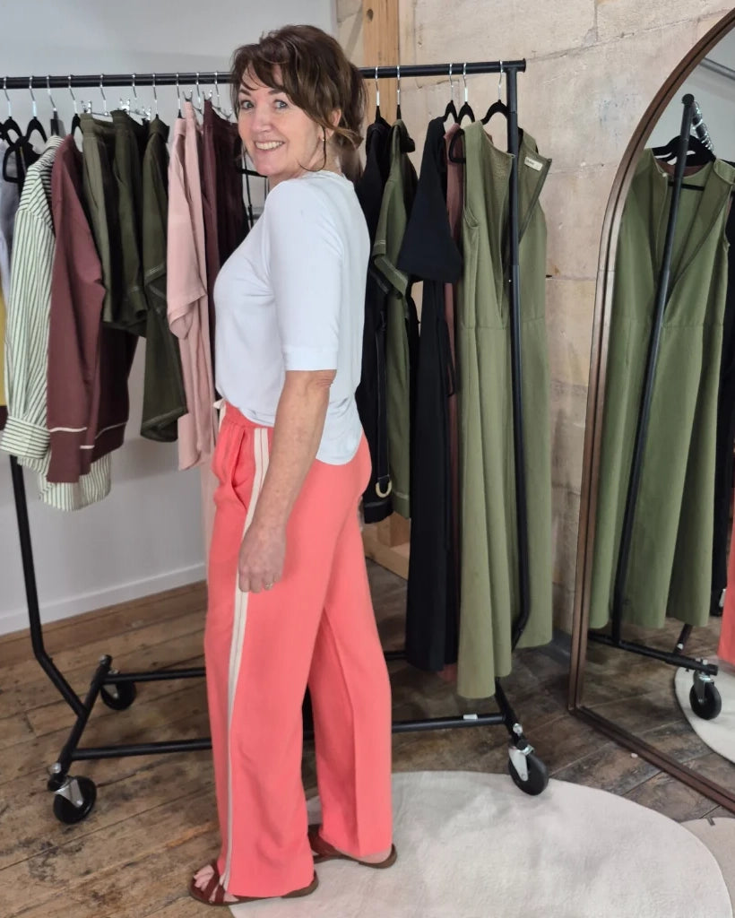 The perfect blend of style and comfort. Crafted from a lightweight, breathable fabric, these pants are designed to keep you cool and comfortable no matter the occasion. Featuring chic cream contrast stripes down each leg and stylish side splits at the hem, these pants bring a modern twist to a classic silhouette.