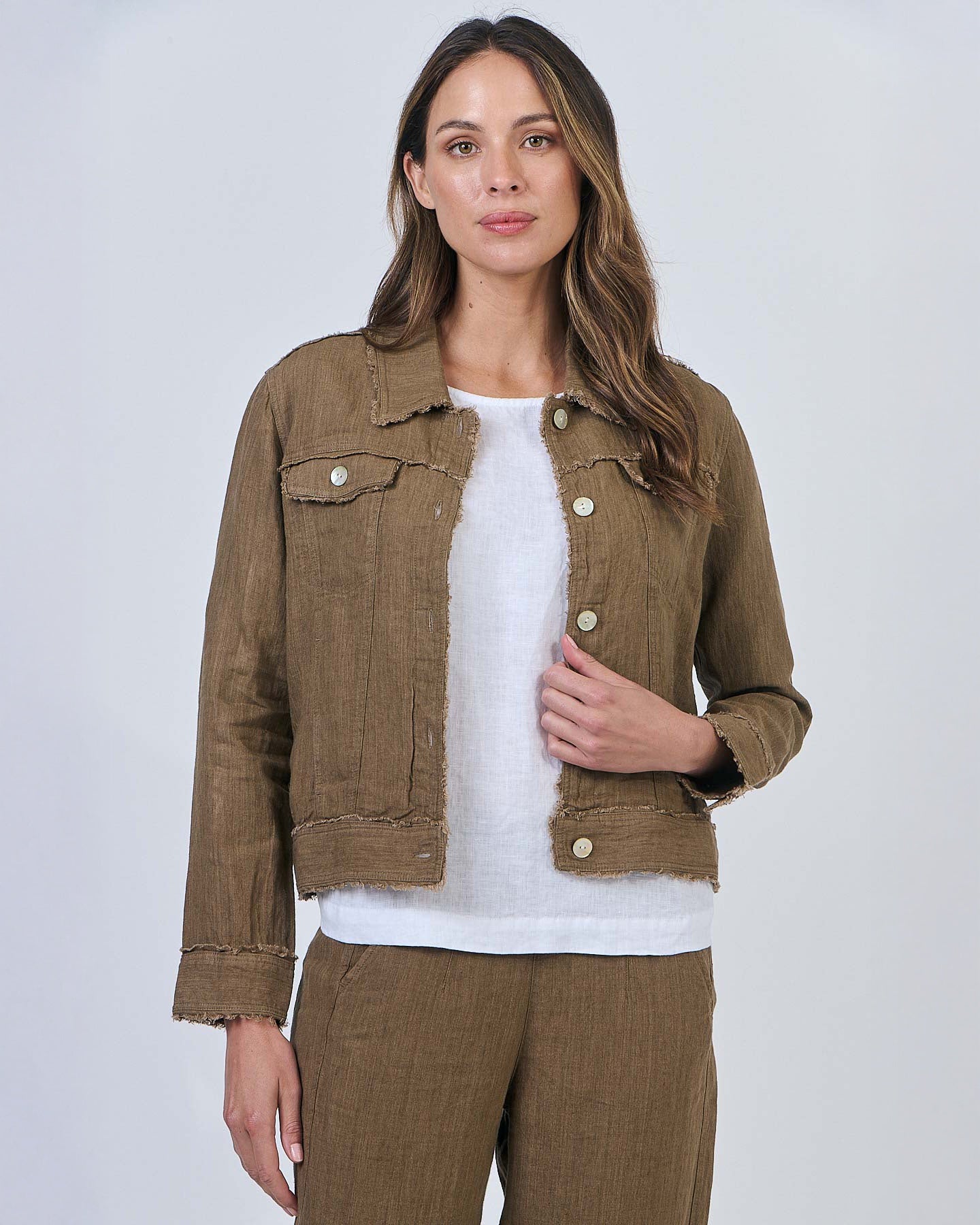 A jacket that will pair with just about anything, it features a point collar, raw edges, buttons all the way down, and two breast-pocket flaps. Made from 100% linen, this is a versatile, lightweight jacket.