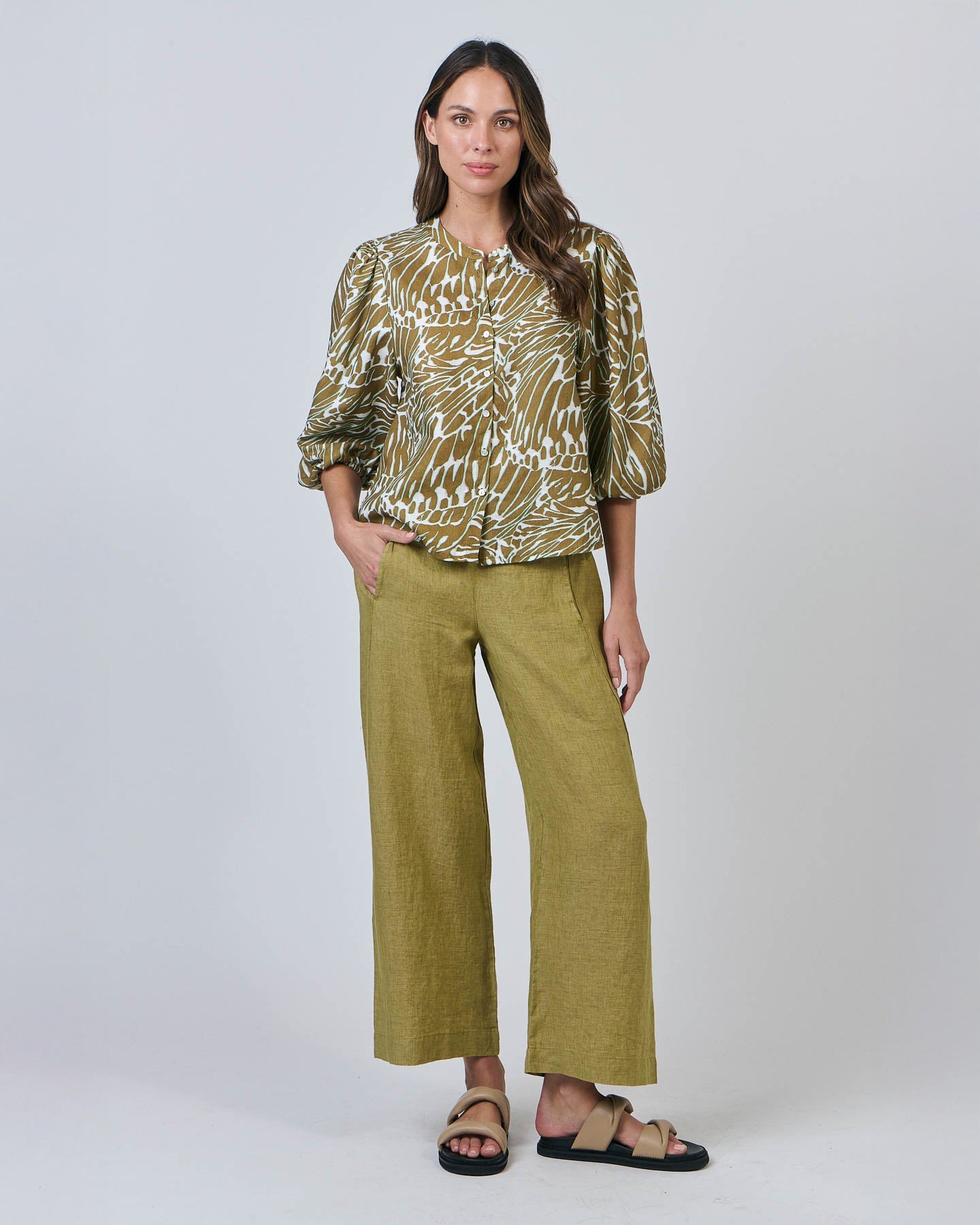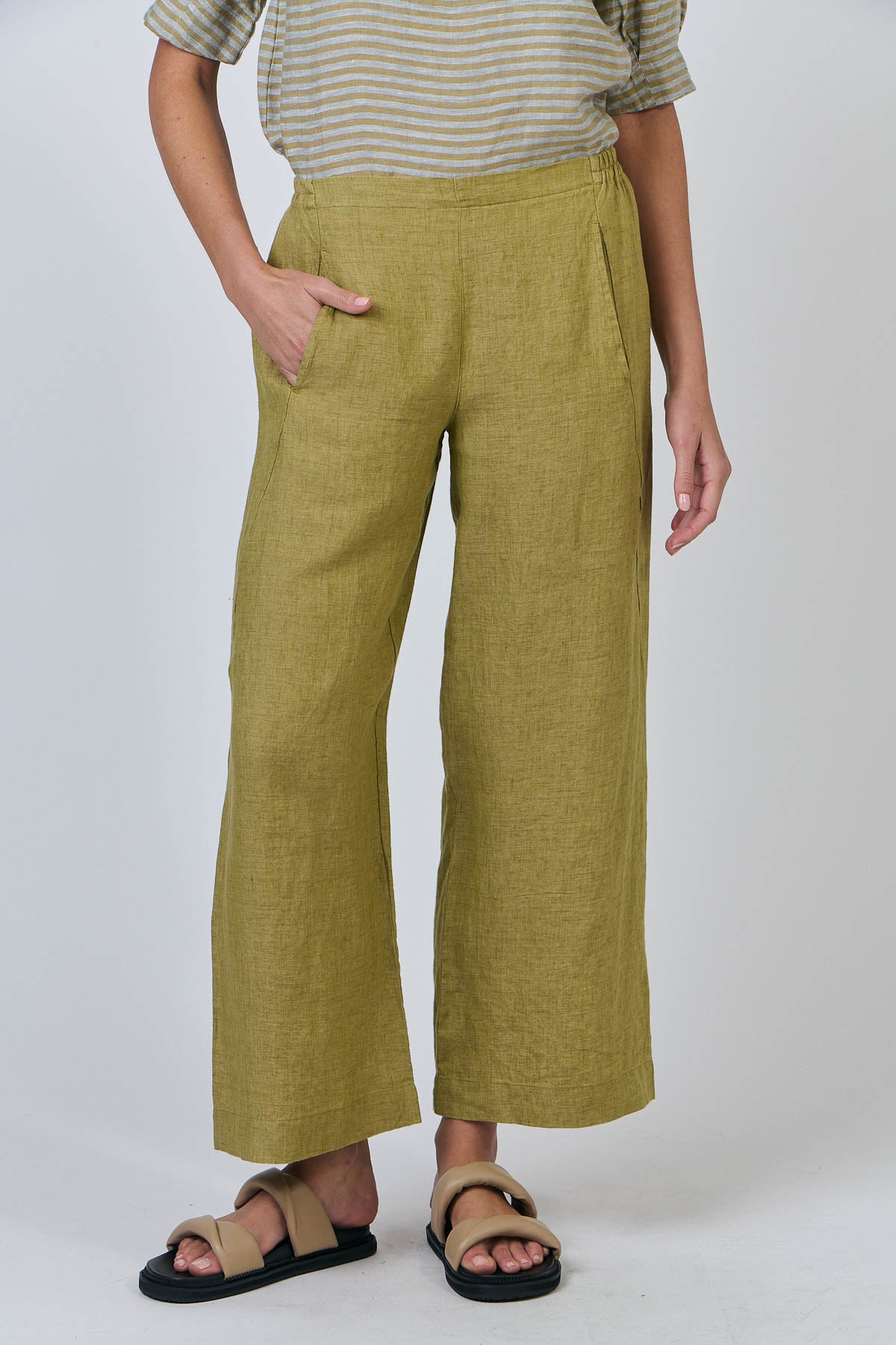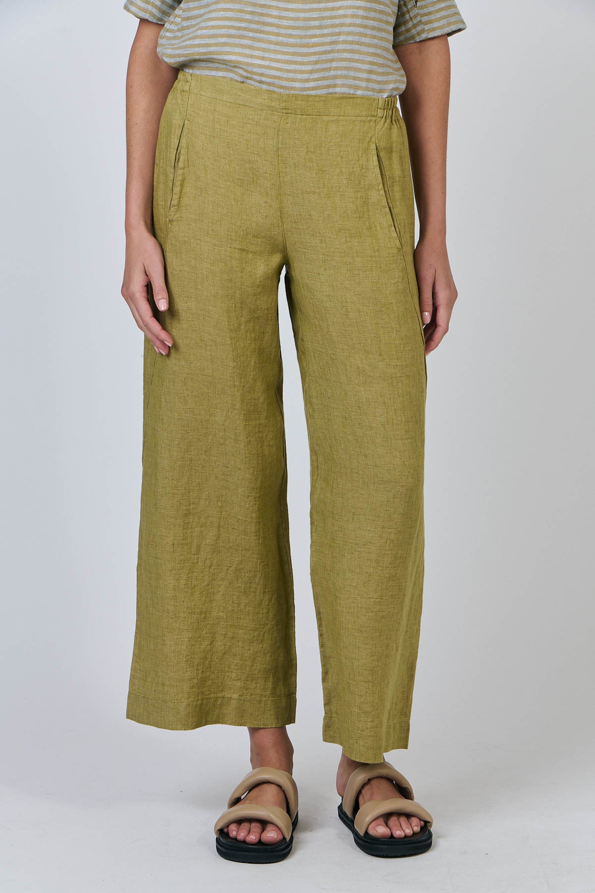A full-length, wide-leg pant featuring two front pockets. Made from 100% breathable linen, this is a tailored look that pairs with just about anything, from a cosy sweater to a loose-fitting shirt. Gathered detailing at the back waistband offers an ultra-flattering design.