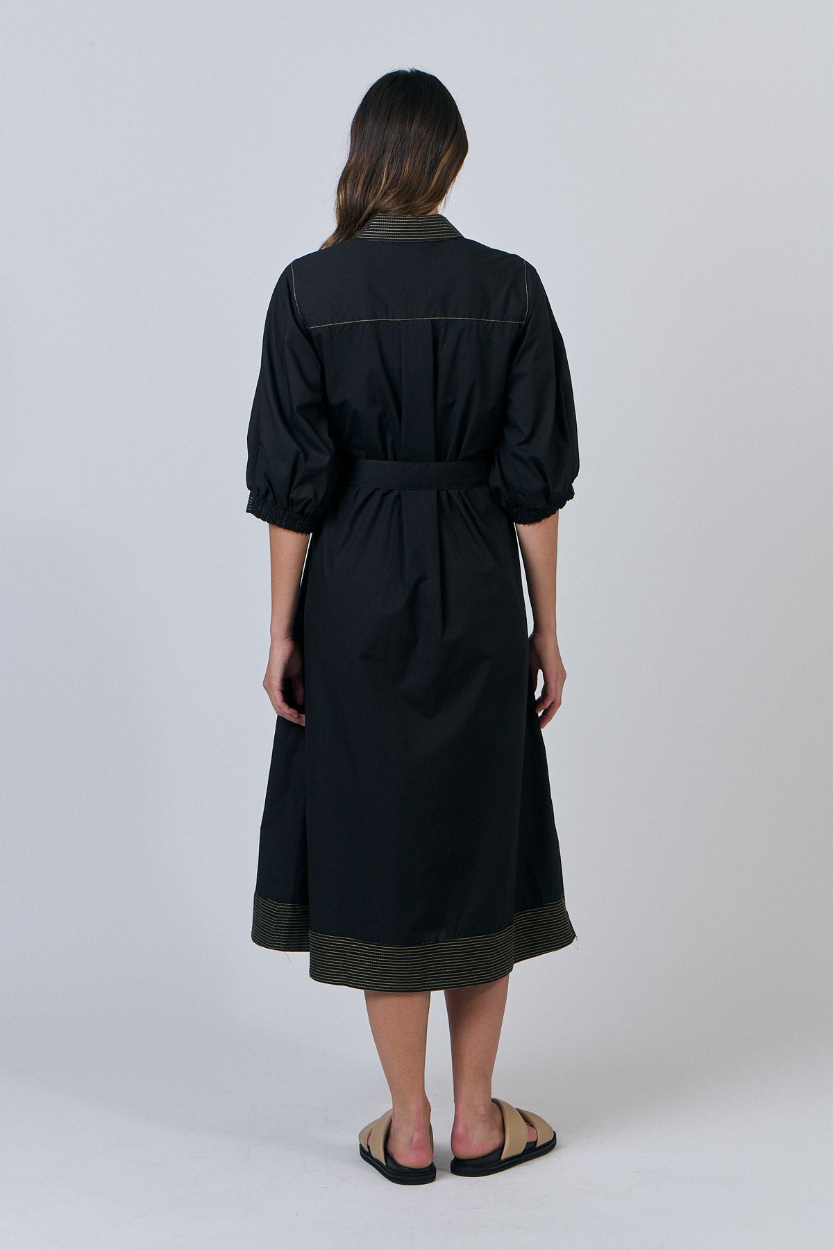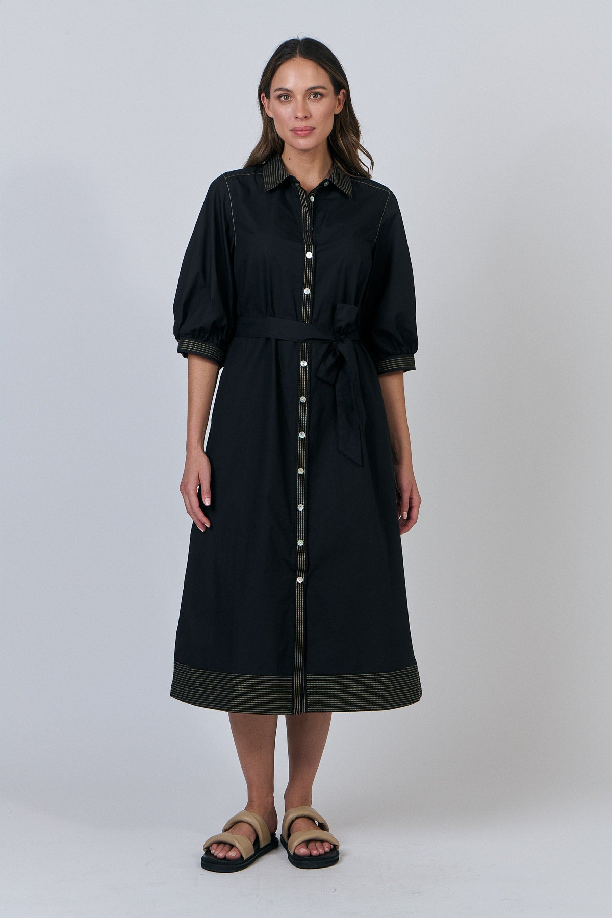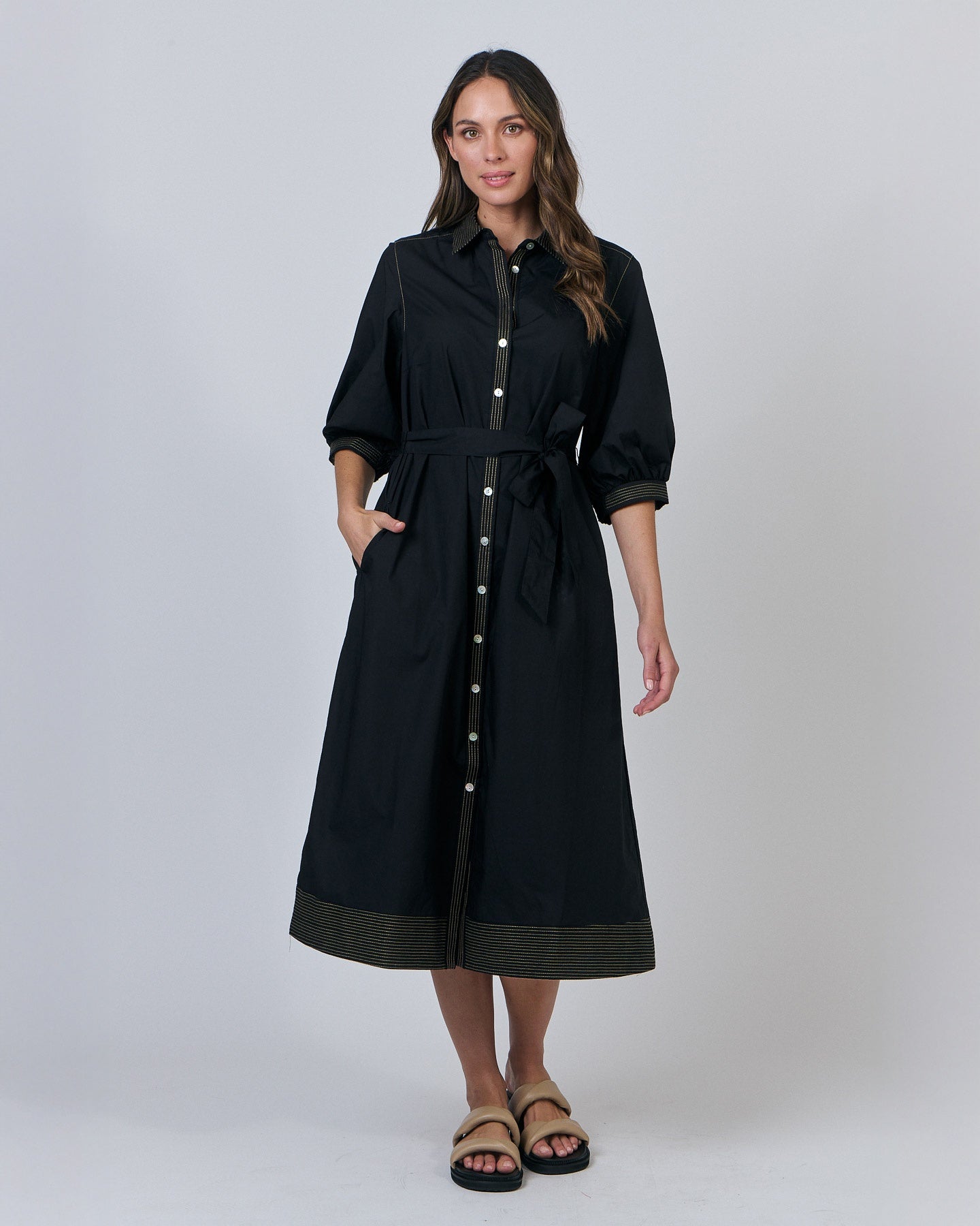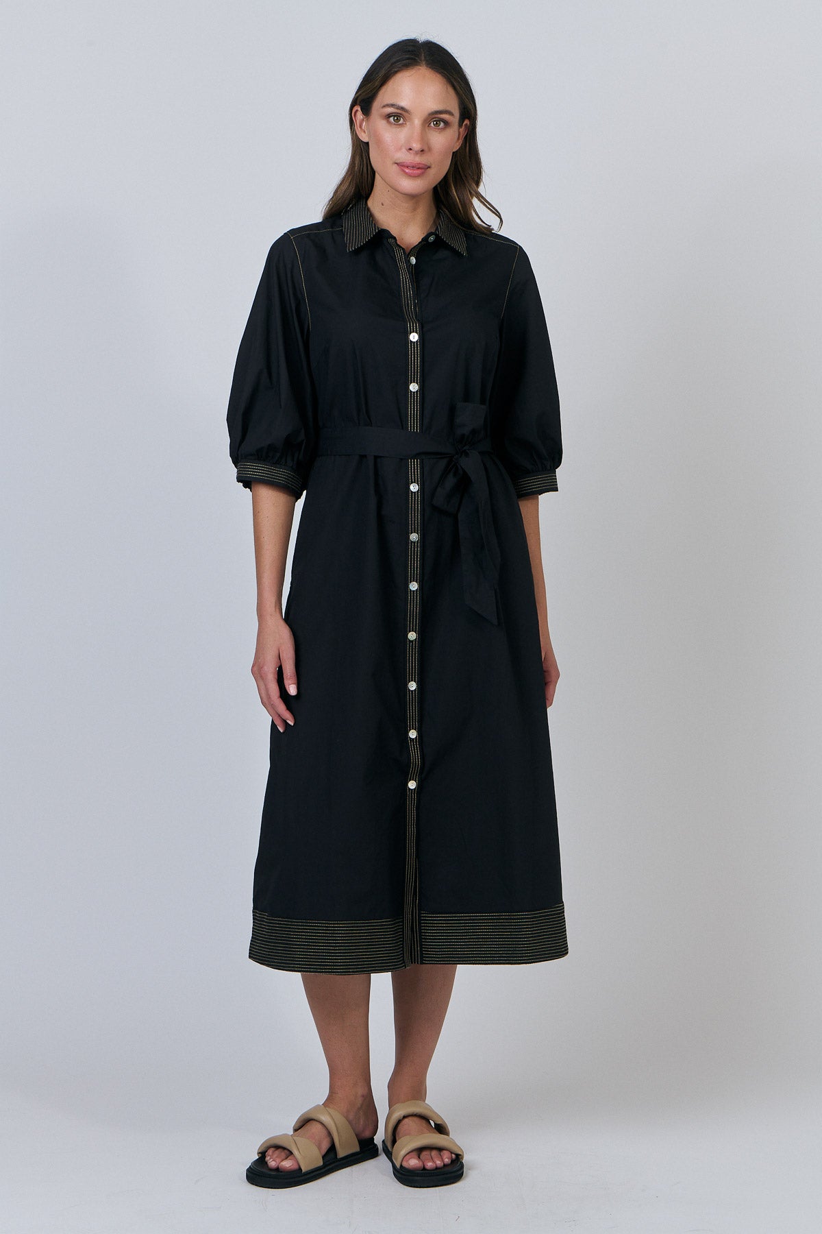 Tie it your way—this midi dress lets you define the fit and the moment. Featuring elegant three-quarter length balloon sleeves with elasticated cuffs, a full button-through design adorned with contrasting topstitching, and practical side pockets for everyday convenience. The structured collar, belted waist, and decorative striped trim along the collar, cuffs and hemline create a polished silhouette that transitions effortlessly from casual daywear to evening elegance. Made from 100% linen.