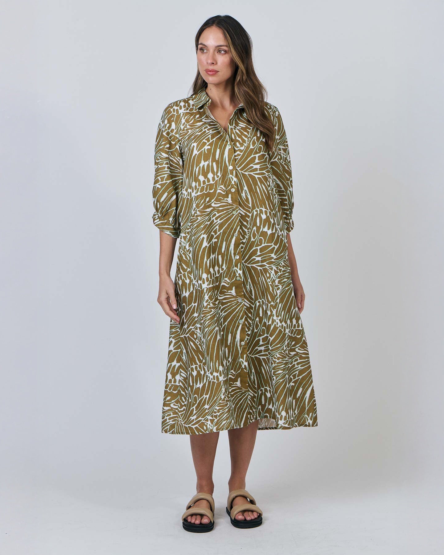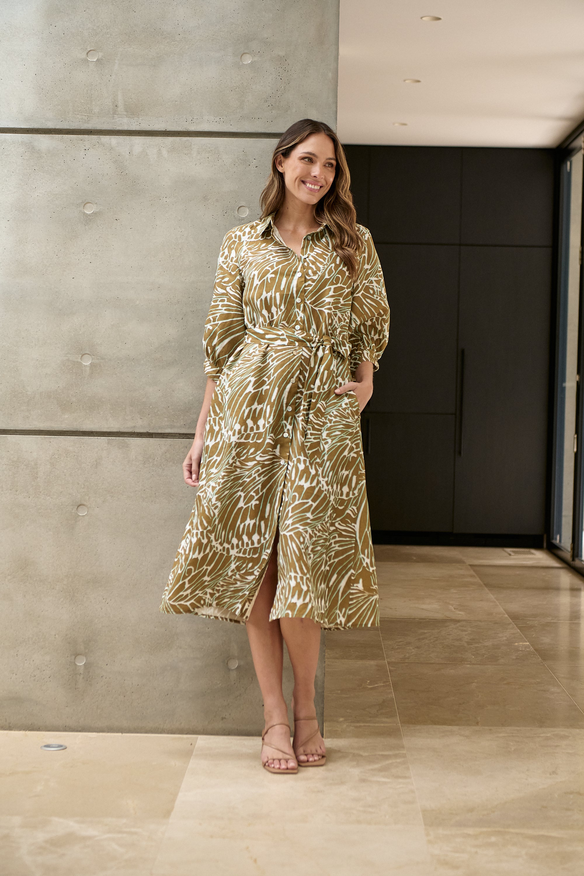 Tie it your way—this midi dress lets you define the fit and the moment. Featuring elegant three-quarter length balloon sleeves with elasticated cuffs, a full button-through design adorned with contrasting topstitching, and practical side pockets for everyday convenience. The structured collar, belted waist, and decorative striped trim along the collar, cuffs and hemline create a polished silhouette that transitions effortlessly from casual daywear to evening elegance. Made from 100% linen.