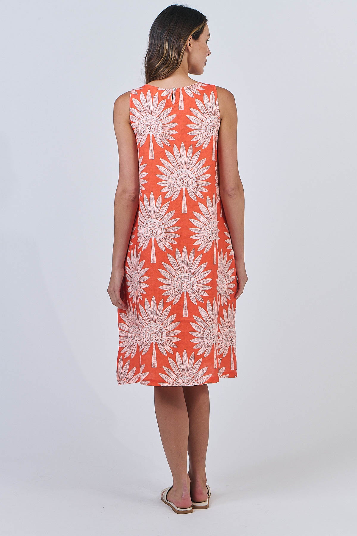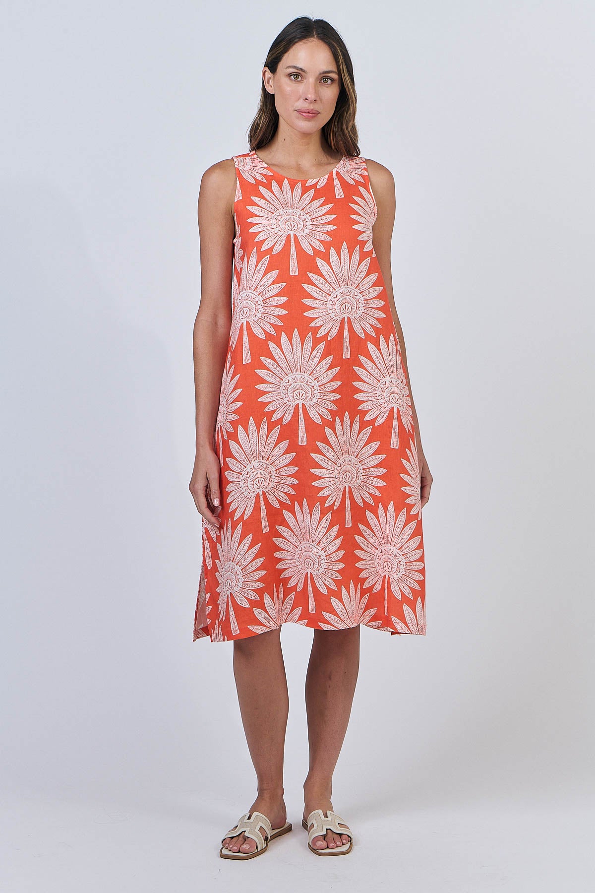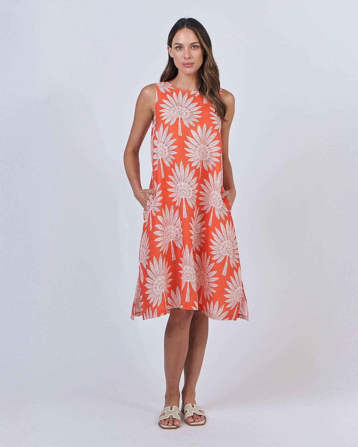 Wear the season in full bloom with this light-as-air printed dress. Crafted from 100% linen, it features a relaxed A-line silhouette with a round neckline and sleeveless design, perfect for effortless elegance on warmer days. The practical side pockets add functionality to this sophisticated piece, which transitions seamlessly from day to evening with its knee-length hemline and subtle side slits.