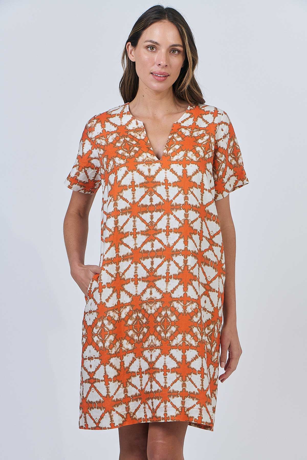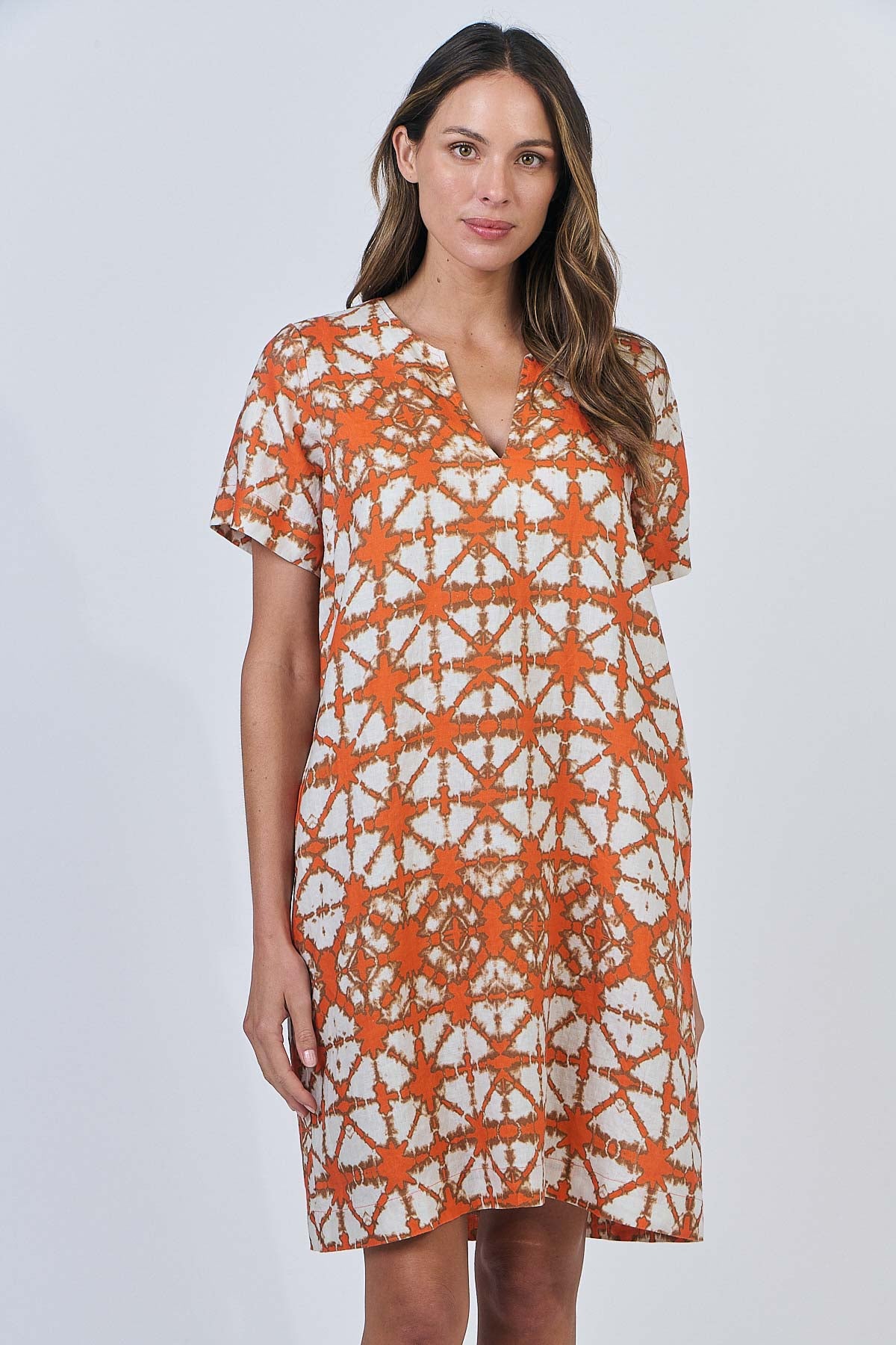 Slip into this dress that feels like a vacation, no plane ticket required. Crafted from 100% linen, the elegant tunic silhouette features a distinctive V-neckline with decorative stitching that frames your face beautifully, while practical side pockets add everyday functionality. The relaxed fit and knee-length cut create an effortlessly sophisticated look that pairs perfectly with sandals or heels, depending on your destination.