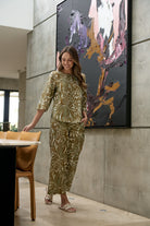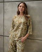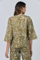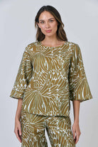 Solve your "nothing to wear" dilemmas with this blouse, featuring an elegant round neckline and versatile three-quarter length sleeves with a subtle flare at the cuffs. Crafted from 100% linen, this printed piece offers a feminine silhouette enhanced by a discreet button closure at the back. The straight-cut hem pairs perfectly with the coordinating wide-leg trousers for a polished ensemble, offering exceptional versatility that makes getting dressed a breeze — no matter the occasion.