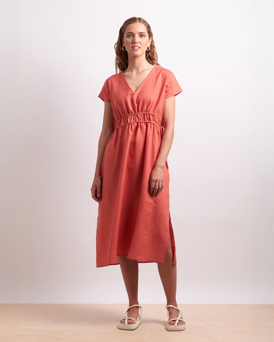 The Drawn In Dress is crafted from 100% Linen. A drawstring at the empire waist pulls in the relaxed silhouette, while the V neckline and short sleeves keep it breezy. A keyhole tie back and side pockets add thoughtful detail. Finished at midi length, it’s an everyday style with built-in softness and shape.