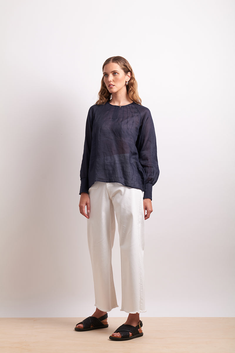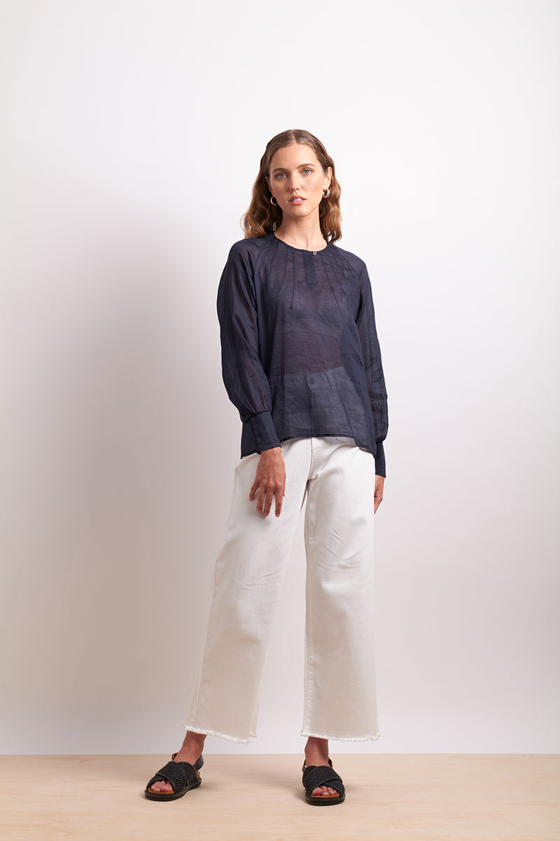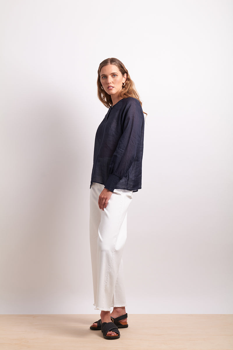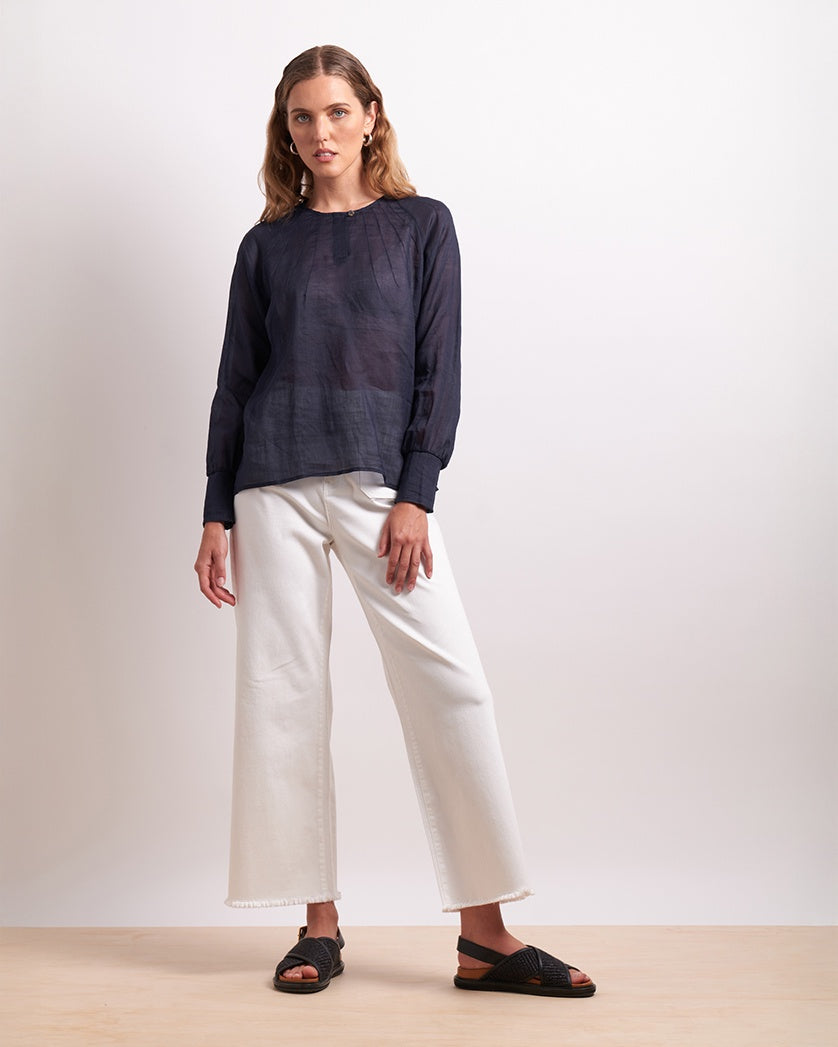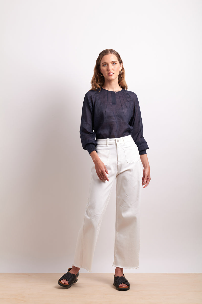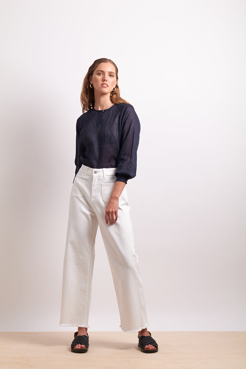 The Gigi Jean is a trendy style with a little bit of edge. Crafted from a lightweight denim with stretch, this high-waisted silhouette has wide legs and a zip front fly with button. It features front patch pockets, and a raw frayed hem to create a versatile jean that can be worn in casual or dressier settings.