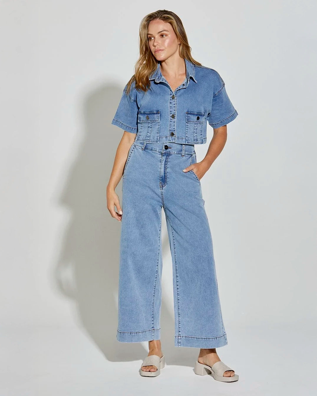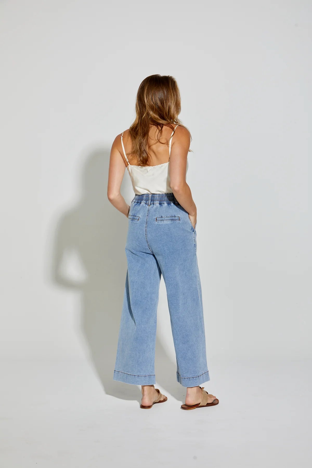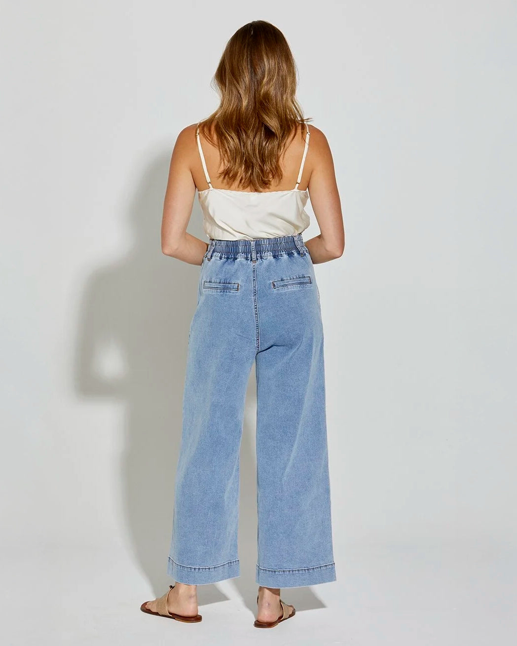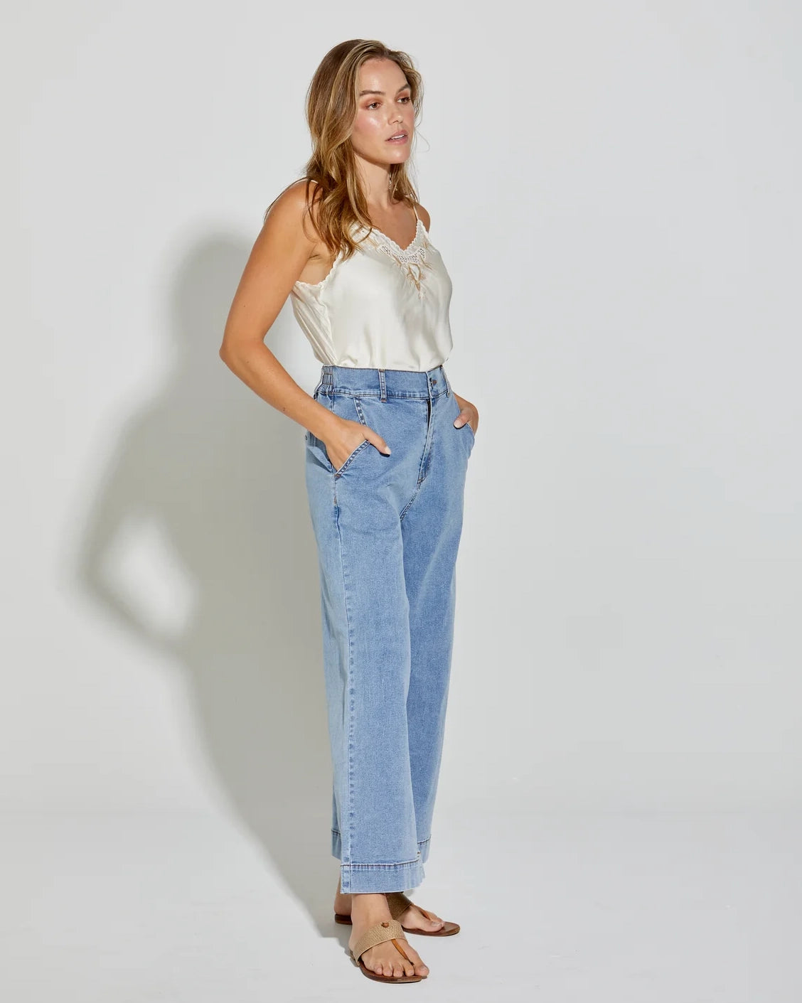 A modern take on vintage-inspired denim, the Palazzo Jean by New London features a flattering high-rise waist and flowing wide-leg silhouette. Crafted in soft two-way stretch denim for all-day comfort, this ankle-length style offers just the right amount of structure with an effortlessly relaxed finish. Finished in a versatile light wash that pairs beautifully with everything from crisp shirts to soft knits.