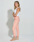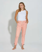 On trend soft handle comfy tracky style with a cool black and white New London jean tab at bottom hem.