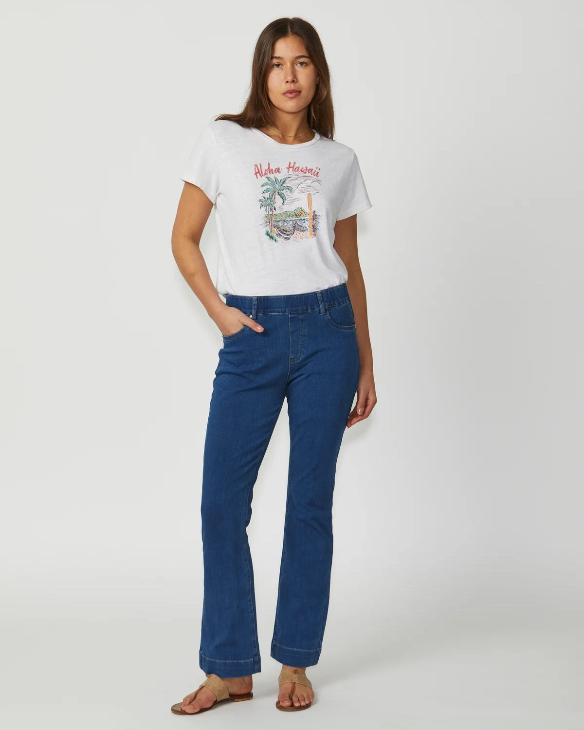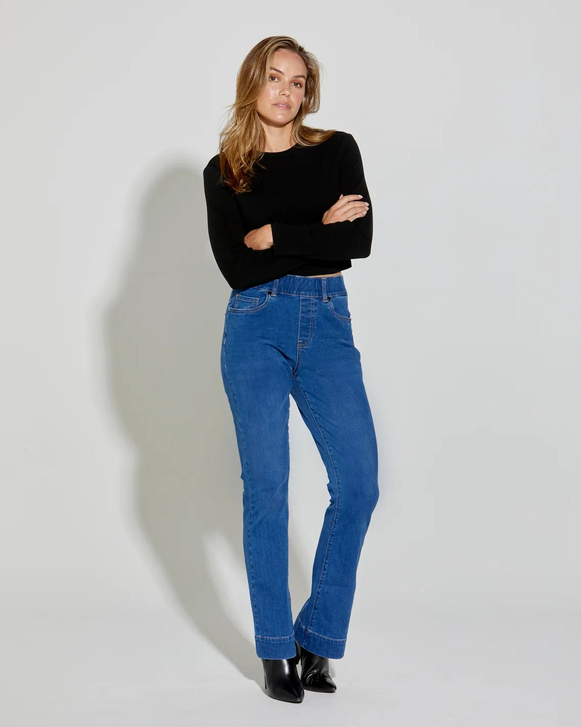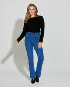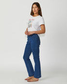 The Olympia Flare Jean offers a high-rise, mid-flare fit with a flattering pull-on design. Made from 4-way stretch denim, these jeans provide ultimate comfort and flexibility for a sleek, stylish look.